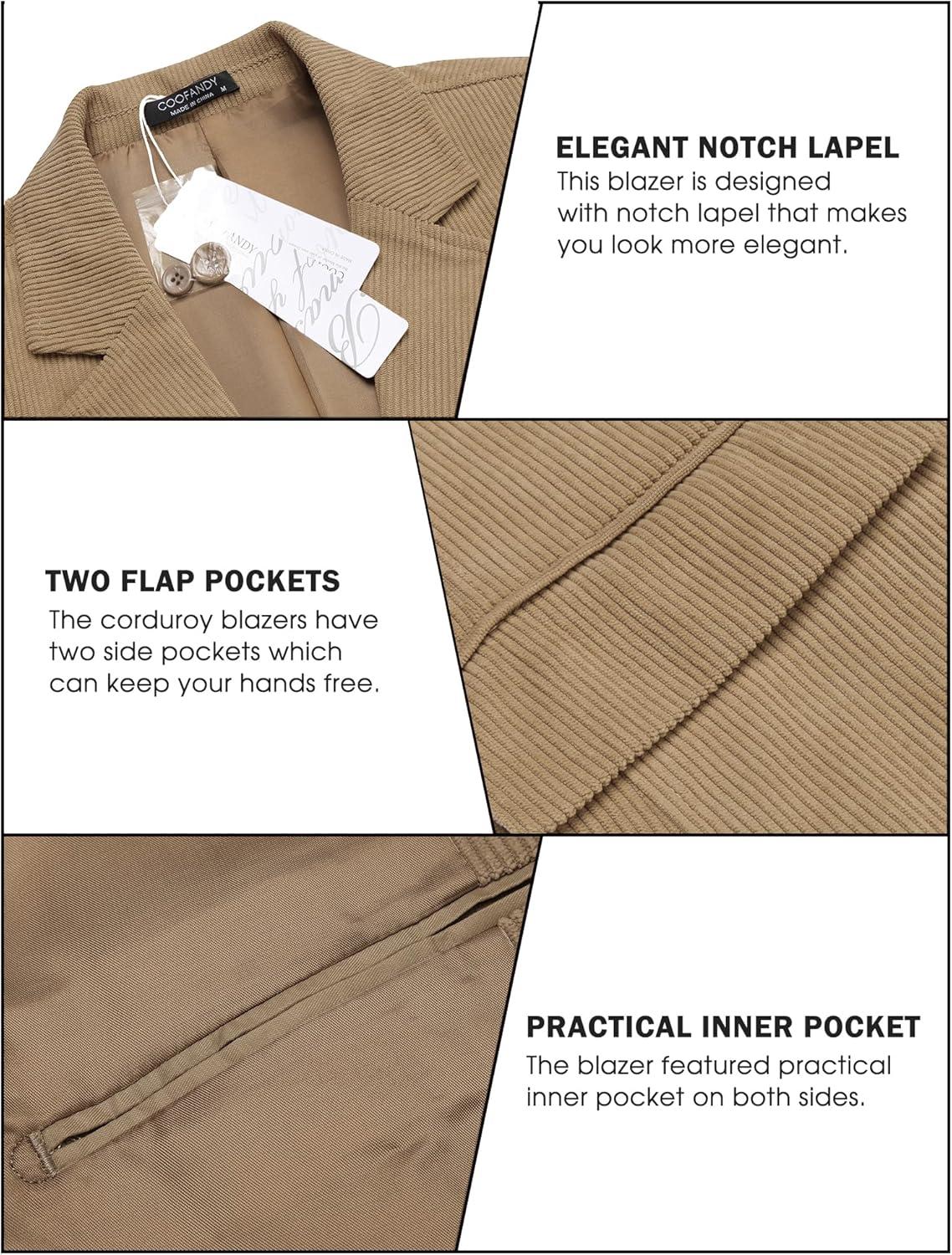 COOFADNY Men’s Casual Corduroy Blazer Classic Fit Two Button Sport Coat Fashion Notch Lapel Blazer Jacket(Coffee)