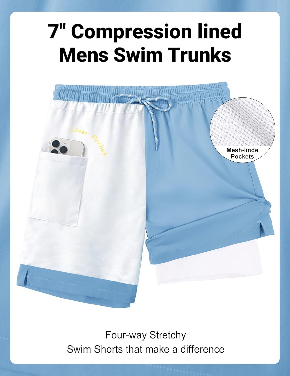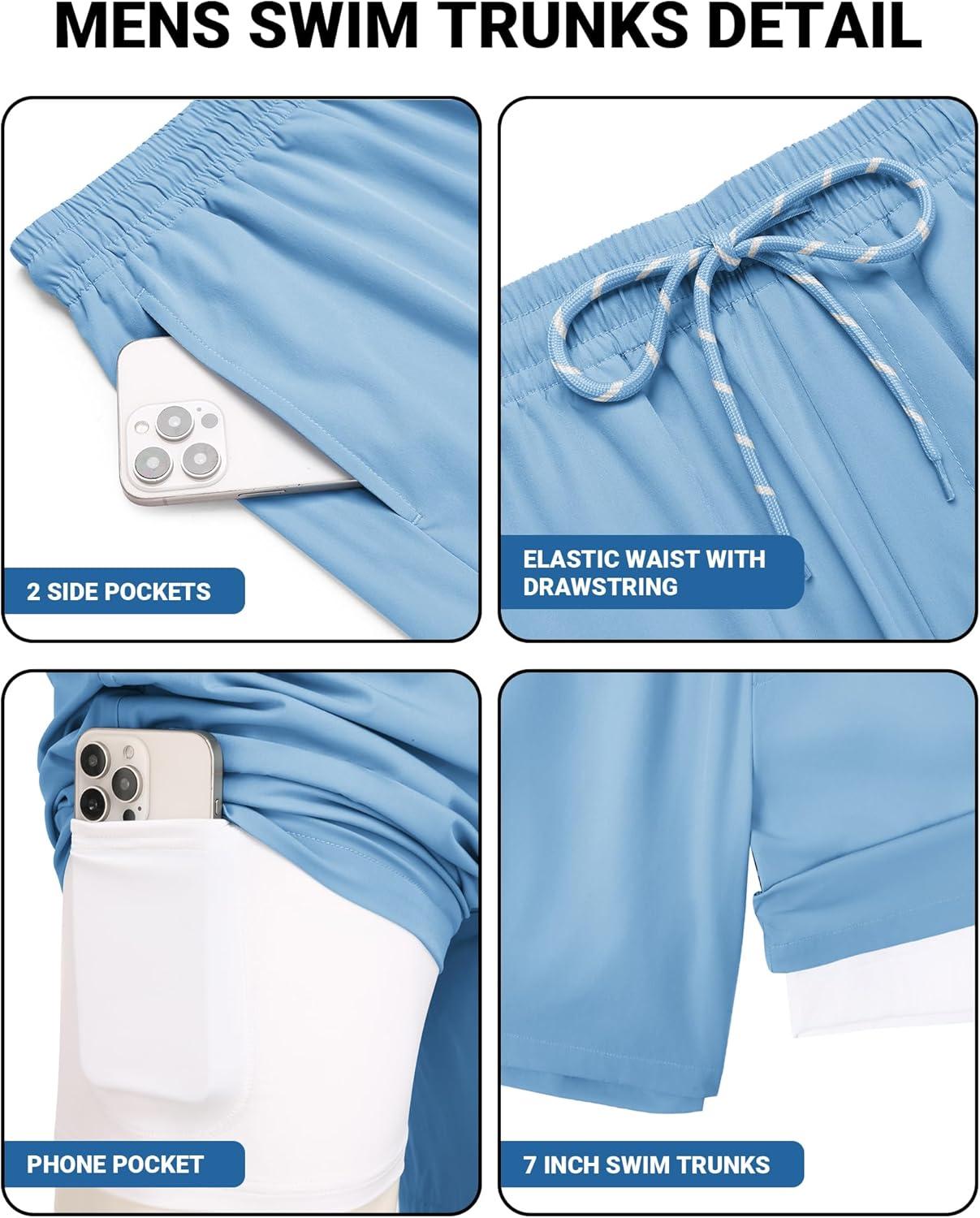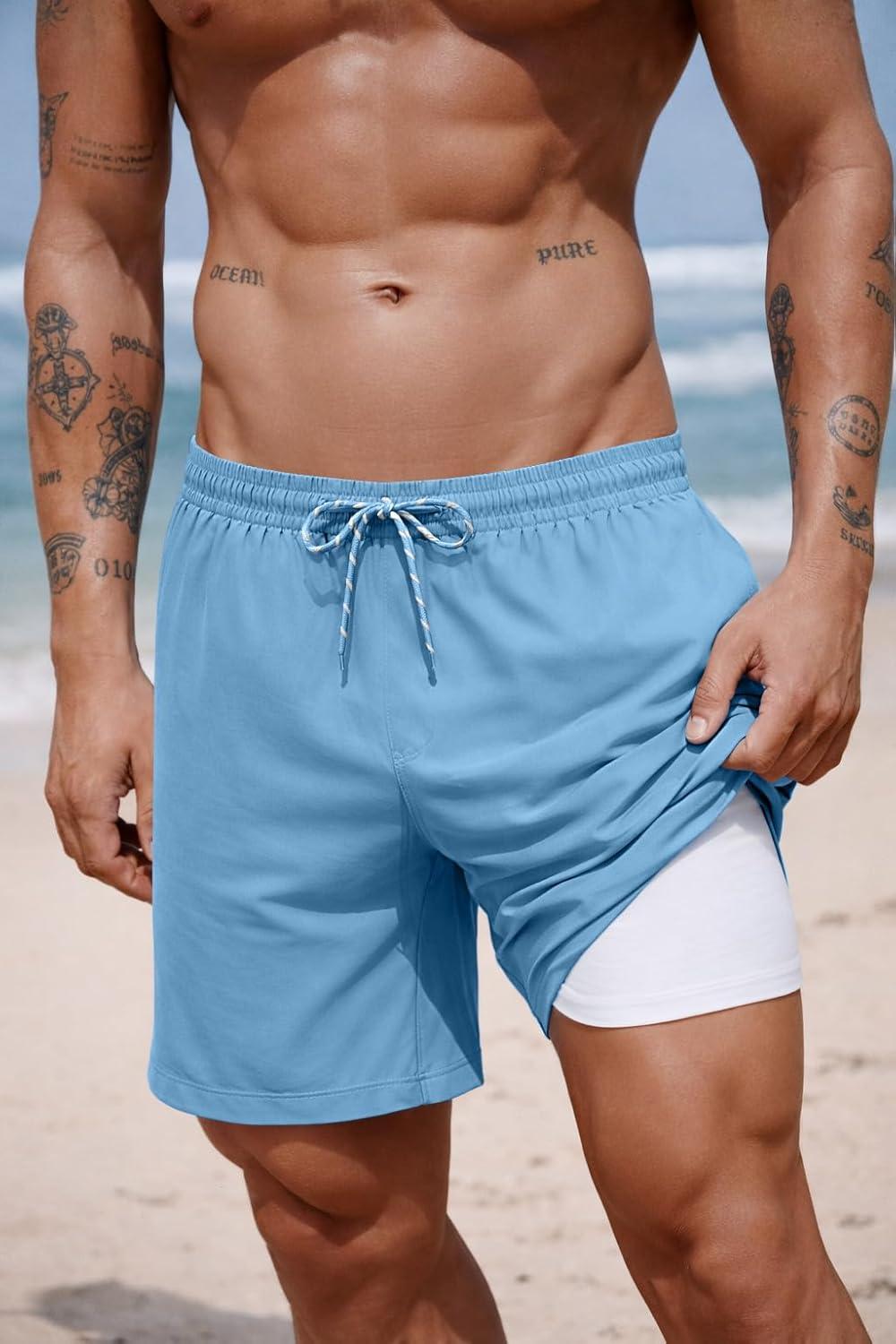 COOFANDY 2 in 1 Mens Swim Trunks 7 Inch Quick Dry Board Shorts Beach Swim Shorts Bathing Suit with Compression Liner(Light Blue)