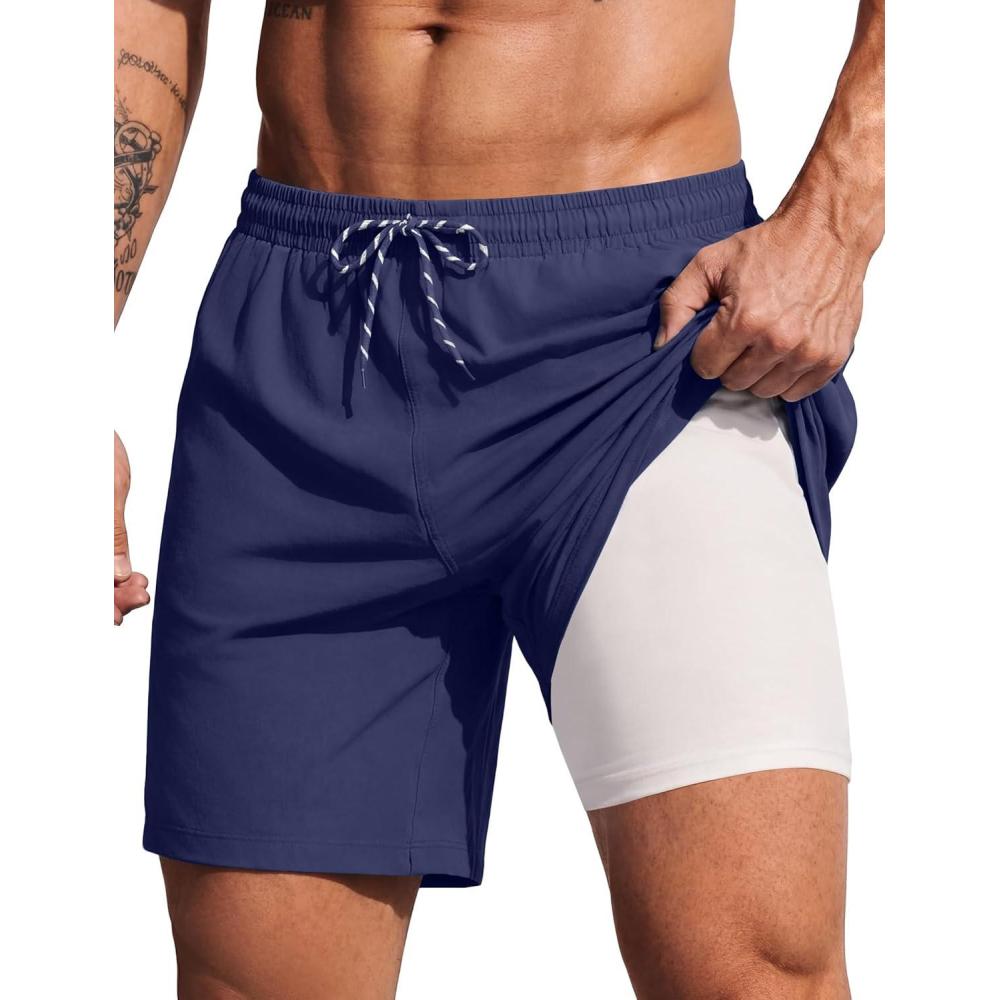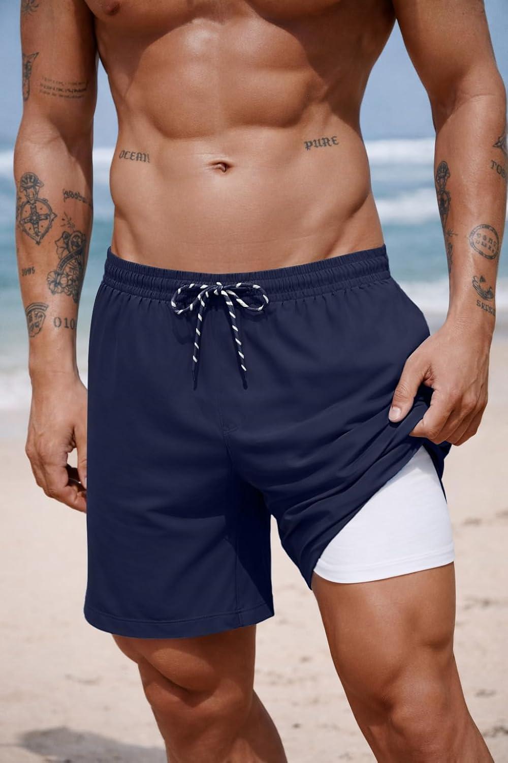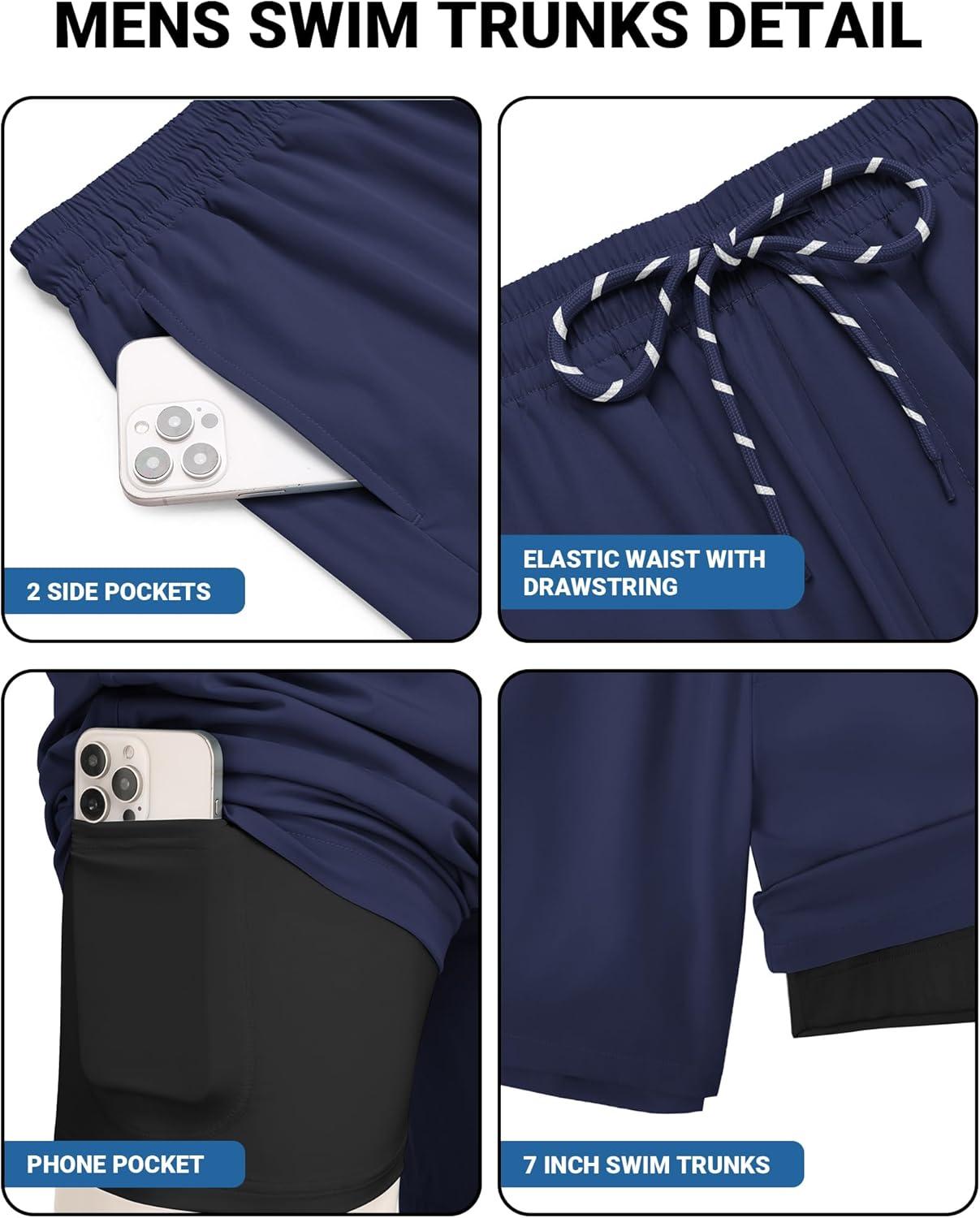 COOFANDY 2 in 1 Mens Swim Trunks 7 Inch Quick Dry Board Shorts Beach Swim Shorts Bathing Suit with Compression Liner(Navy Bule)