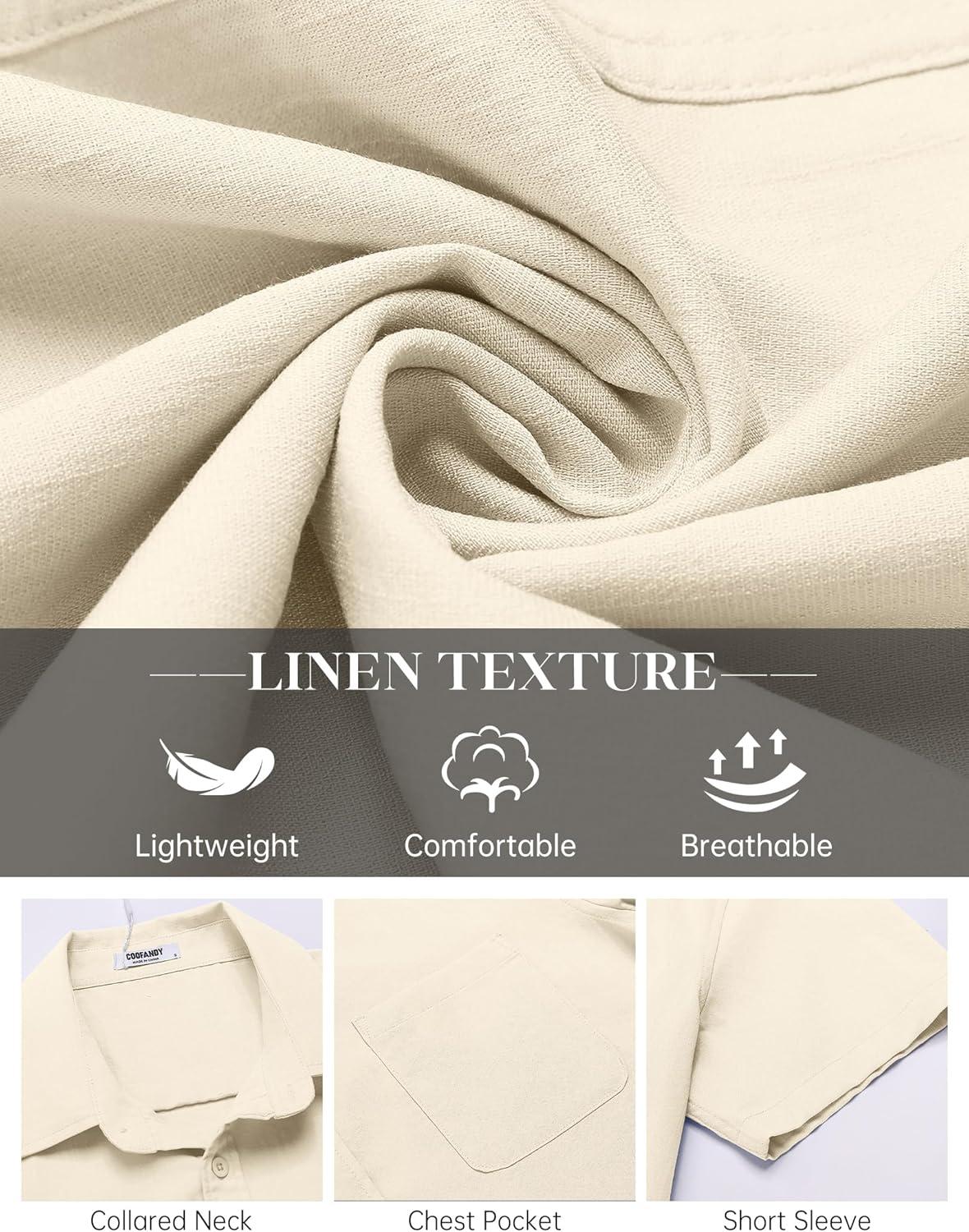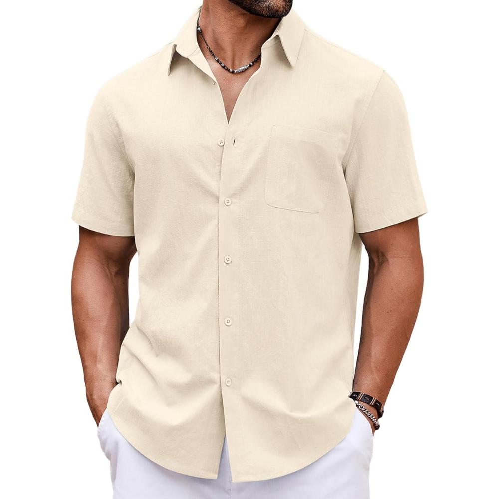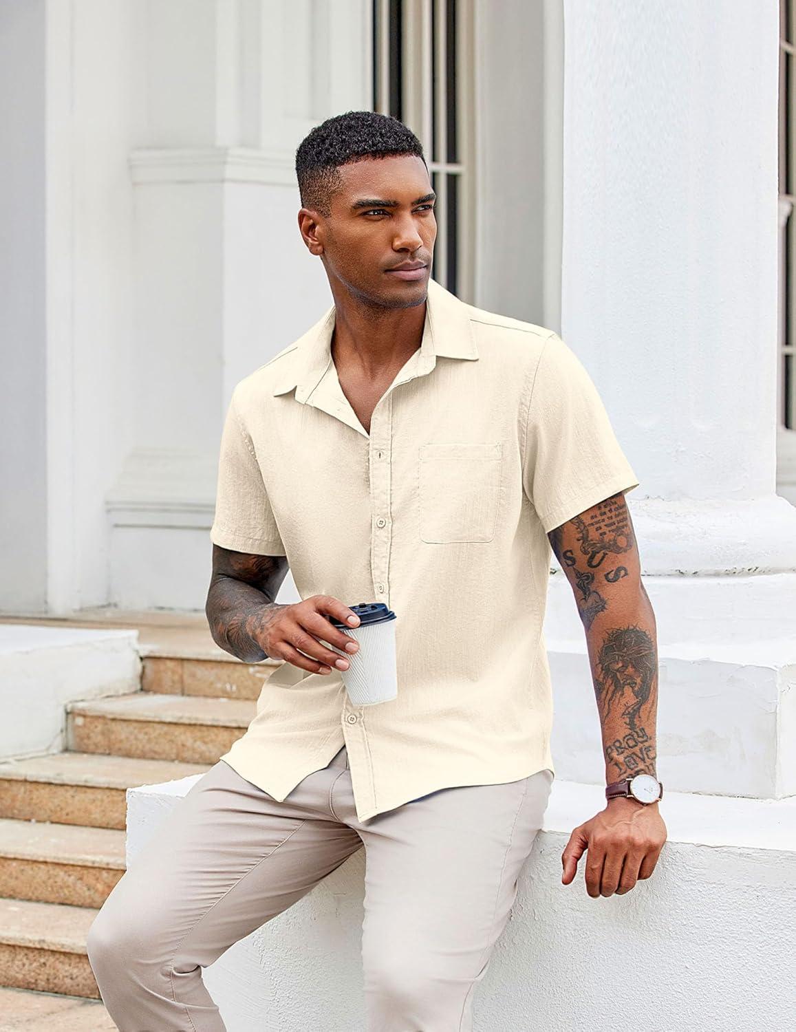 COOFANDY Button Down Shirt for Men Short Sleeve Casual Shirt Summer Beach Vacation Shirt with Pocket(Beige)