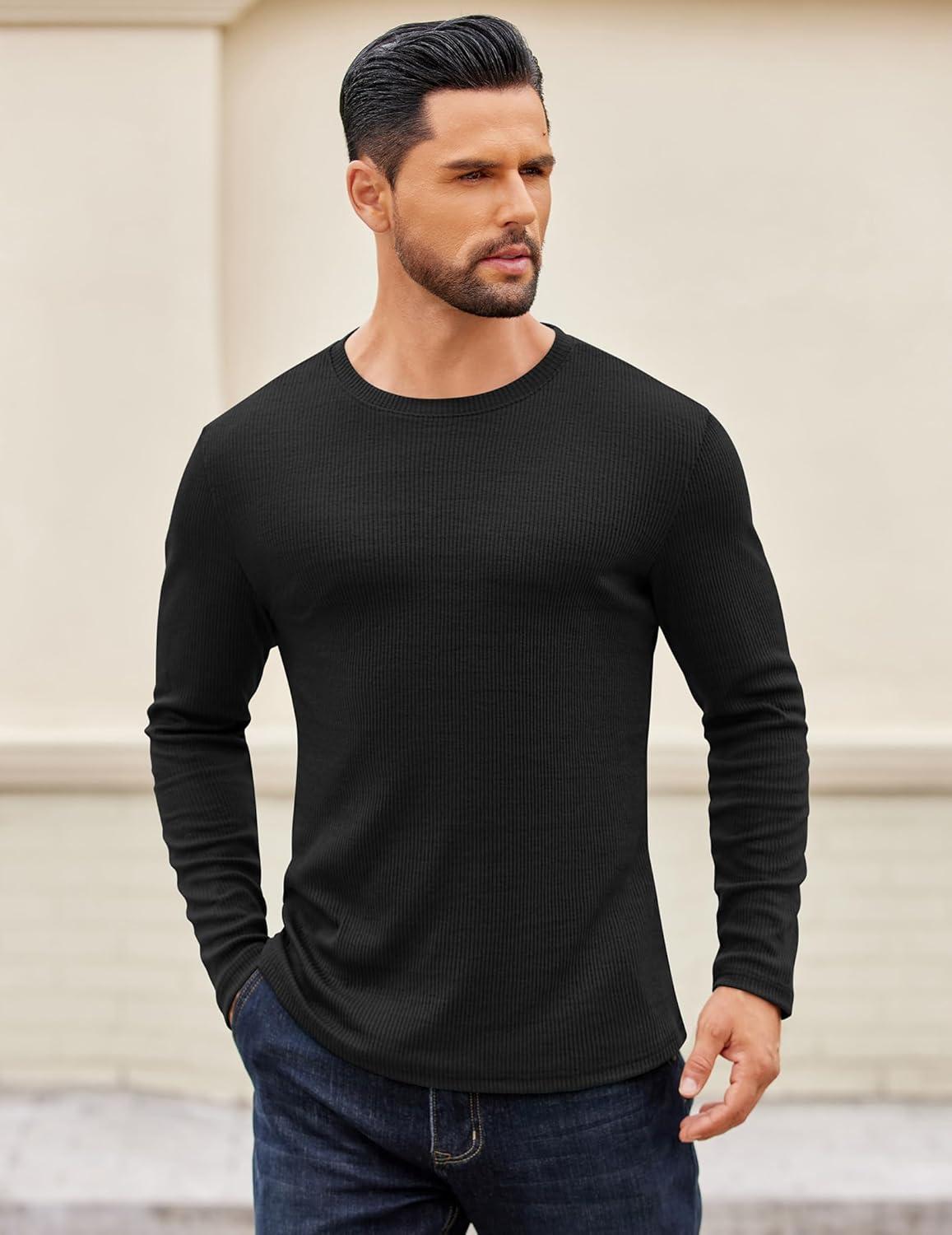 COOFANDY Crewneck Sweaters for Men Slim Fit Long Sleeve Pullover Sweater Ribbed Knitted Lightweight Tops(All Black)