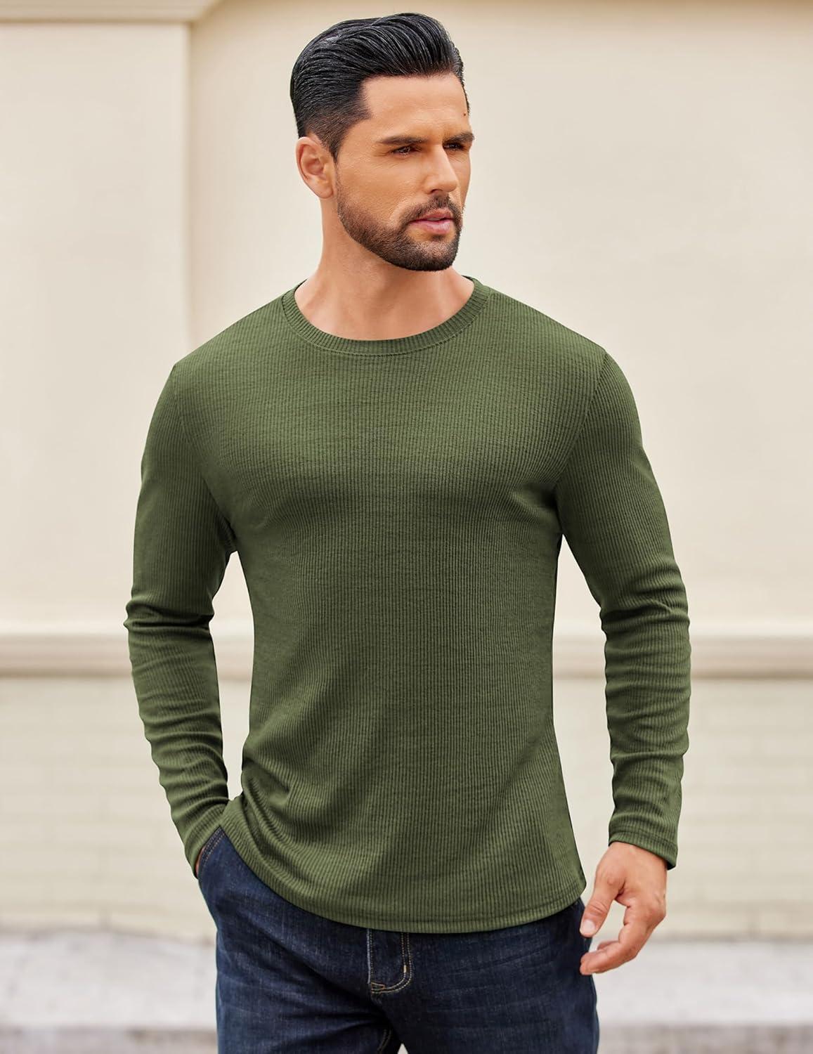 COOFANDY Crewneck Sweaters for Men Slim Fit Long Sleeve Pullover Sweater Ribbed Knitted Lightweight Tops(Army Green)