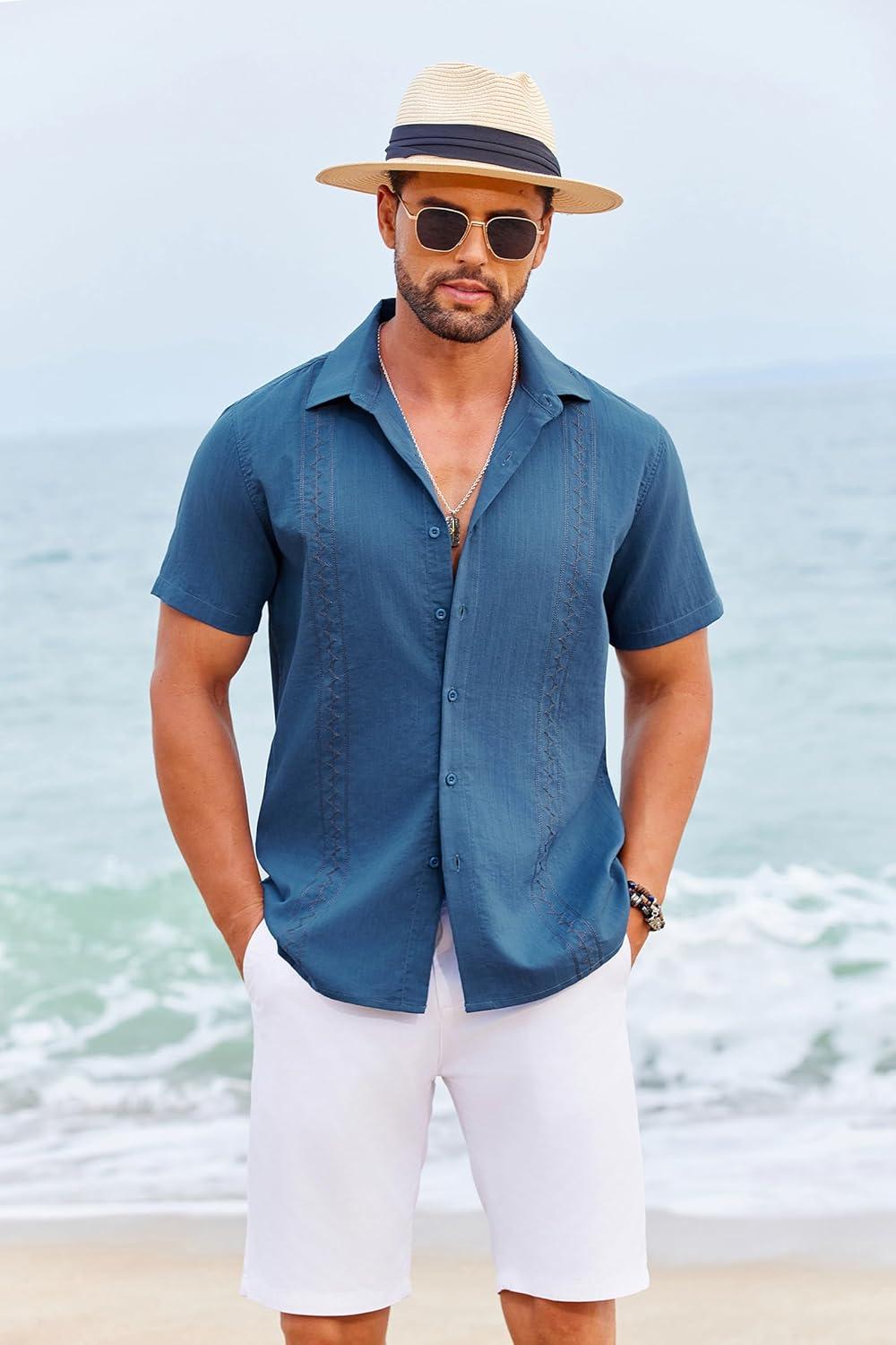 COOFANDY Cuban Guayabera Shirts for Men Short Sleeve Casual Button Down Shirts Summer Vacation Shirts(Navy)