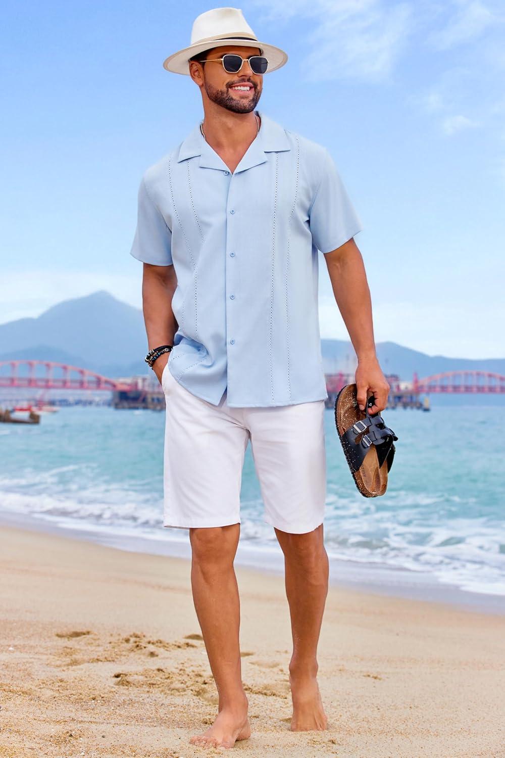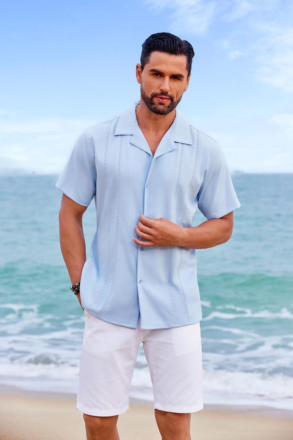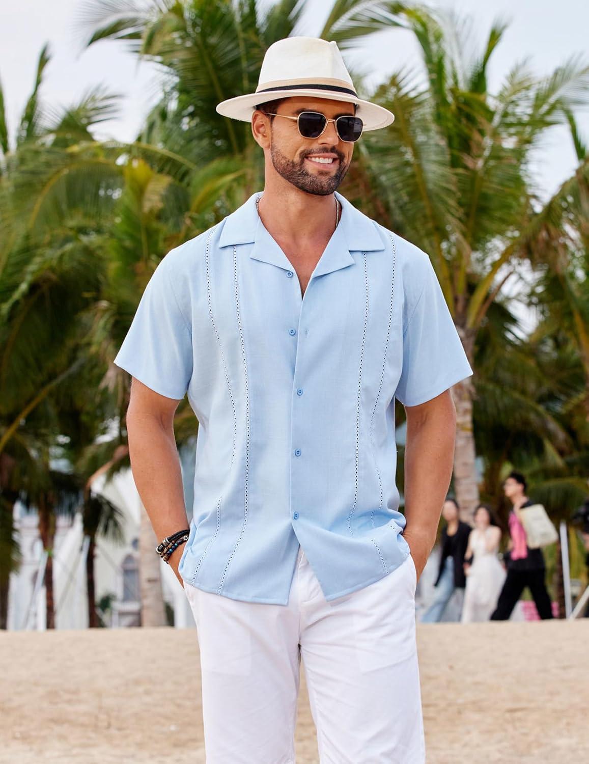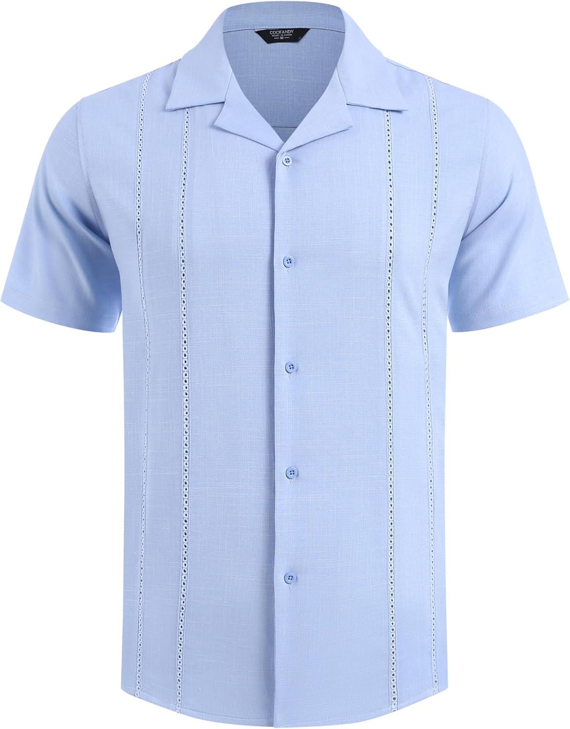 COOFANDY Guayabera Shirts for Men Cuban Short Sleeve Button Down Summer Shirts Linen Shirts(Light Blue)