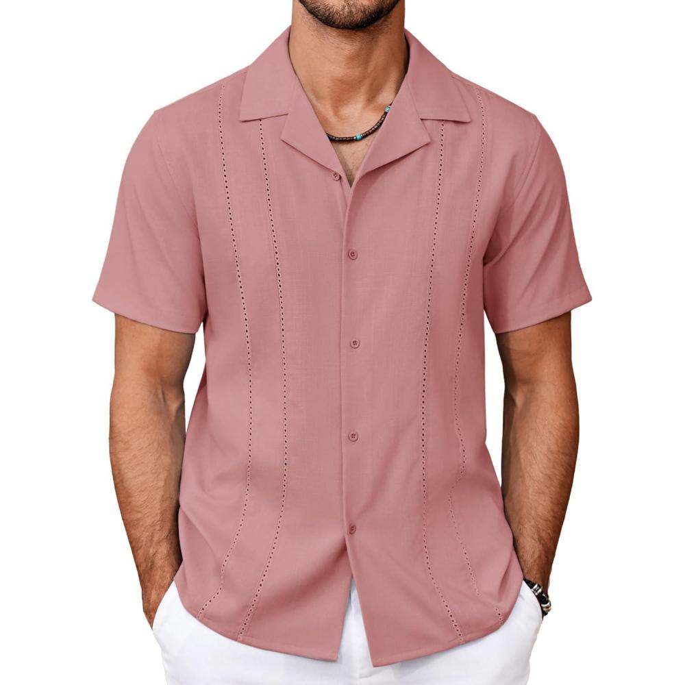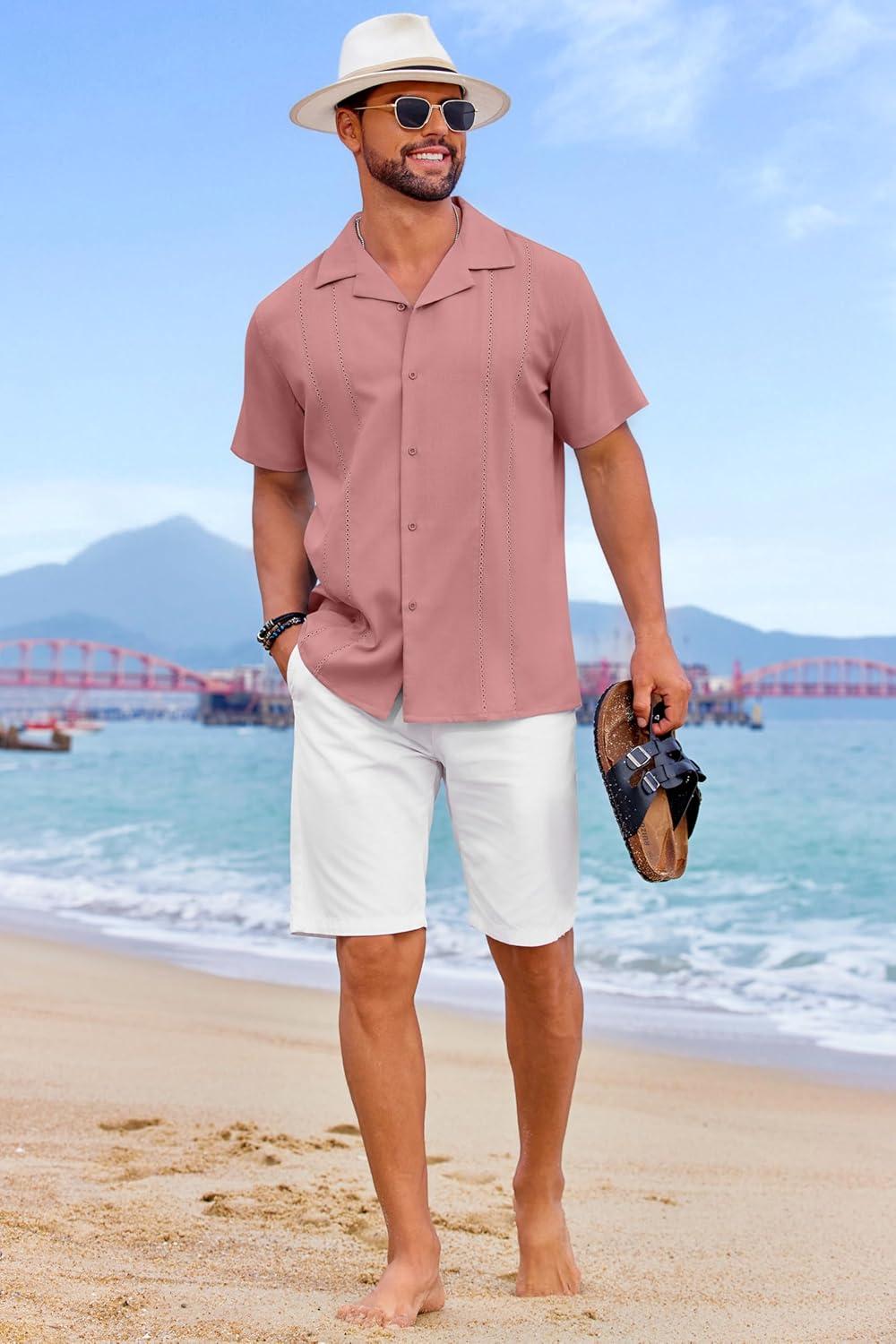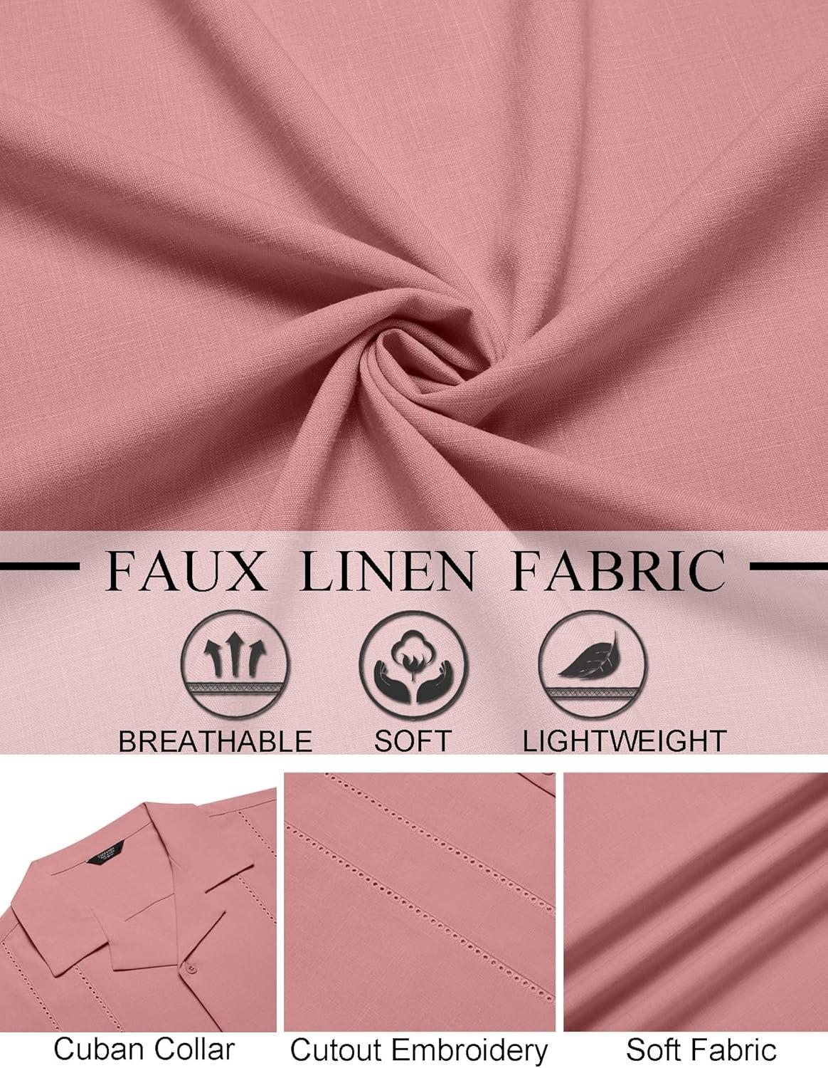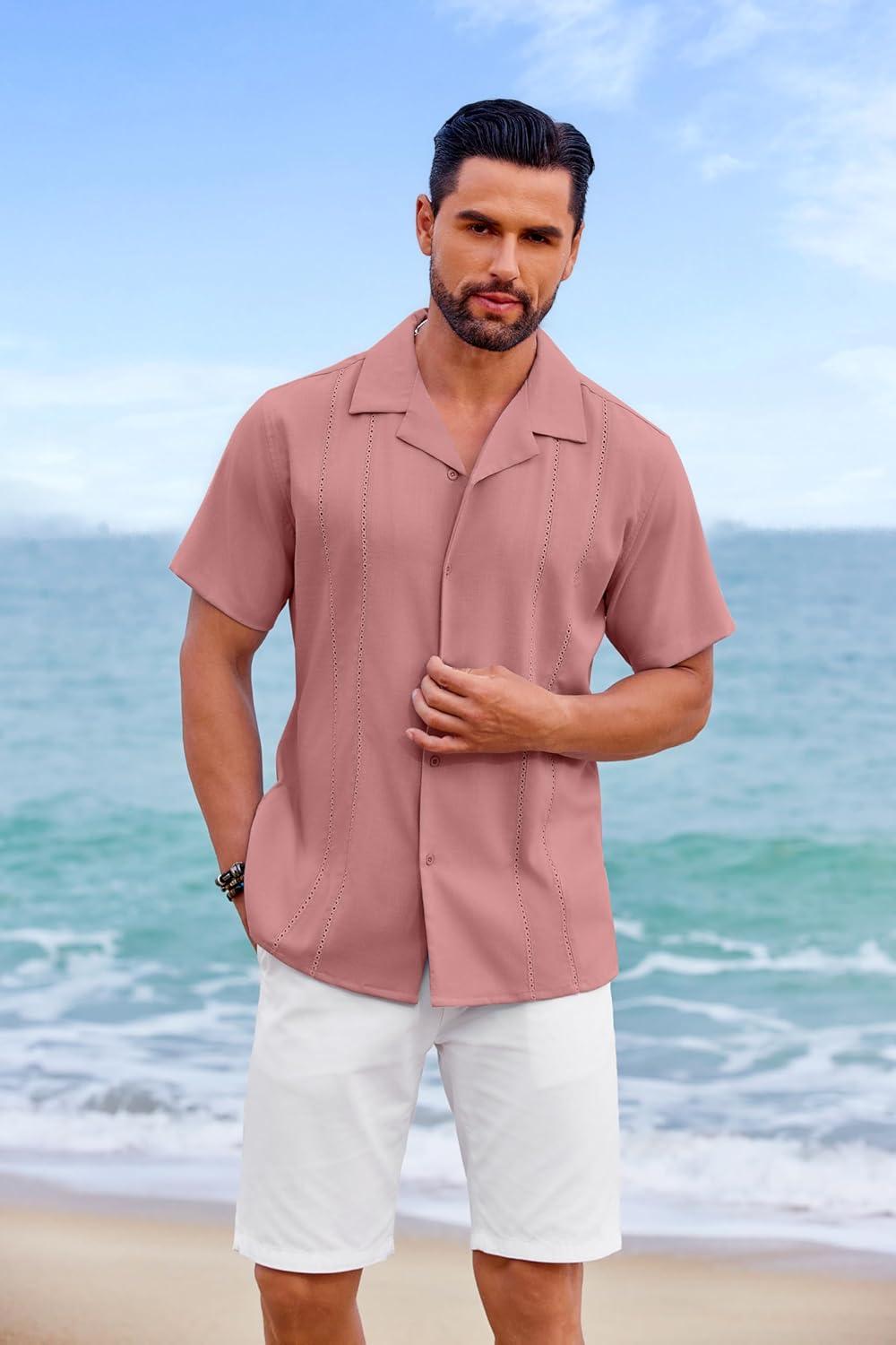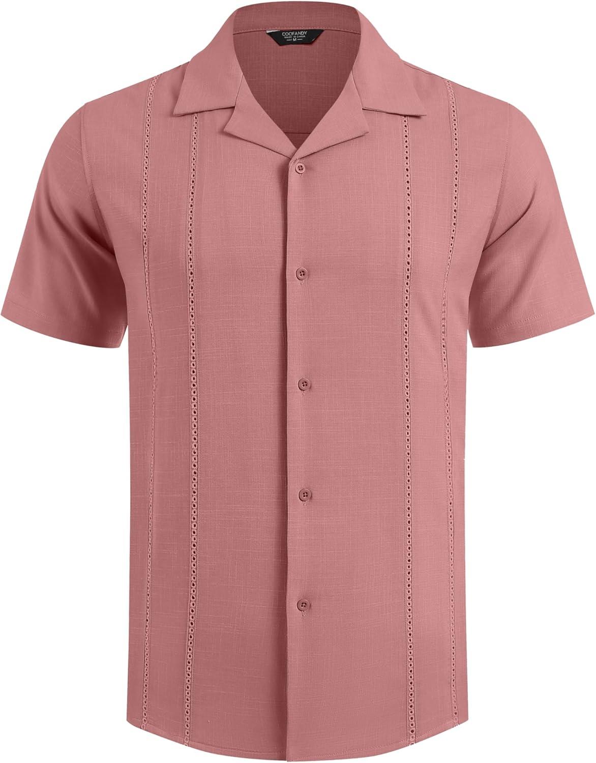COOFANDY Guayabera Shirts for Men Cuban Short Sleeve Button Down Summer Shirts Linen Shirts(Pink)