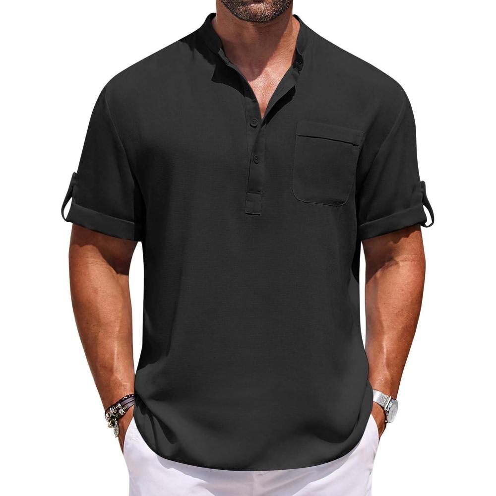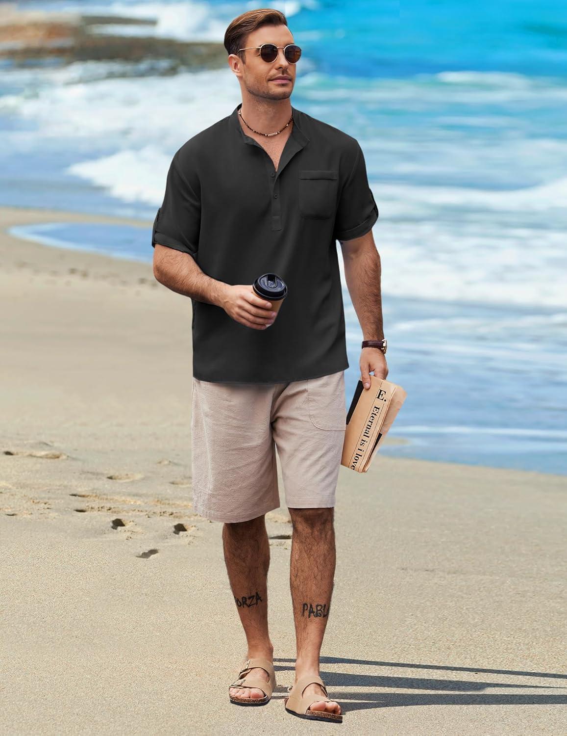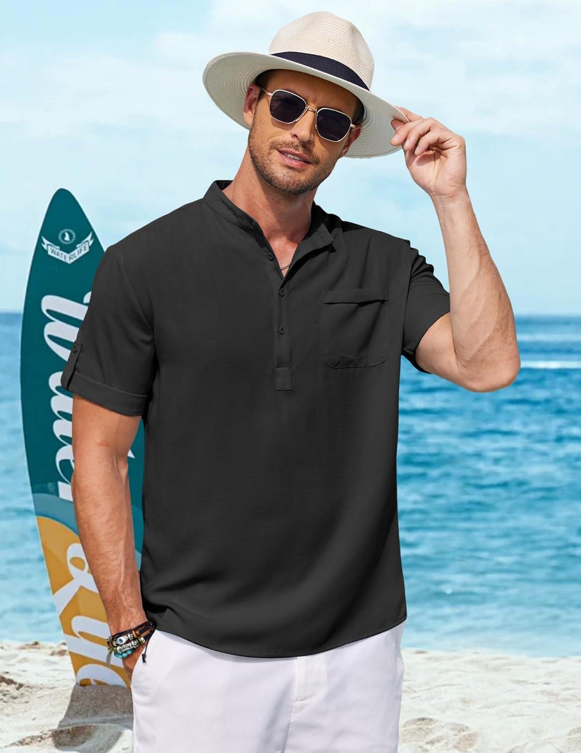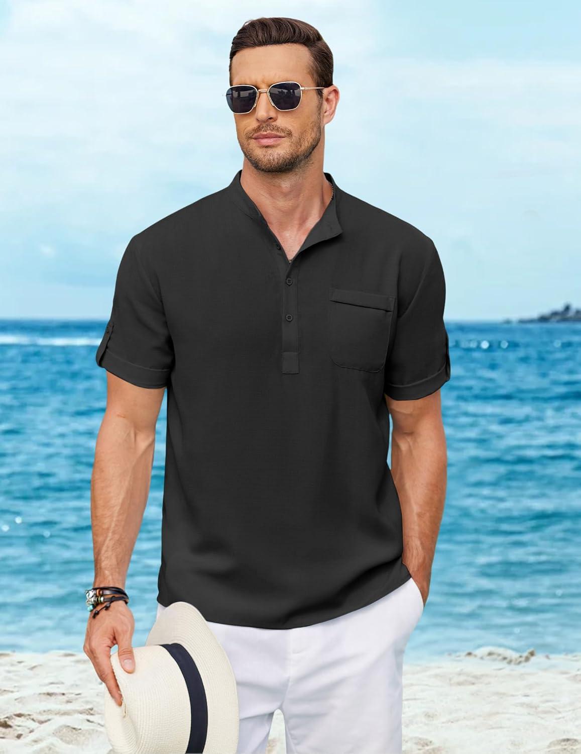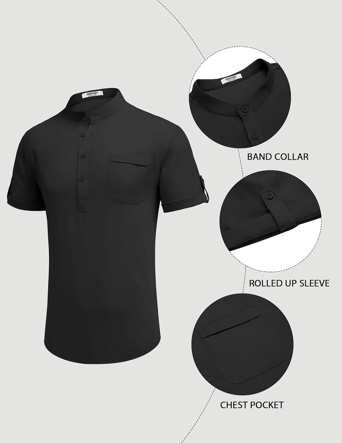 Get up to 60% off on COOFANDY Henley Shirts for Men Short Sleeve Band Collar Casual Shirt Summer Hippie Vacation Beach T Shirts with Pocket(Black) styles during our winter sale event.