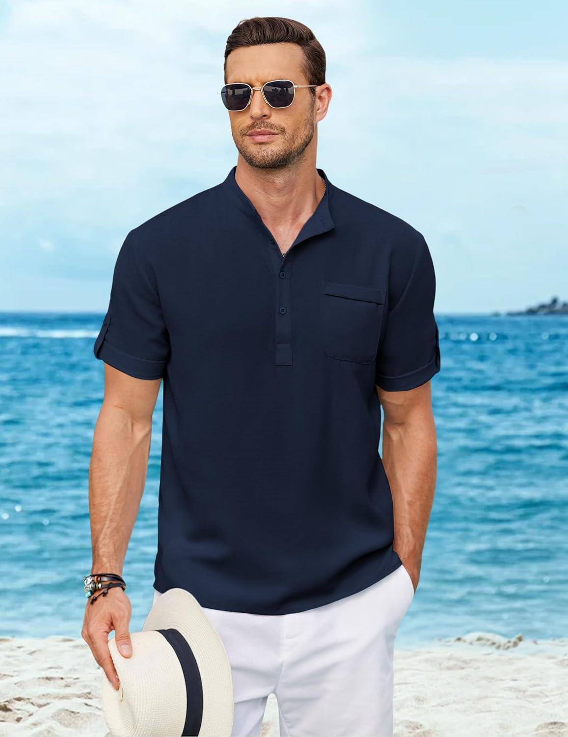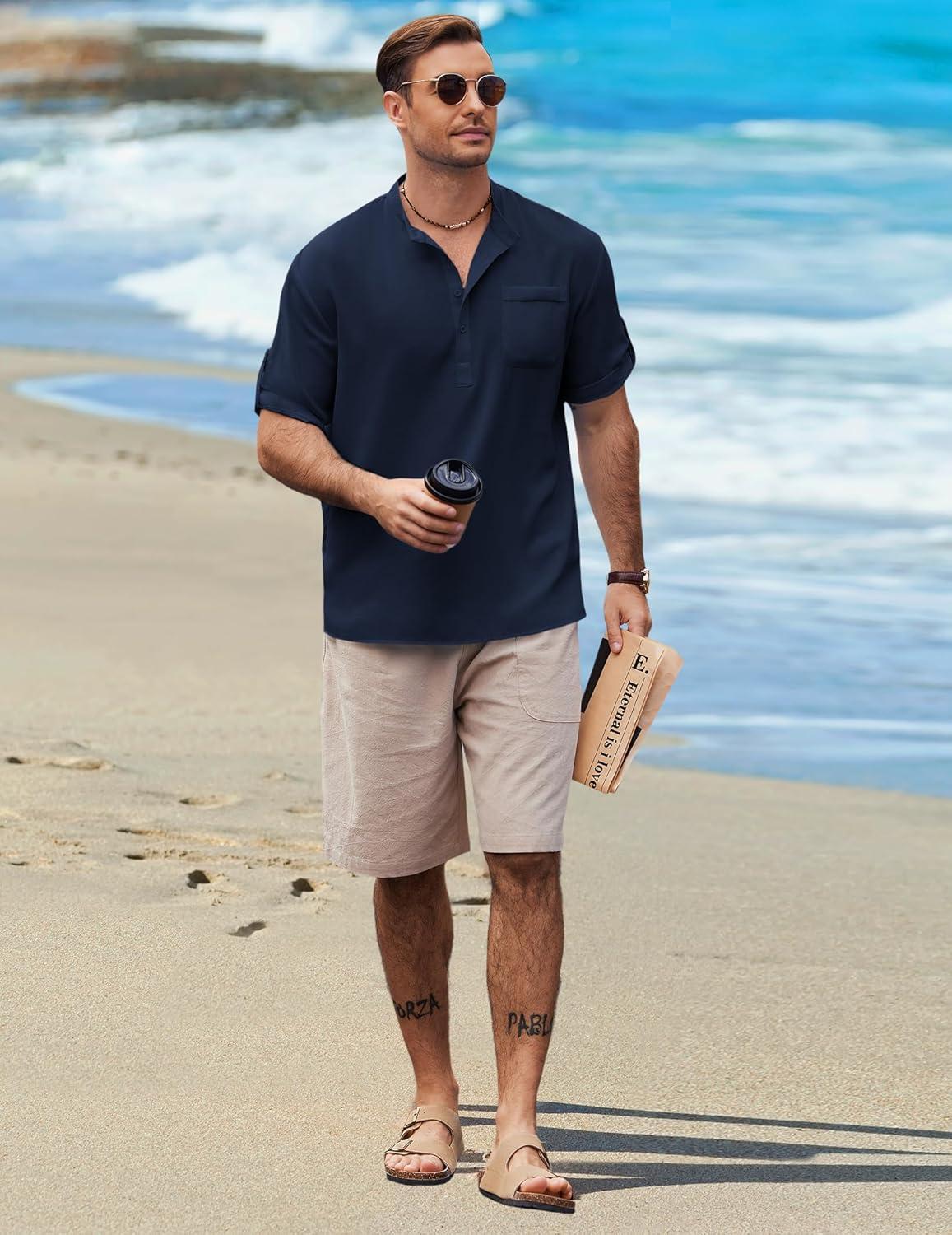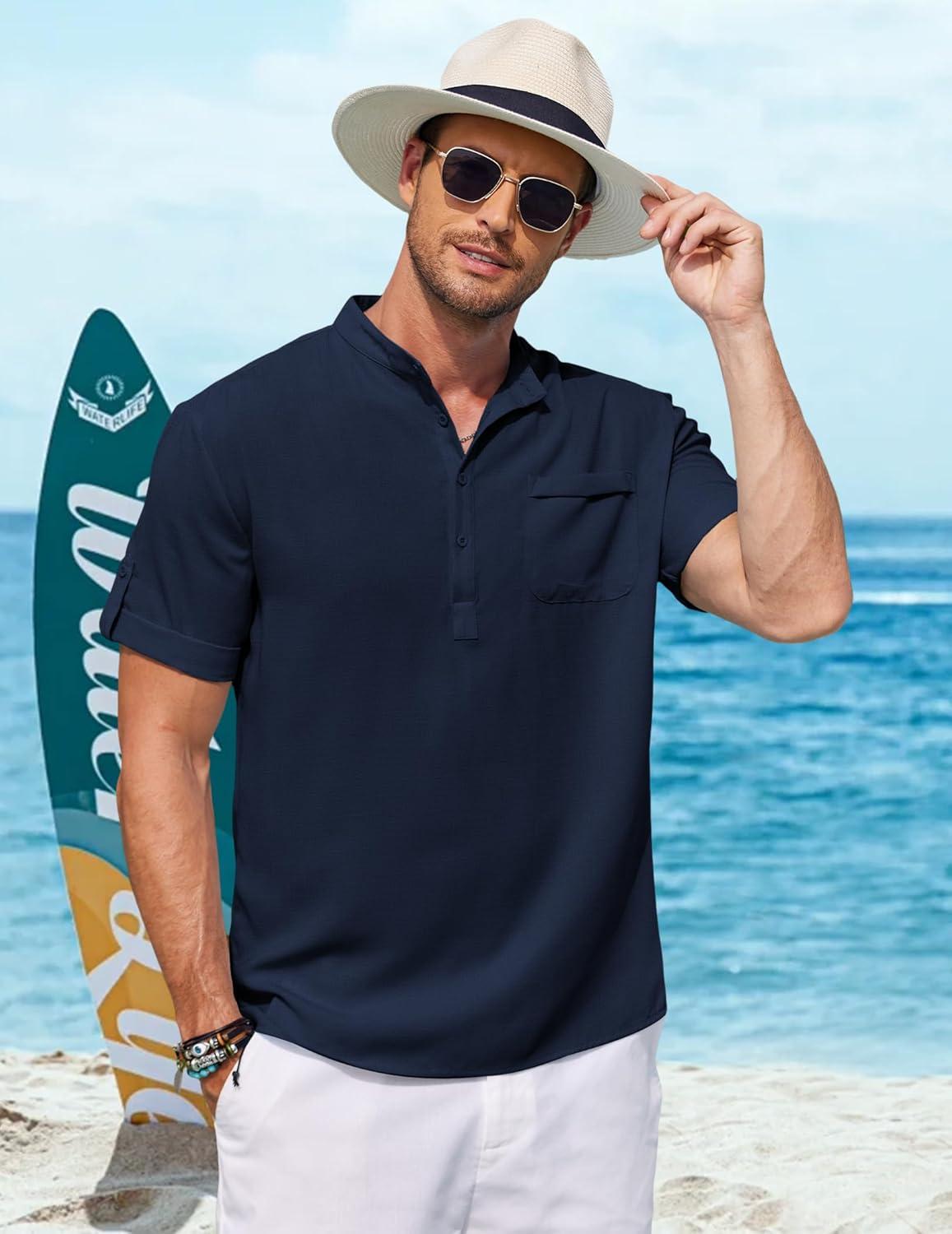 COOFANDY Henley Shirts for Men Short Sleeve Band Collar Casual Shirt Summer Hippie Vacation Beach T Shirts with Pocket(Navy Blue)