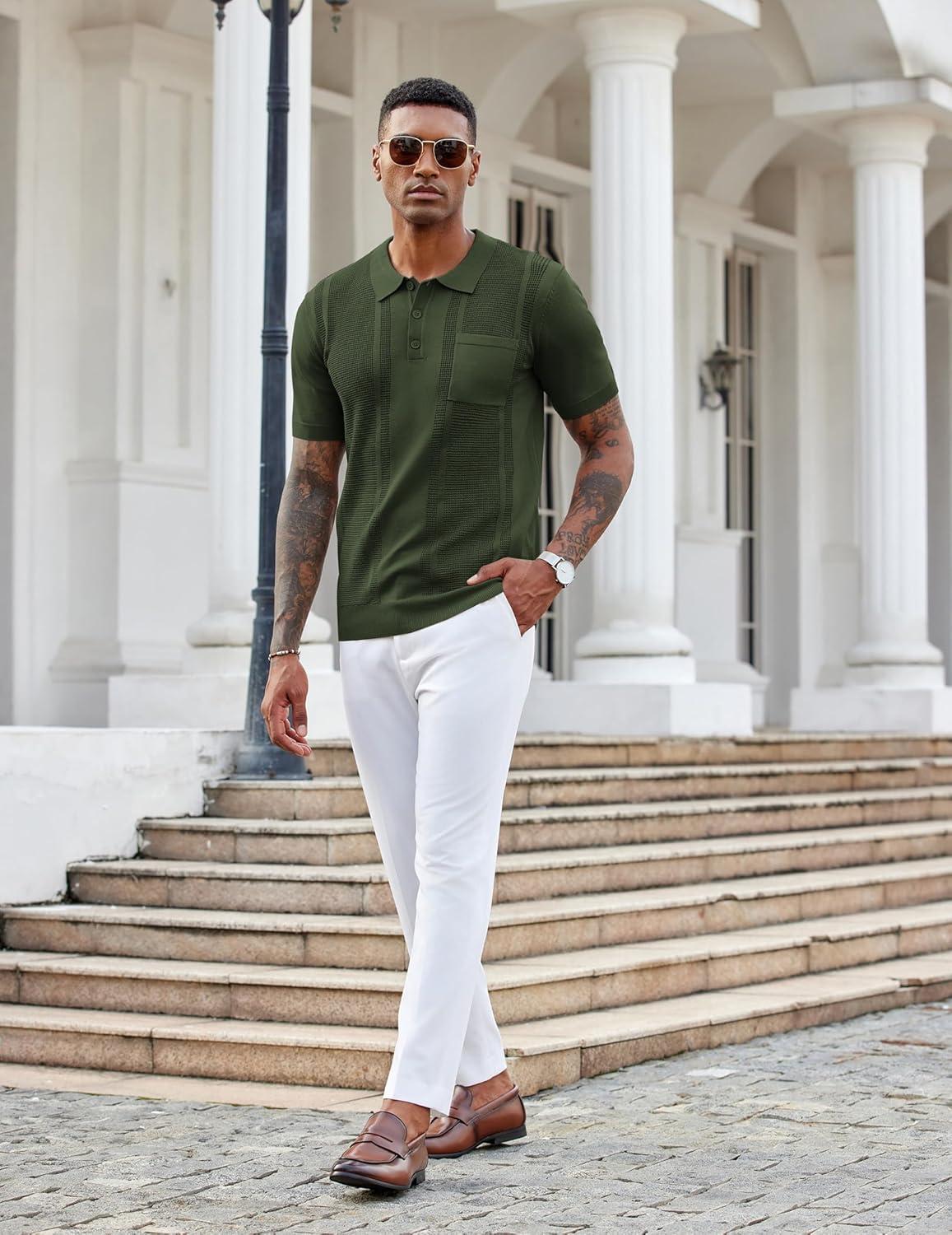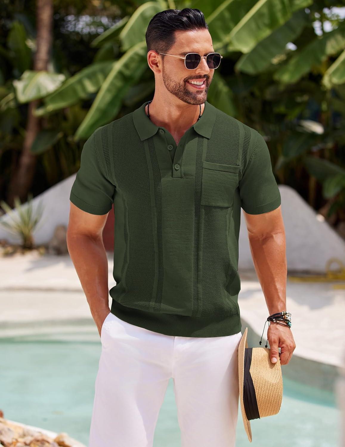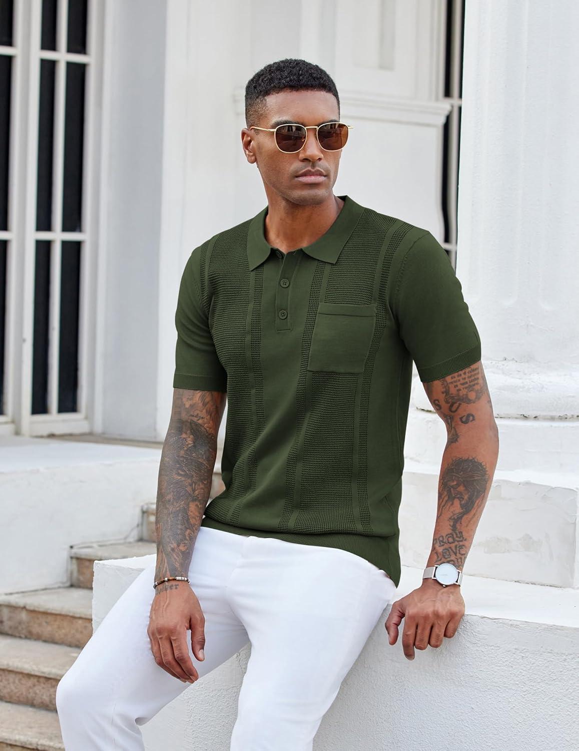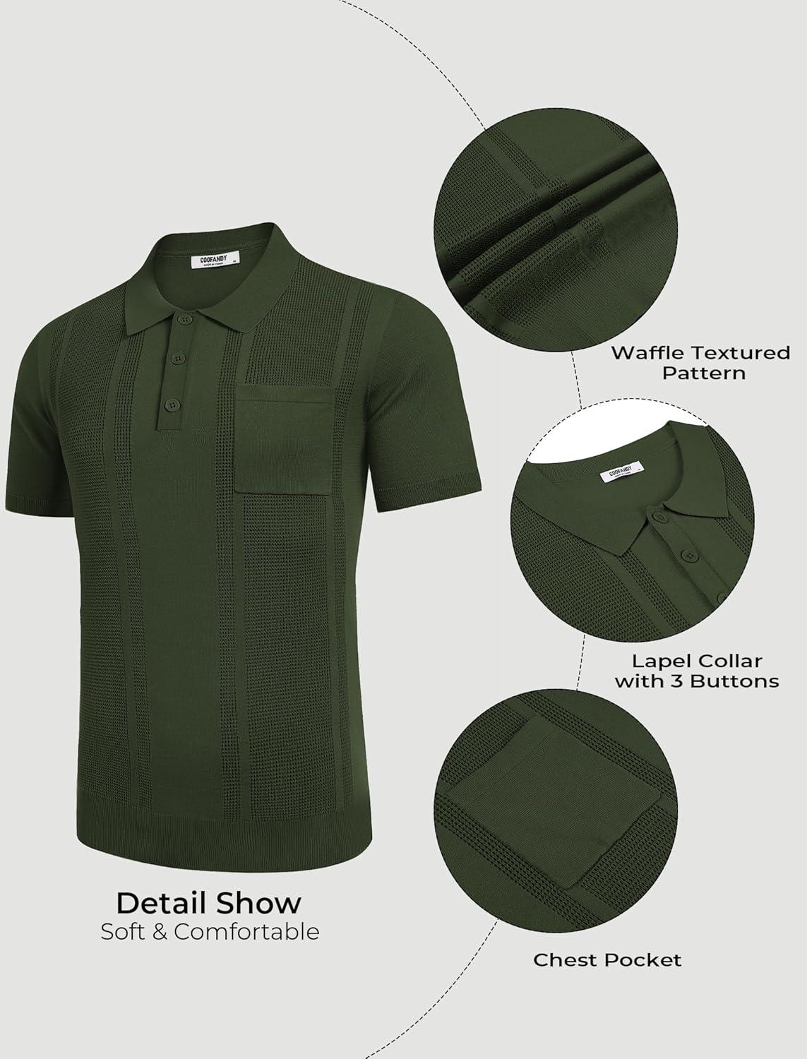 COOFANDY Knit Polo Shirts for Men Short Sleeve Textured Polo Shirt Slim Fit Summer Collared T Shirt with Pocket(Army Green)