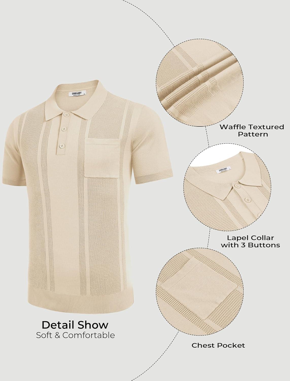 COOFANDY Knit Polo Shirts for Men Short Sleeve Textured Polo Shirt Slim Fit Summer Collared T Shirt with Pocket(Khaki)