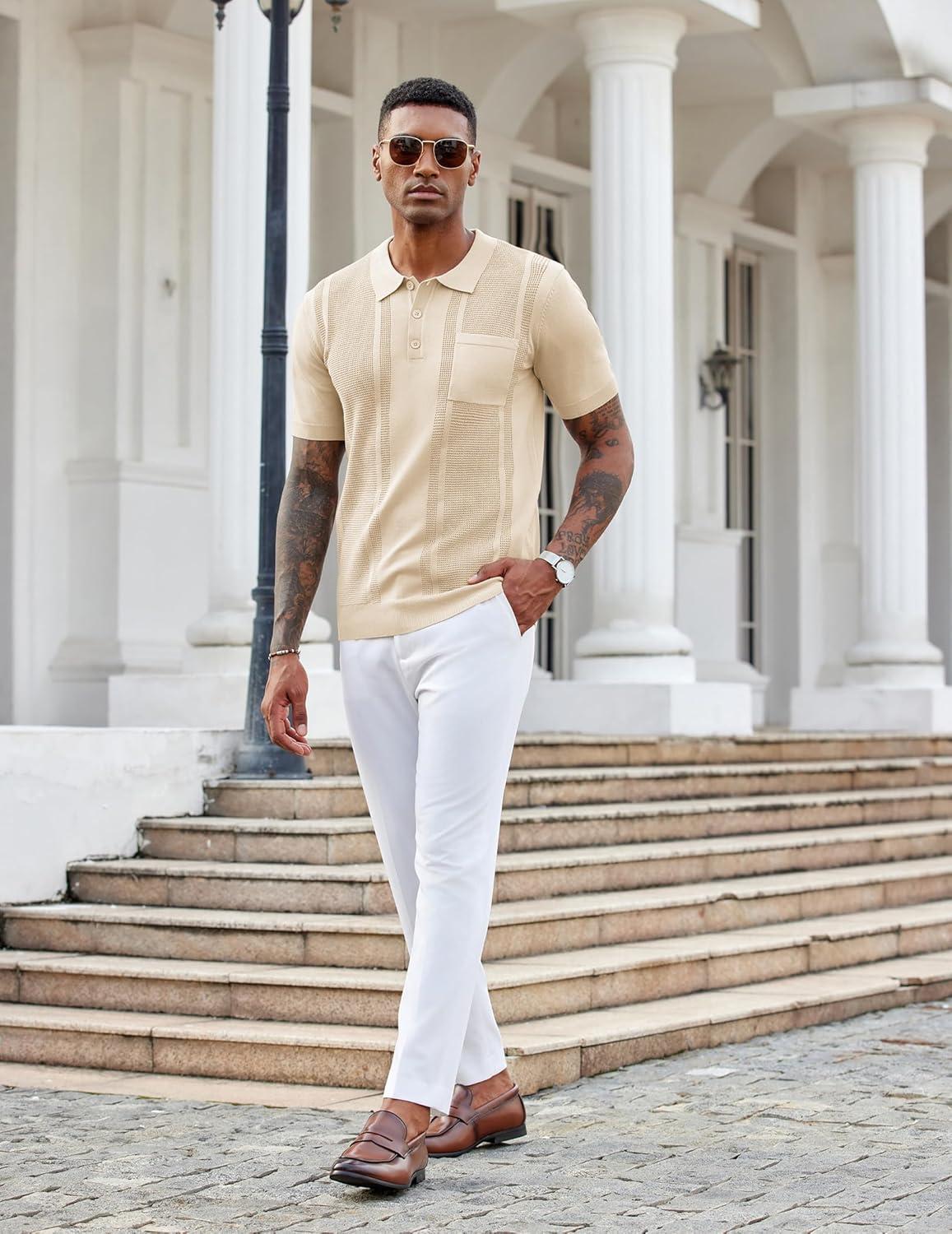 COOFANDY Knit Polo Shirts for Men Short Sleeve Textured Polo Shirt Slim Fit Summer Collared T Shirt with Pocket(Cream)