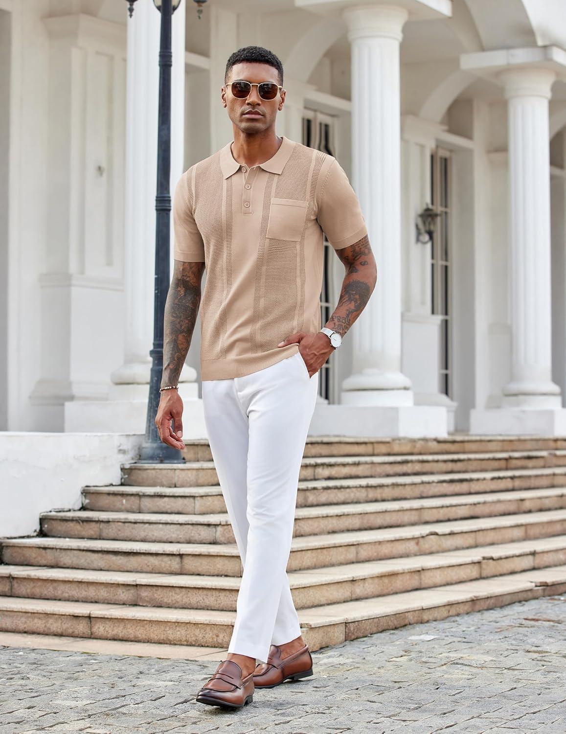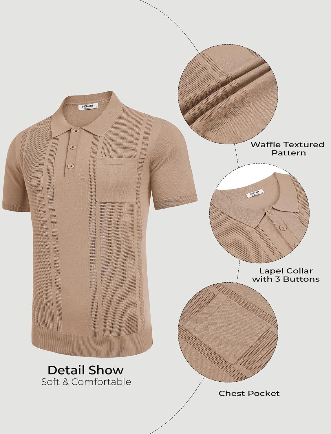 COOFANDY Knit Polo Shirts for Men Short Sleeve Textured Polo Shirt Slim Fit Summer Collared T Shirt with Pocket(Khaki)