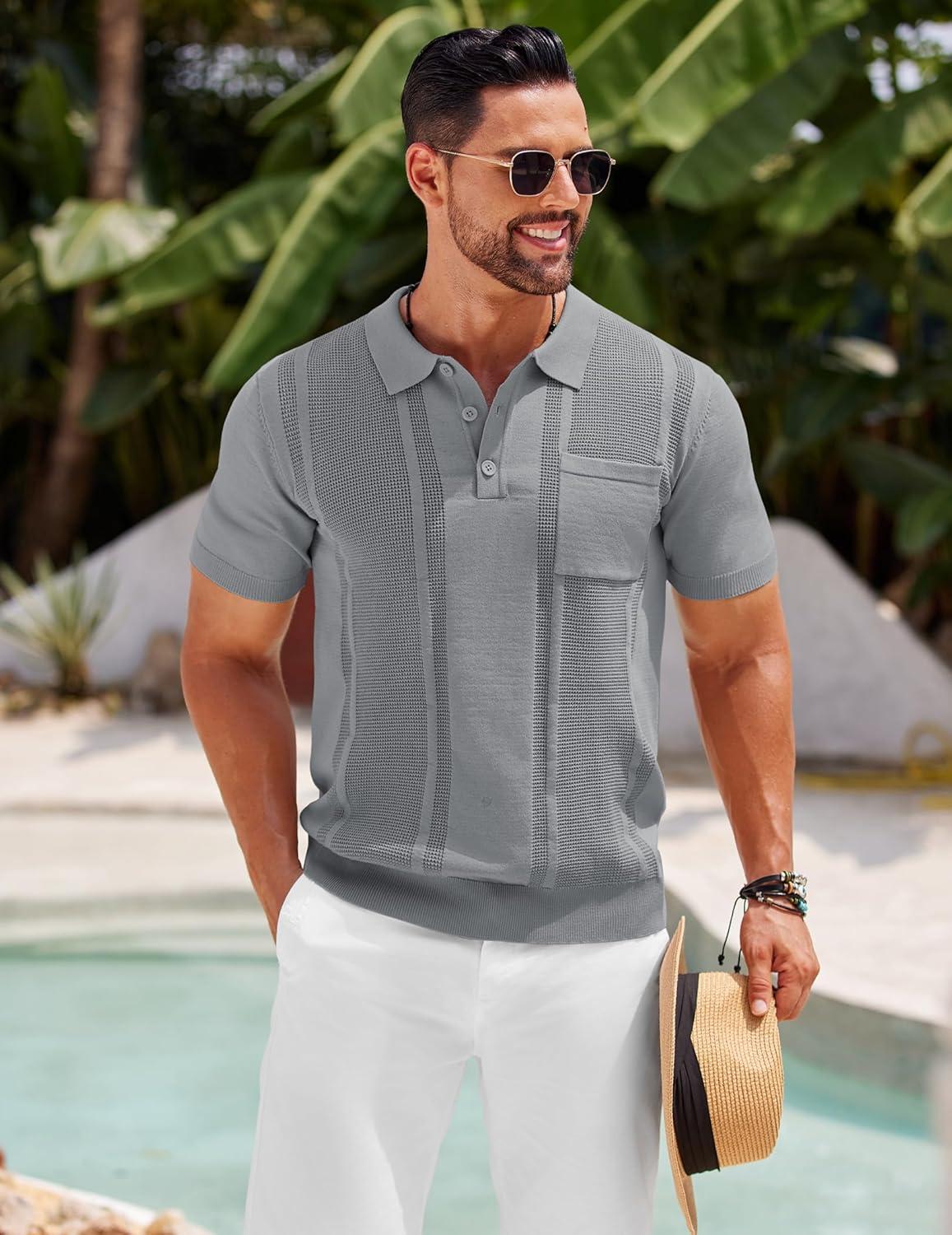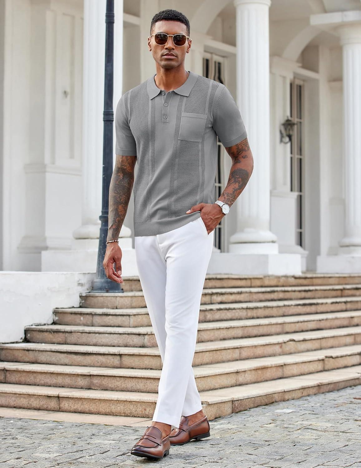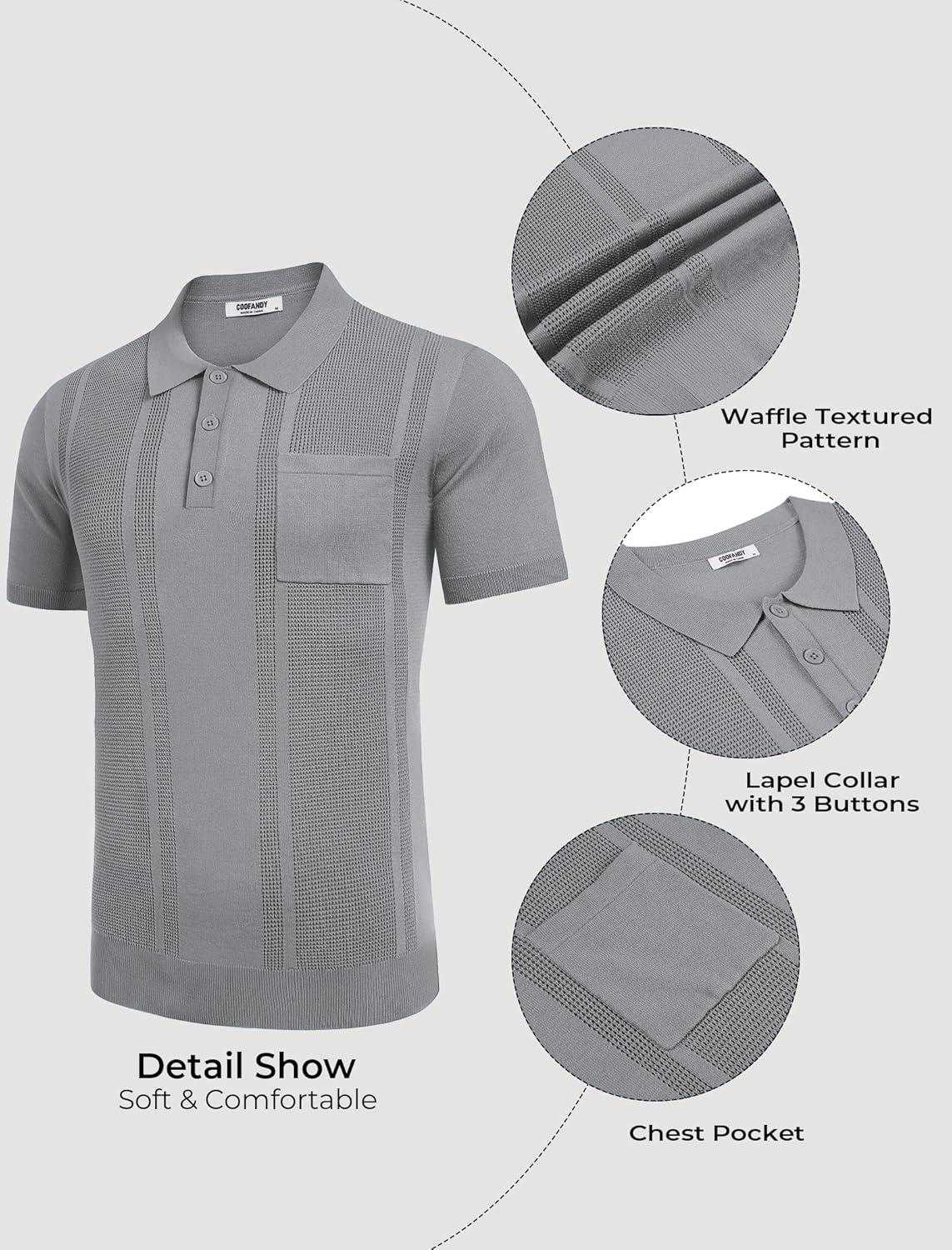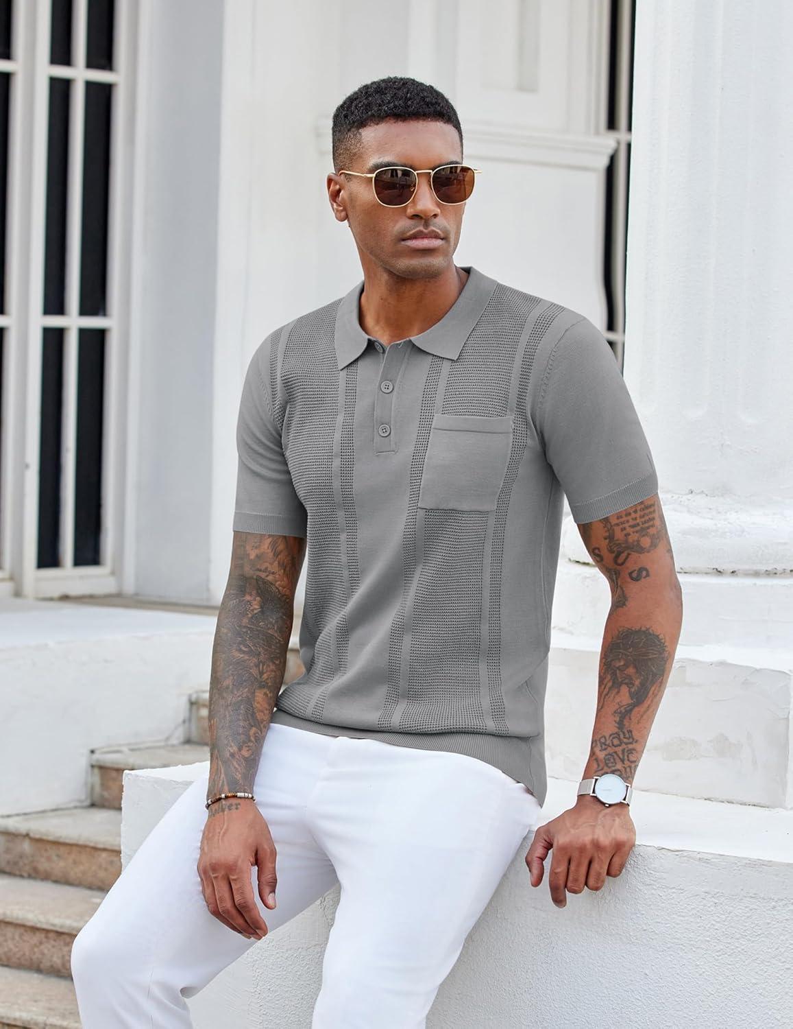 COOFANDY Knit Polo Shirts for Men Short Sleeve Textured Polo Shirt Slim Fit Summer Collared T Shirt with Pocket(Light Grey)