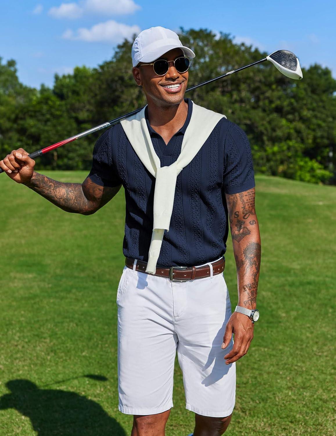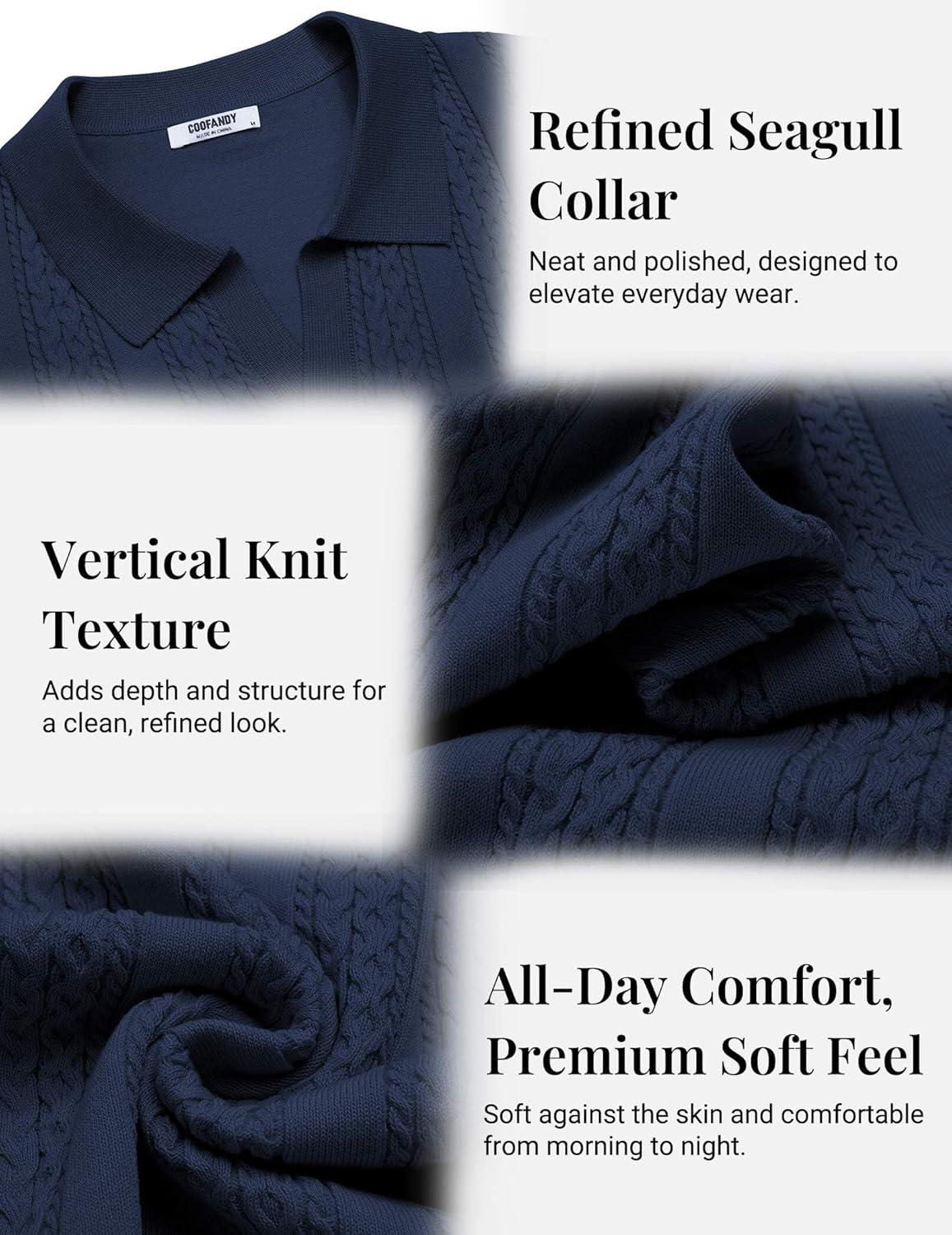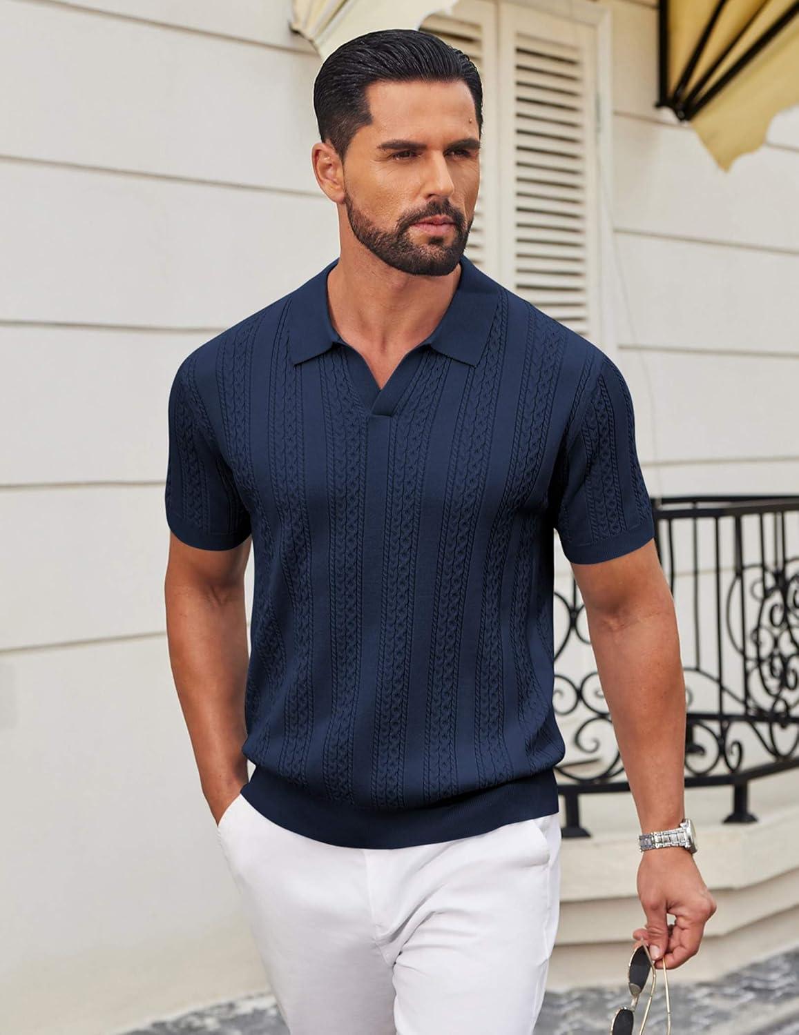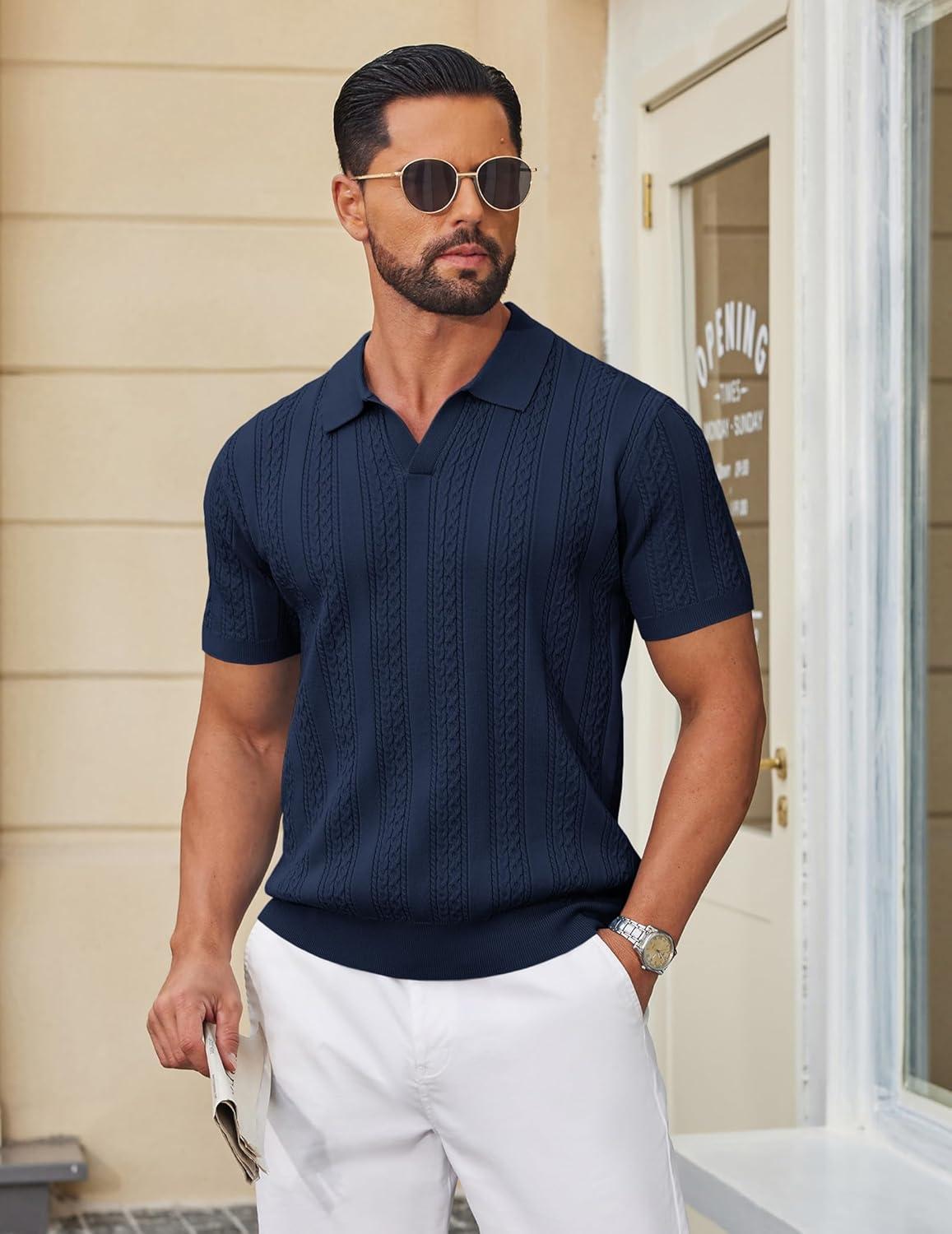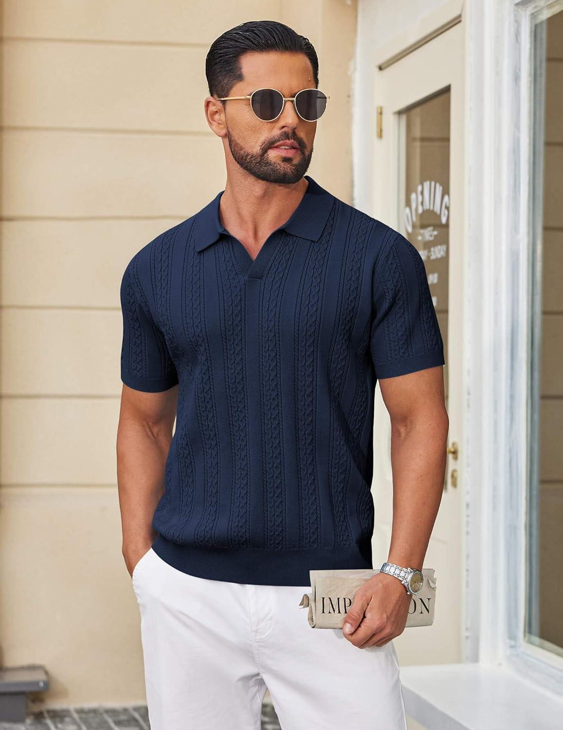 COOFANDY Knit Polo Shirts for Men Short Sleeve V Neck Polo Lightweight Summer Casual Textured Polo Shirts(Navy)