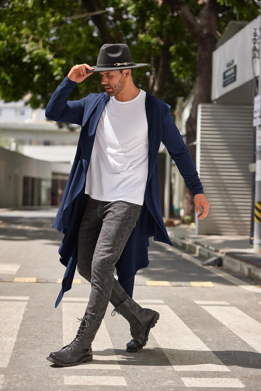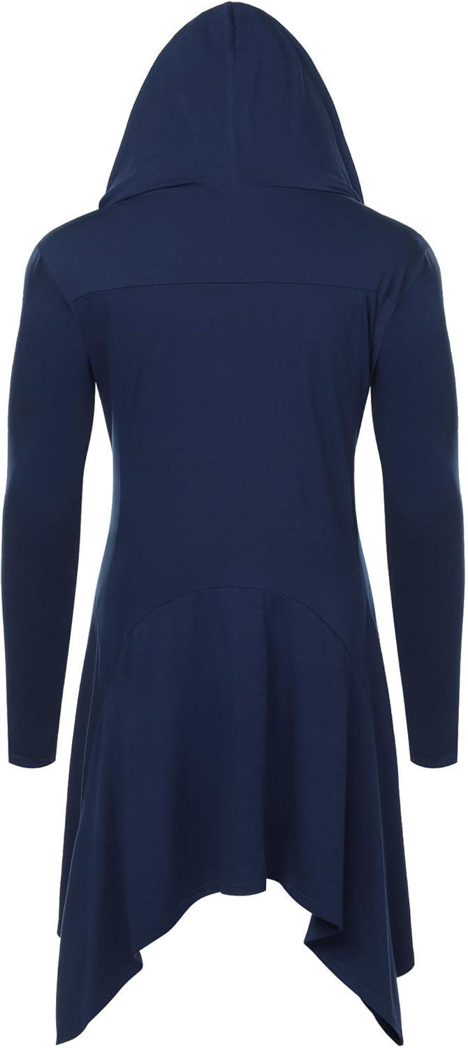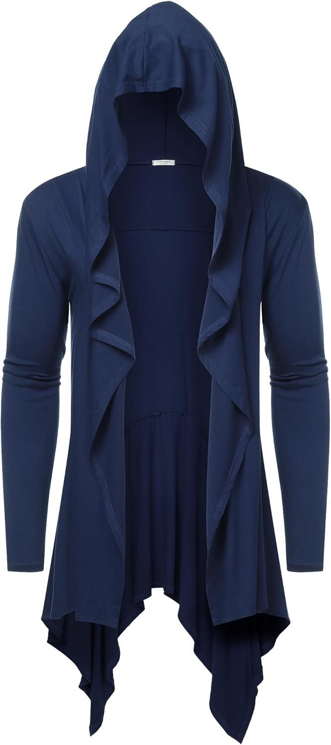 COOFANDY Long Hooded Cardigan Ruffle Shawl Collar Open Front Lightweight Drape Cape Overcoat with Pockets(Navy)
