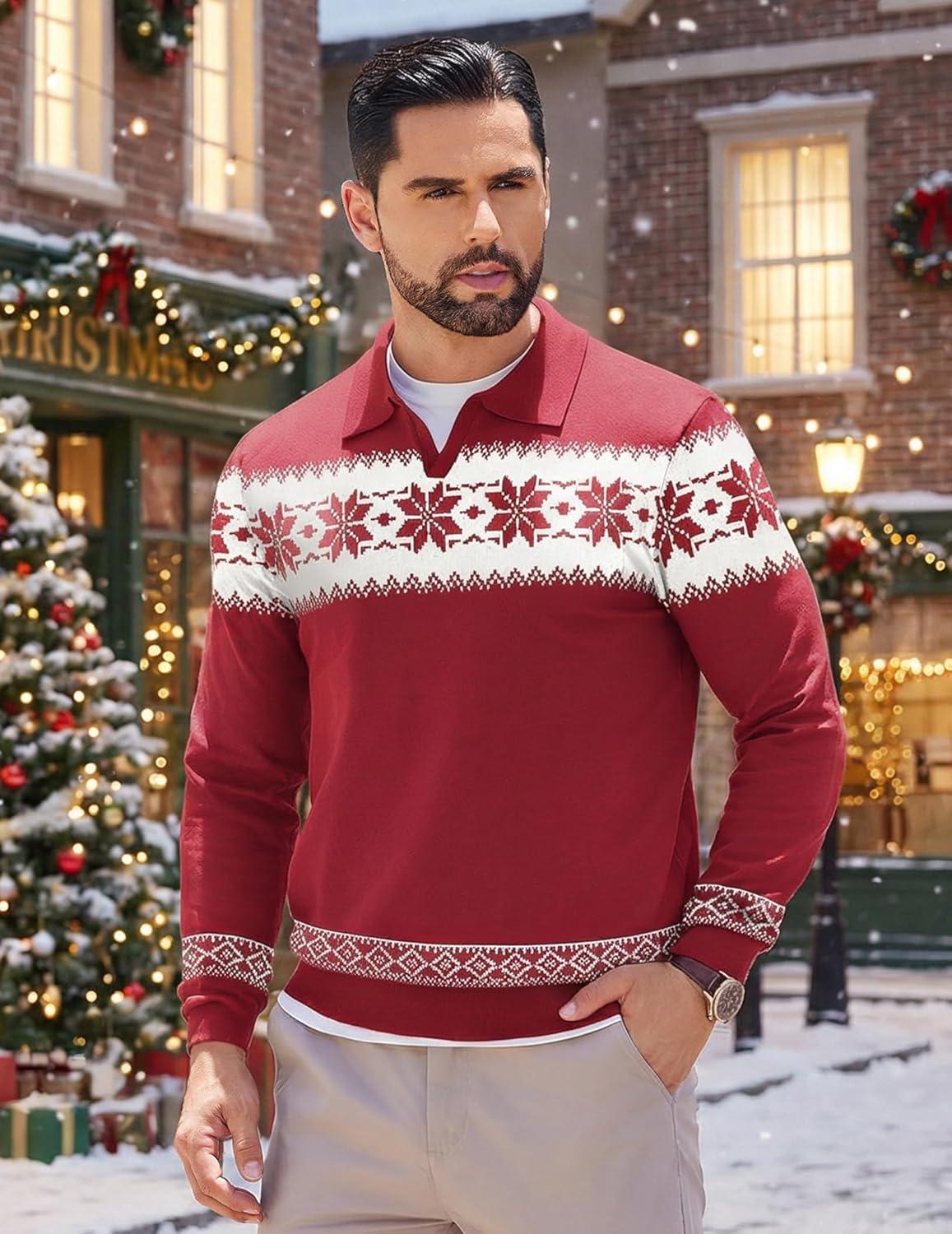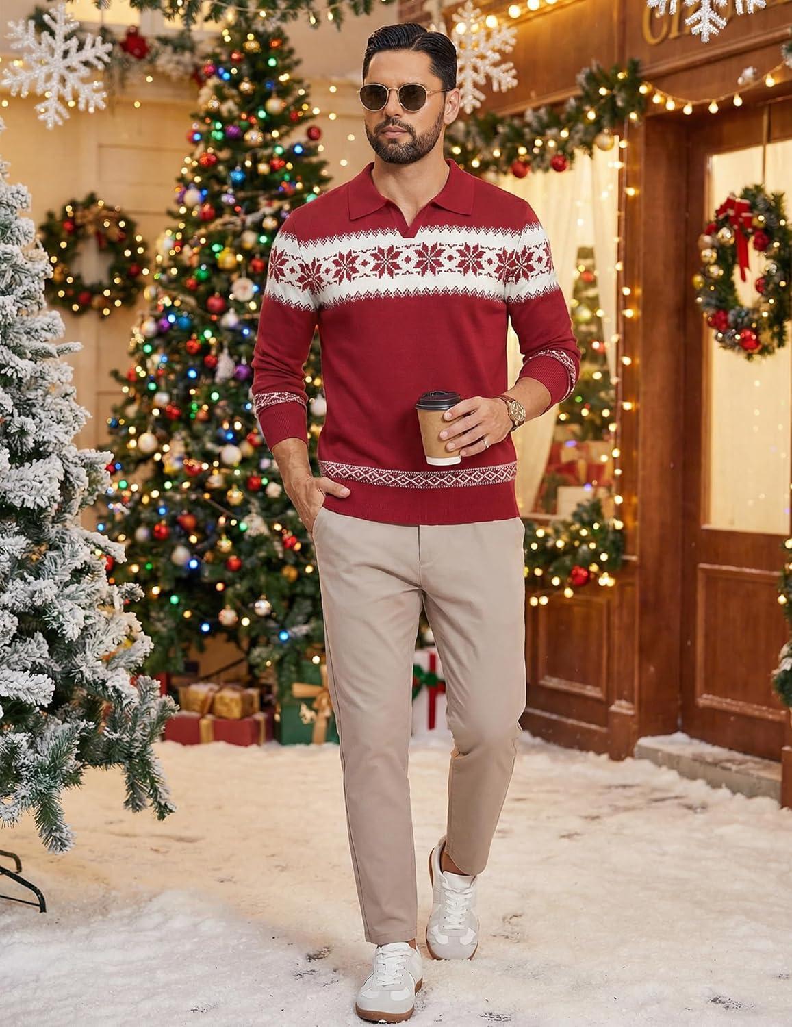 COOFANDY Long Sleeve Polo Shirts for Men Knit Polo Sweater Lightweight Ribbed Pullover Sweater(Christmas Red & White)
