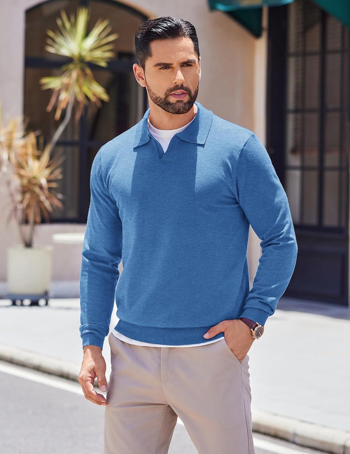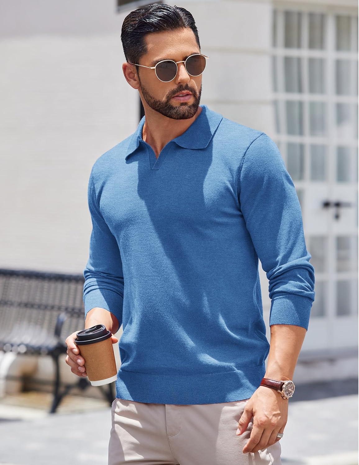 COOFANDY Long Sleeve Polo Shirts for Men Knit Polo Sweater Lightweight Ribbed Pullover Sweater(Dark Blue)