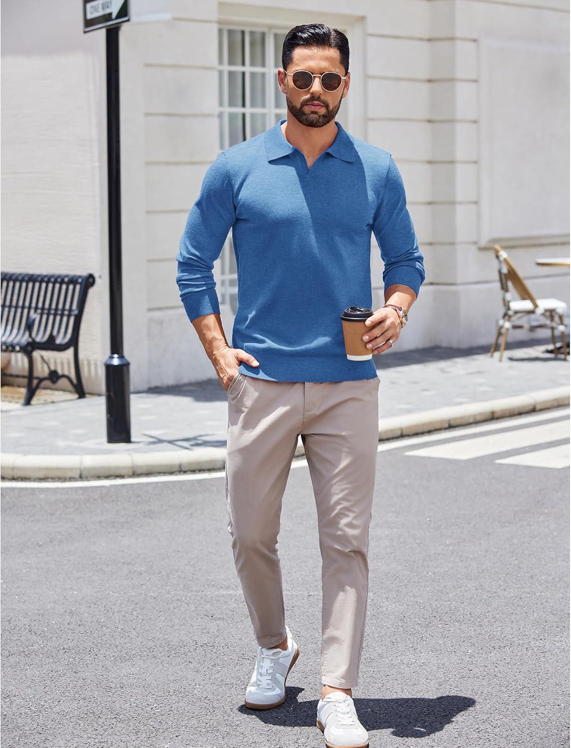 COOFANDY Long Sleeve Polo Shirts for Men Knit Polo Sweater Lightweight Ribbed Pullover Sweater(Brown)