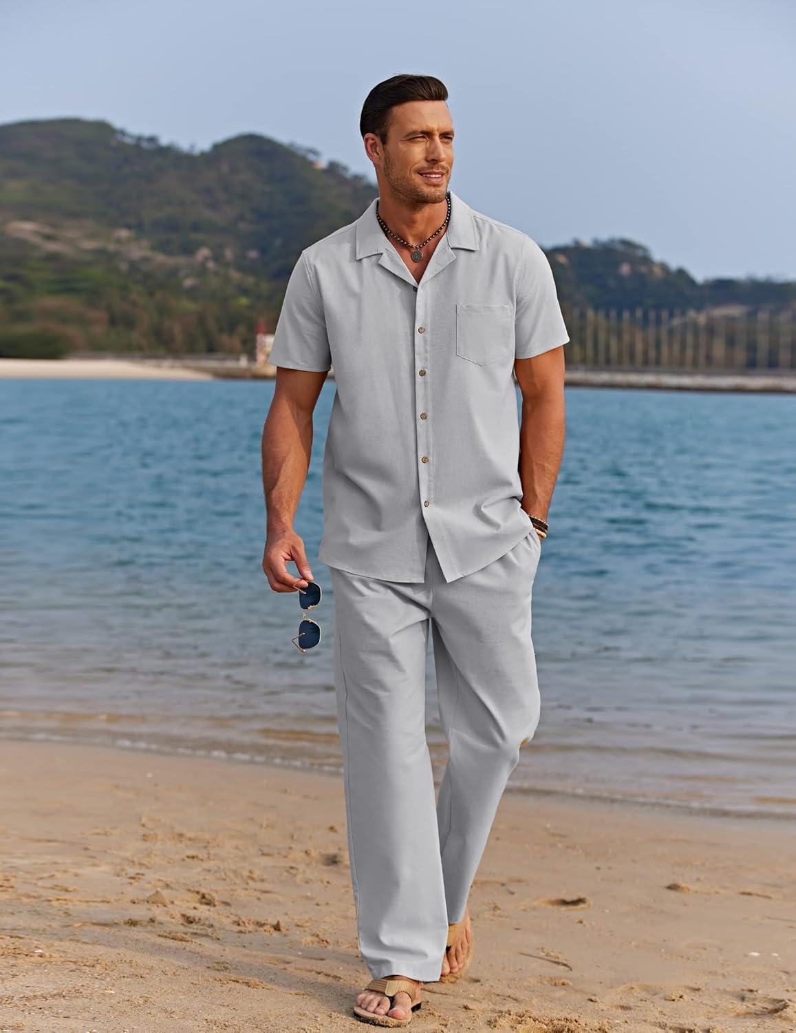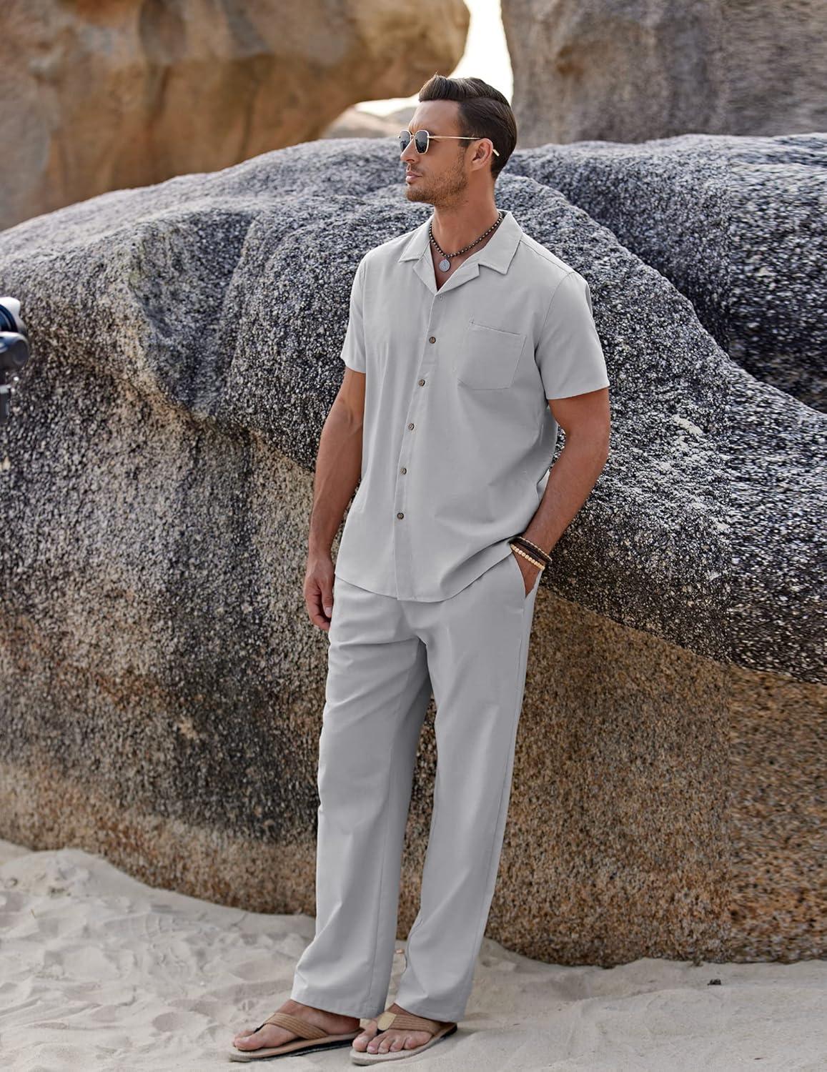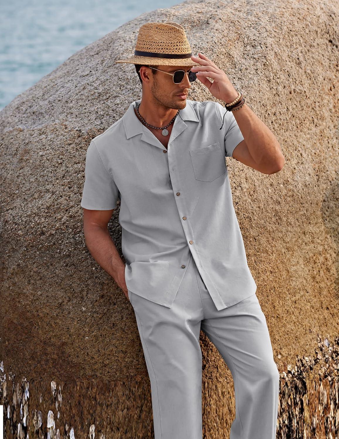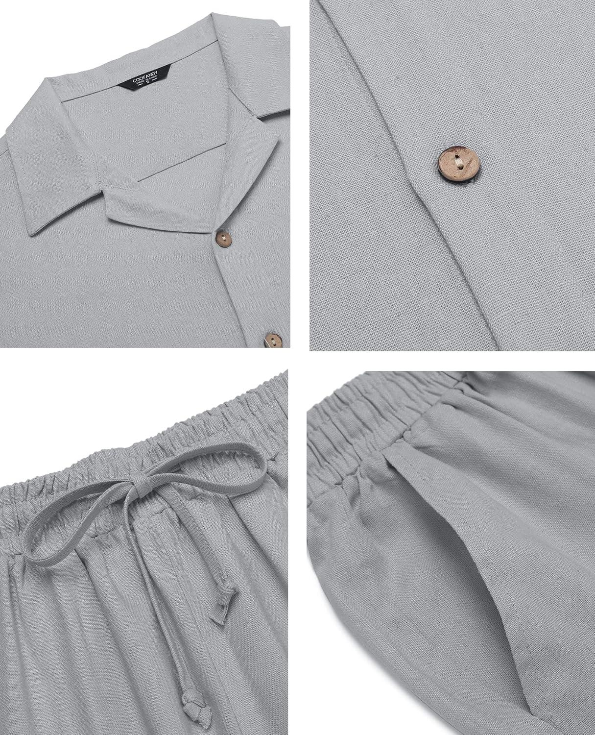 COOFANDY Men 2 Piece Linen Outfit Beach Button Down Shirt Casual Loose Pant Sets(Light Grey)