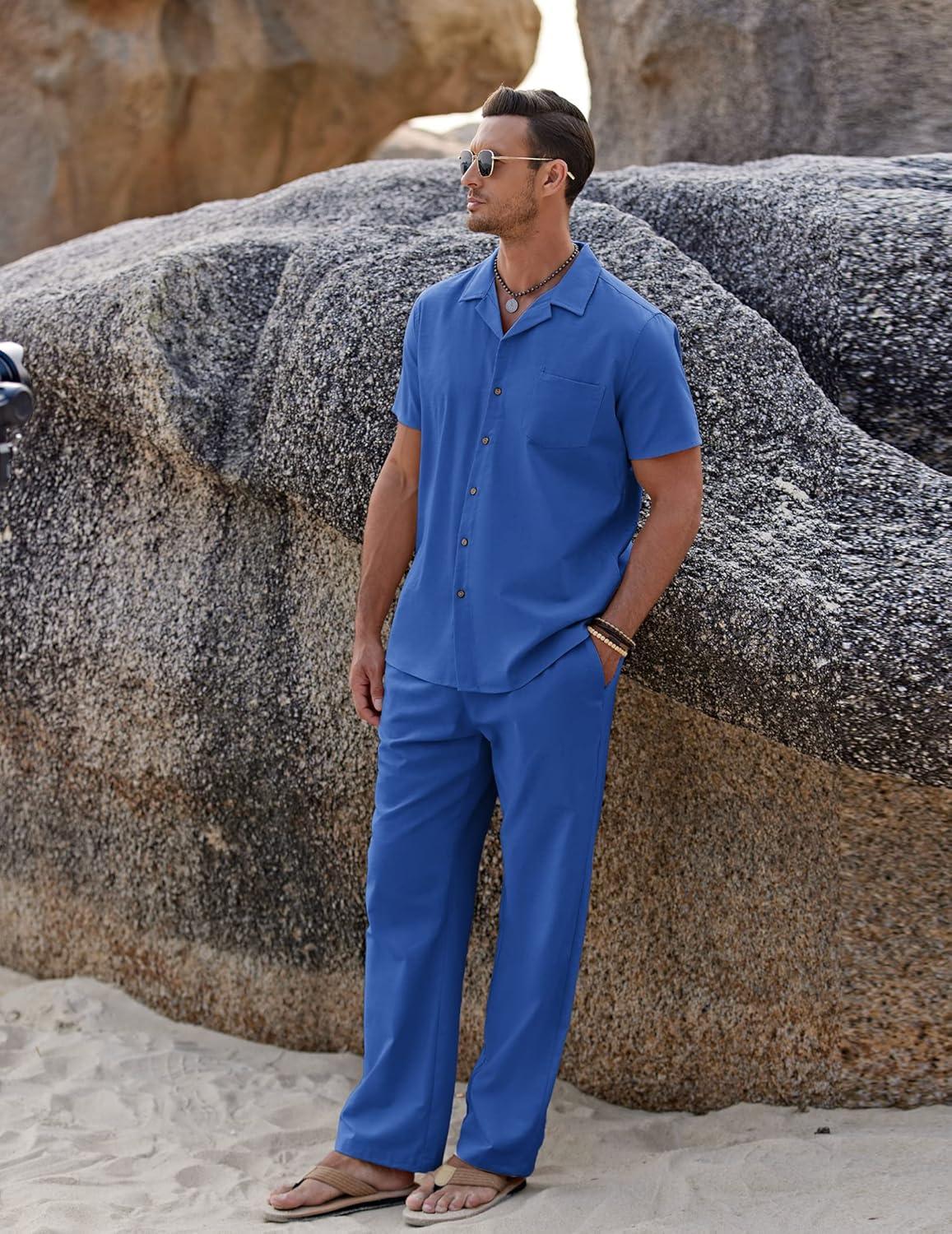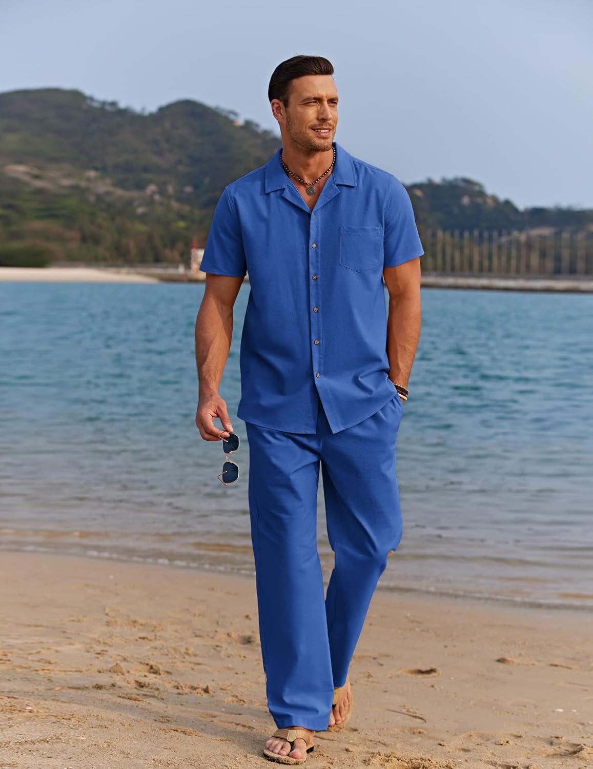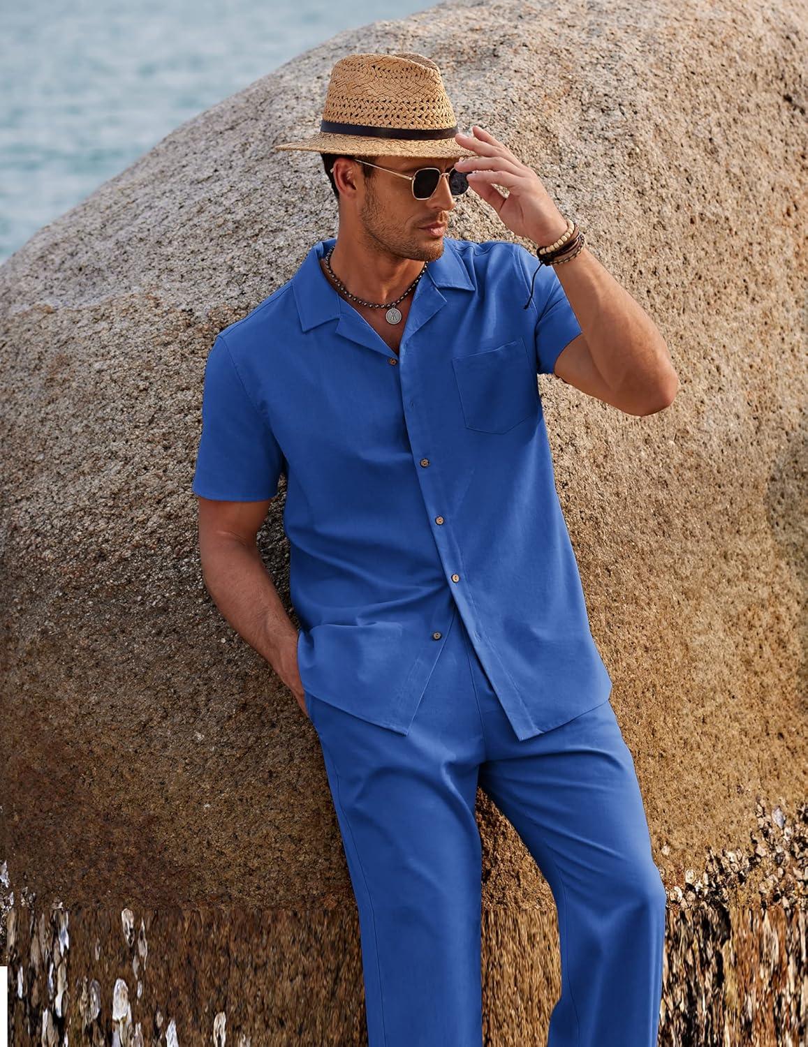 COOFANDY Men 2 Piece Linen Outfit Beach Button Down Shirt Casual Loose Pant Sets(Royal Blue)