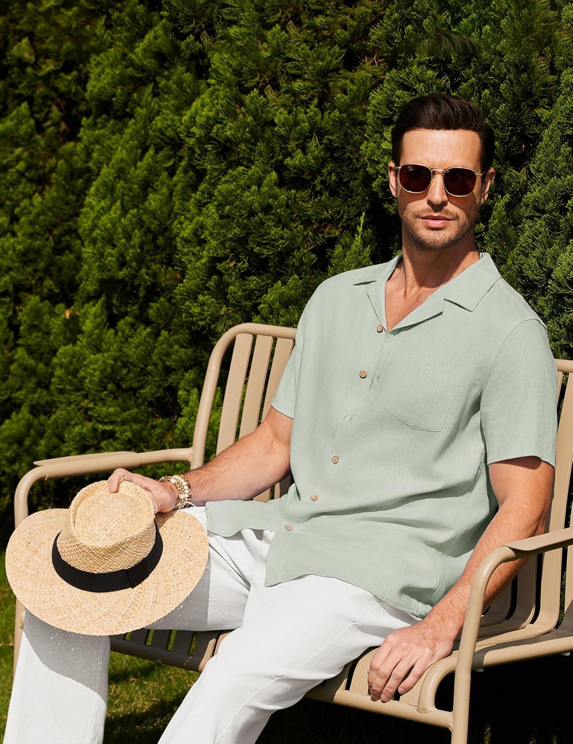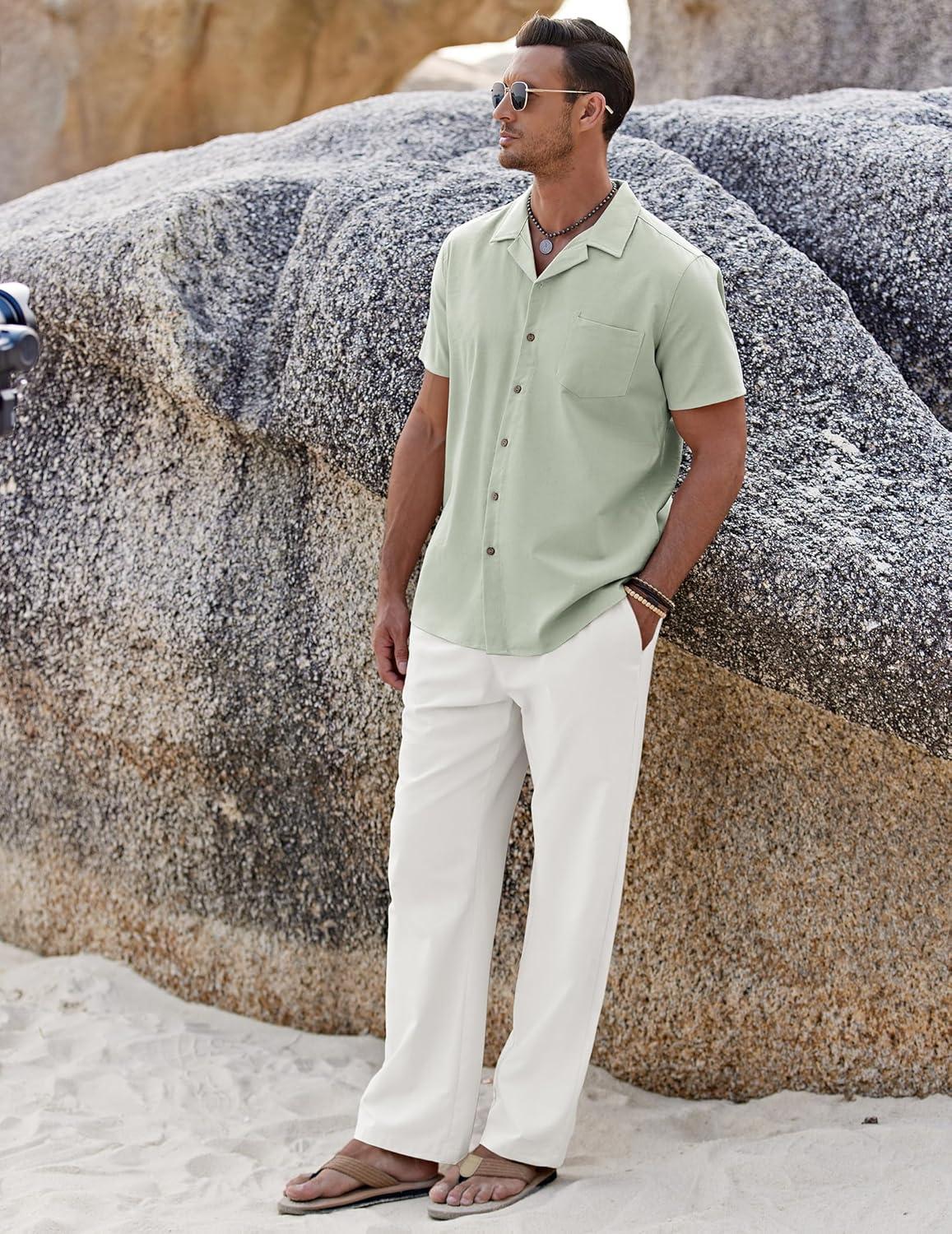 COOFANDY Men 2 Piece Linen Outfit Beach Button Down Shirt Casual Loose Pant Sets(Sage Green Shirt/White Pants)