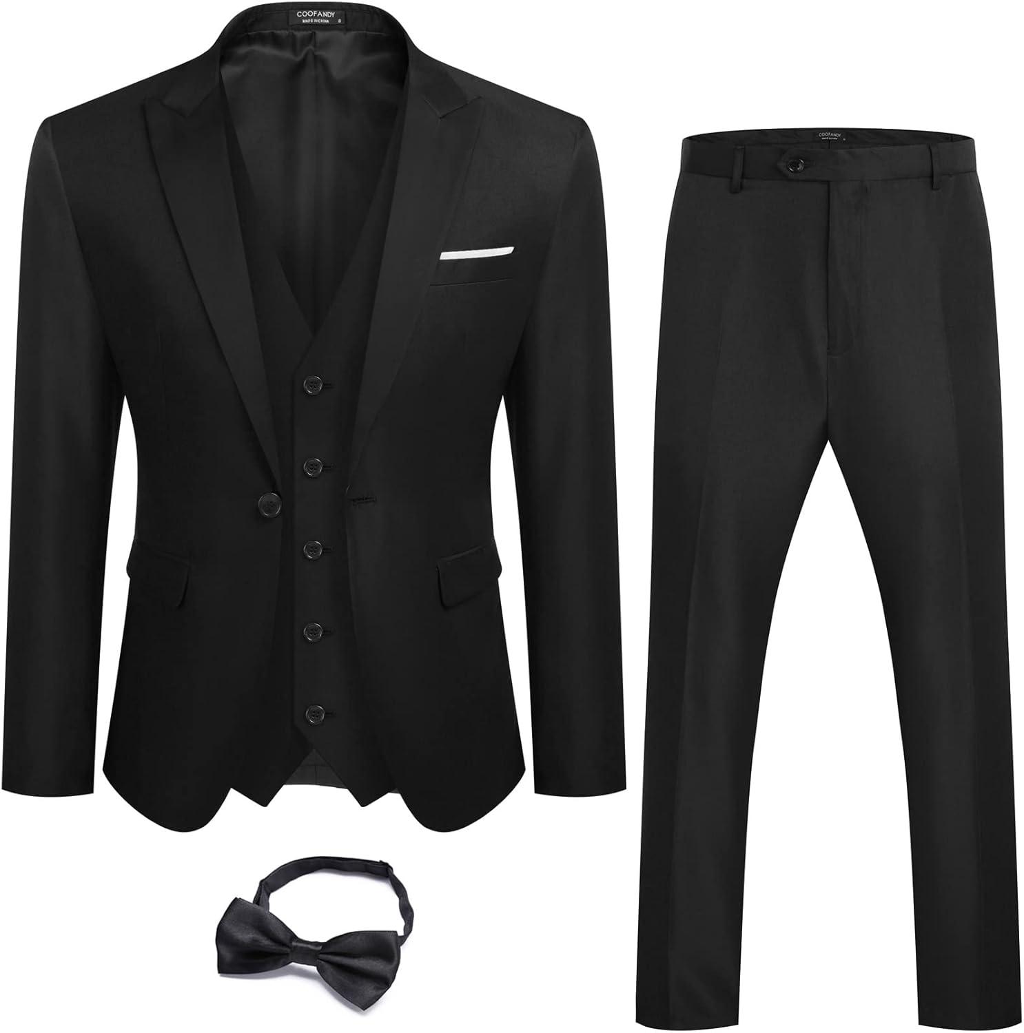 COOFANDY Men 3 Piece Suit Slim Fit Tuxedo One Button Prom Suits Blazer Jacket Vest Pants with Tie(Black)