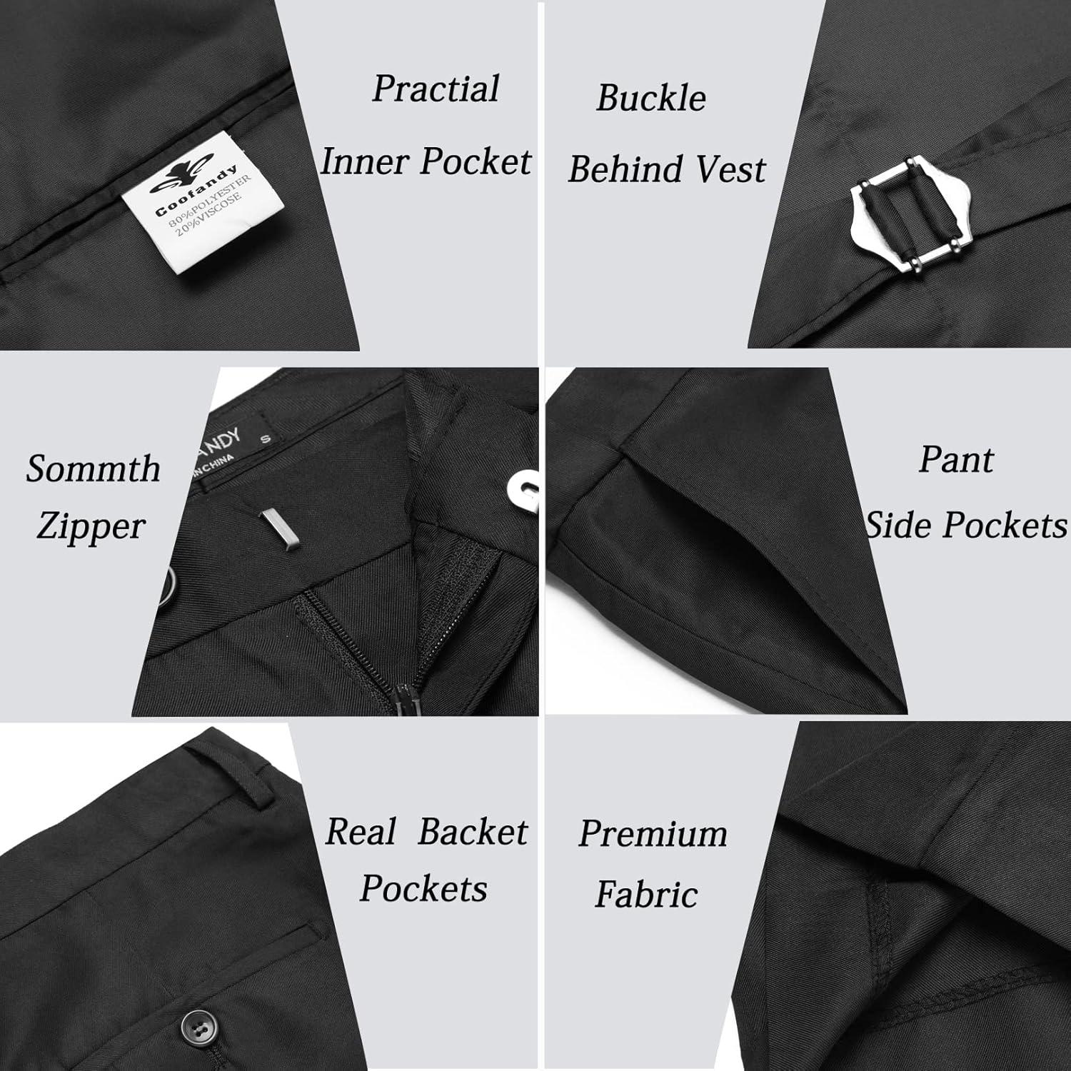 Men's 3 piece tuxedo suit made of premium polyester fabric, which are lightweight, comfortable and careful craftsmanship, can keep the shape and make you minimalistic, elegant, and generous in the crowd. Feature with one button, slim fit, peaked lapel, one chest pocket and two front pockets, zippered fly and two side pockets, casual style. It is easy to match and suitable for all-season and places.