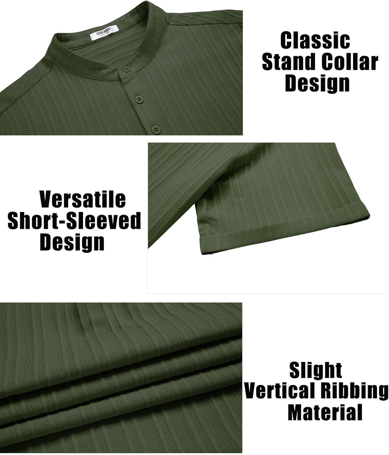 COOFANDY Men Casual Henley Tee Shirt Short Sleeve Band Collar Summer Beach Textured T-Shirt(Army Green)