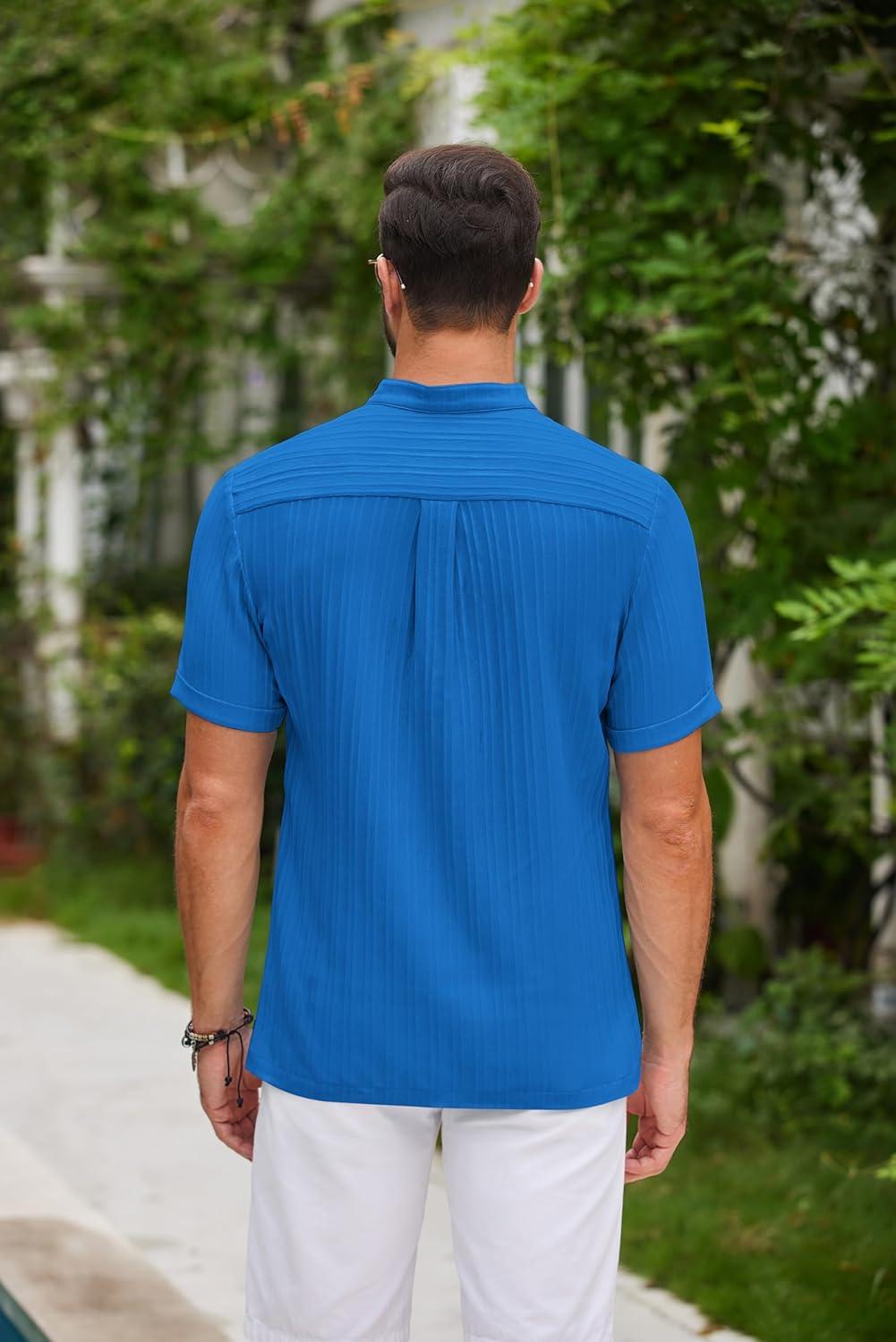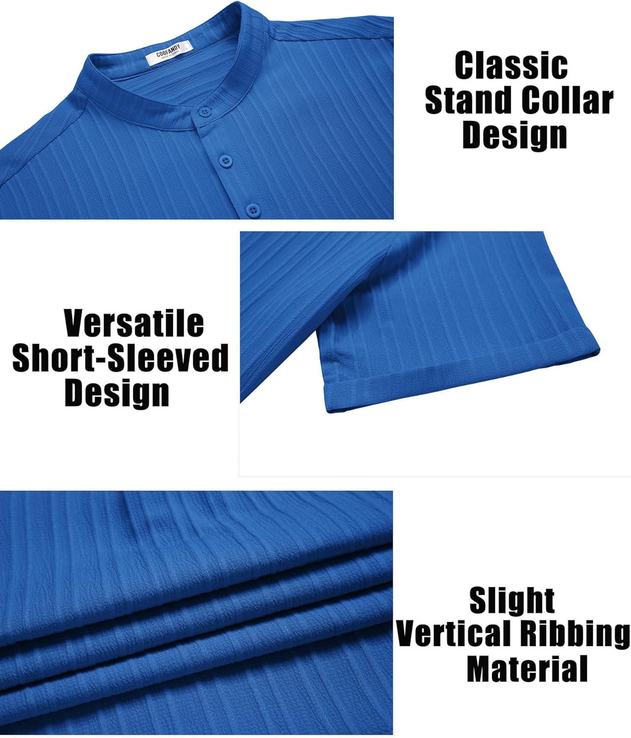 COOFANDY Men Casual Henley Tee Shirt Short Sleeve Band Collar Summer Beach Textured T-Shirt(Blue)