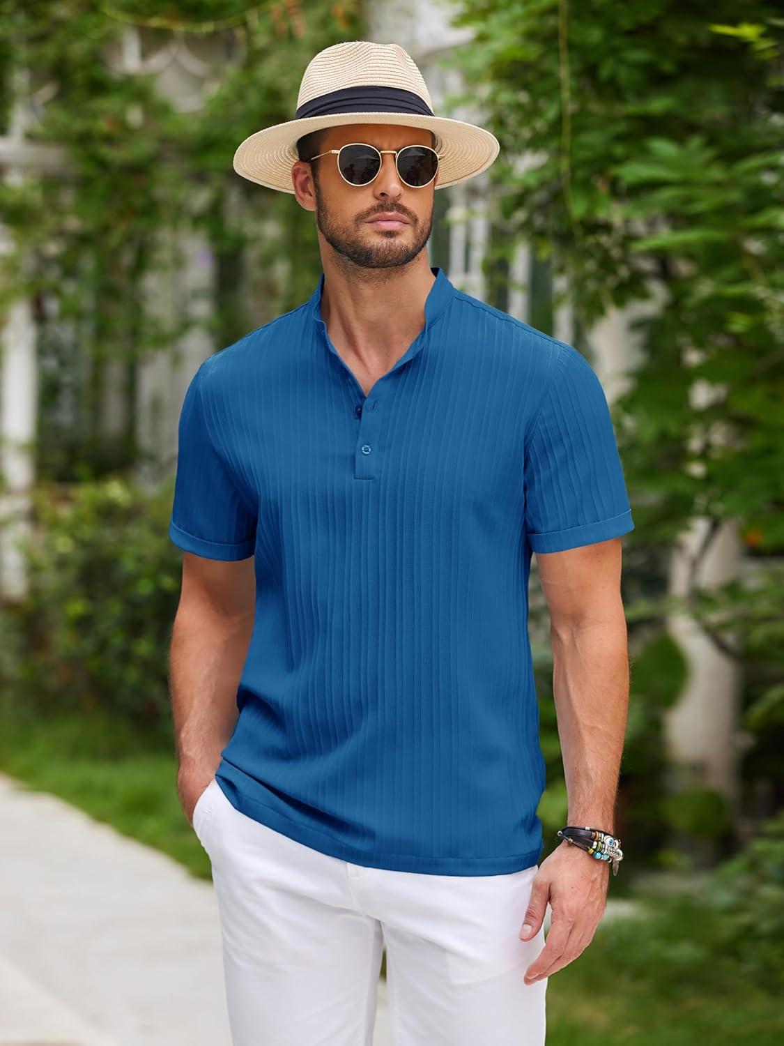 COOFANDY Men Casual Henley Tee Shirt Short Sleeve Band Collar Summer Beach Textured T-Shirt(Dark Blue)