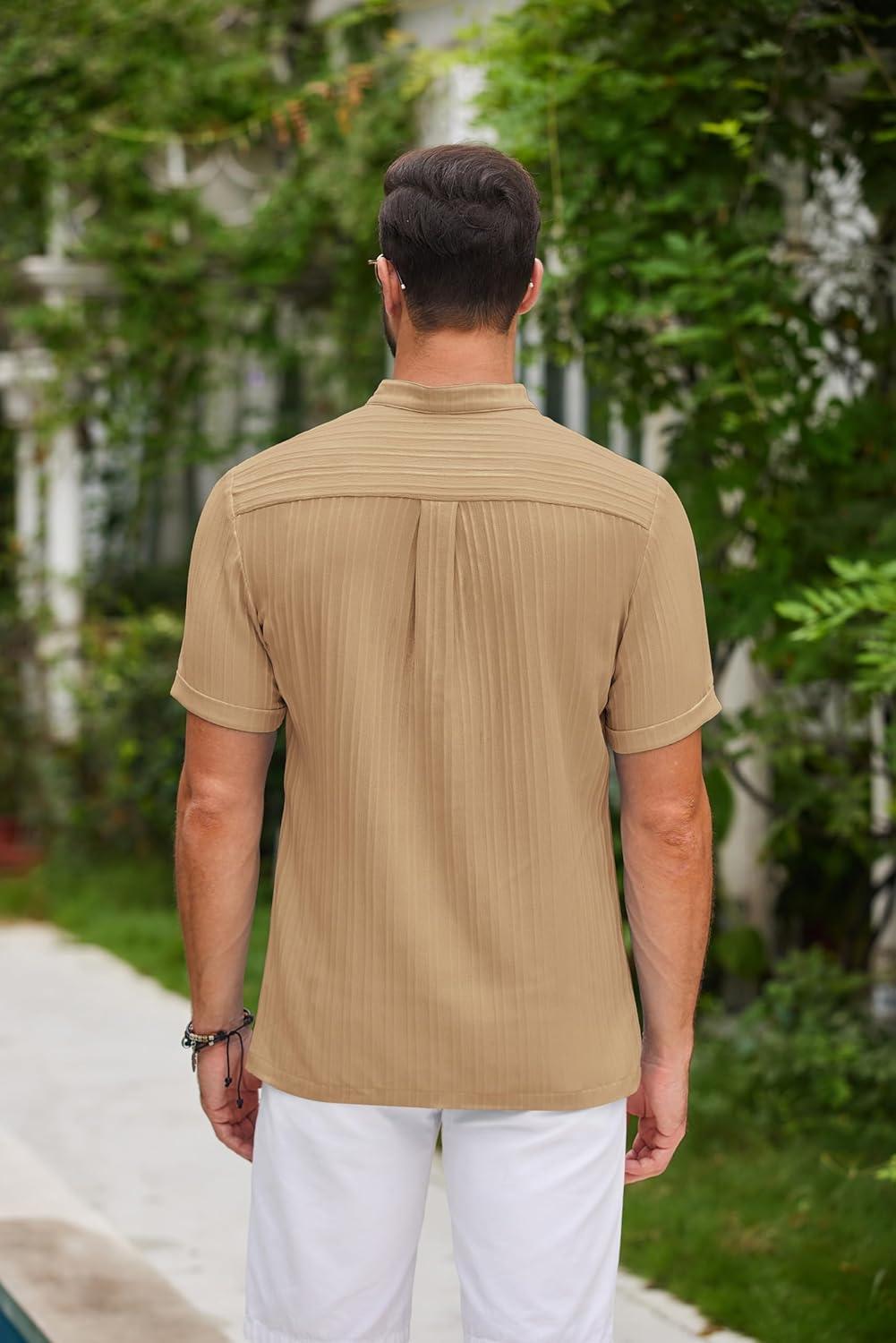 COOFANDY Men Casual Henley Tee Shirt Short Sleeve Band Collar Summer Beach Textured T-Shirt(Khaki)