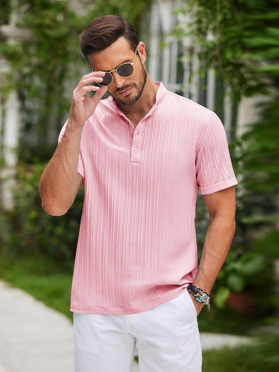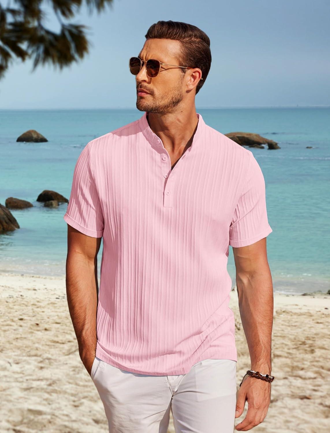 COOFANDY Men Casual Henley Tee Shirt Short Sleeve Band Collar Summer Beach Textured T-Shirt(Pink)