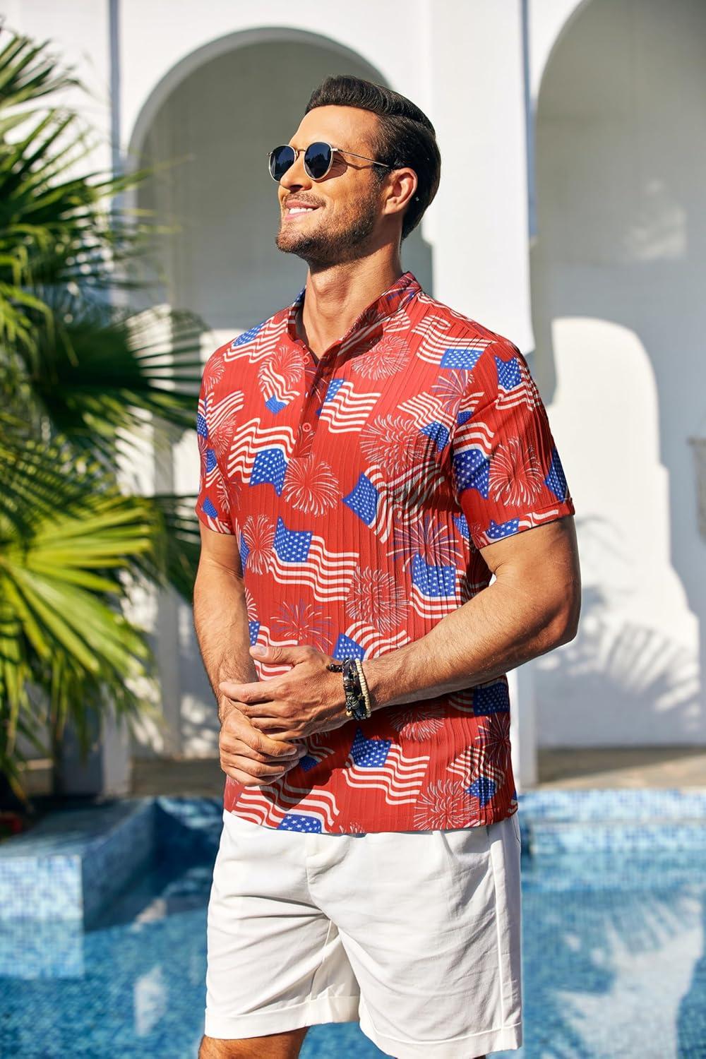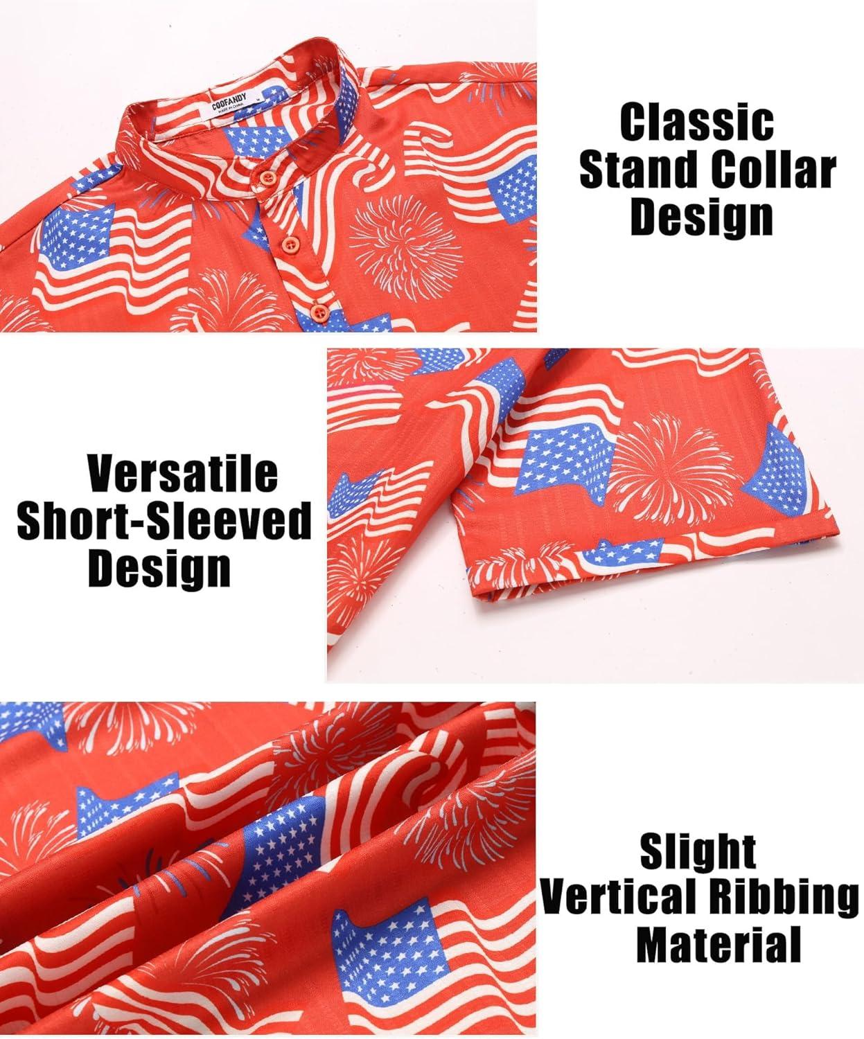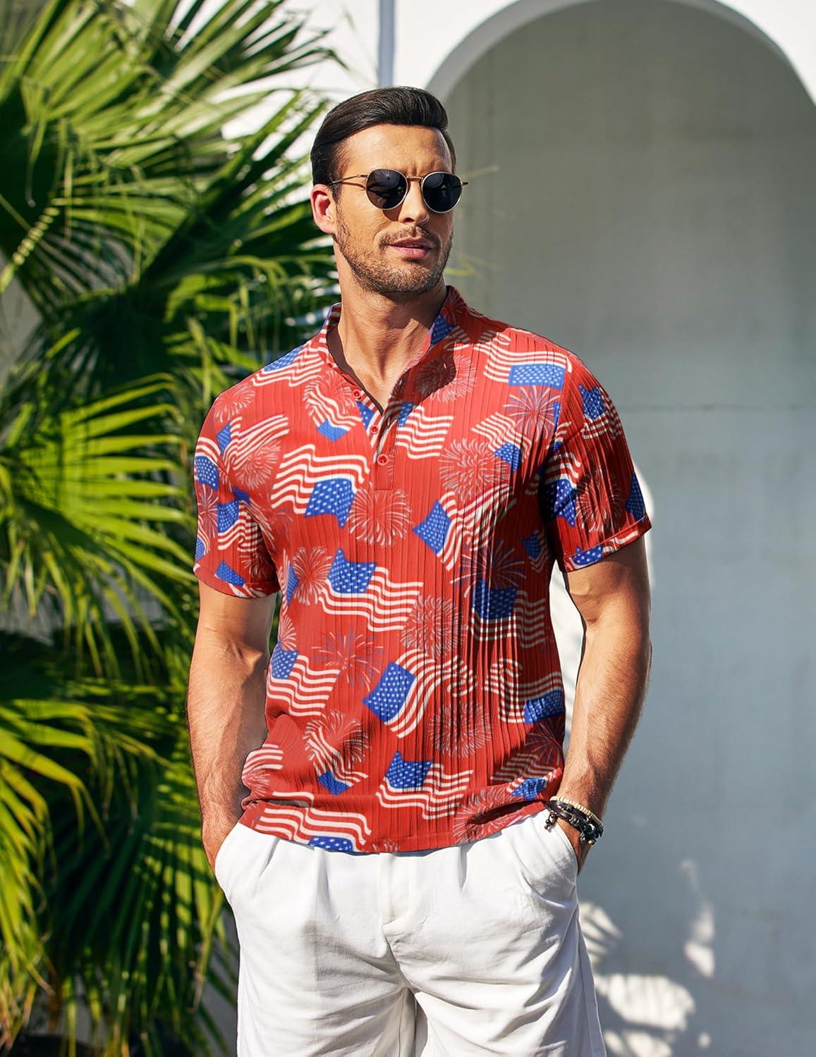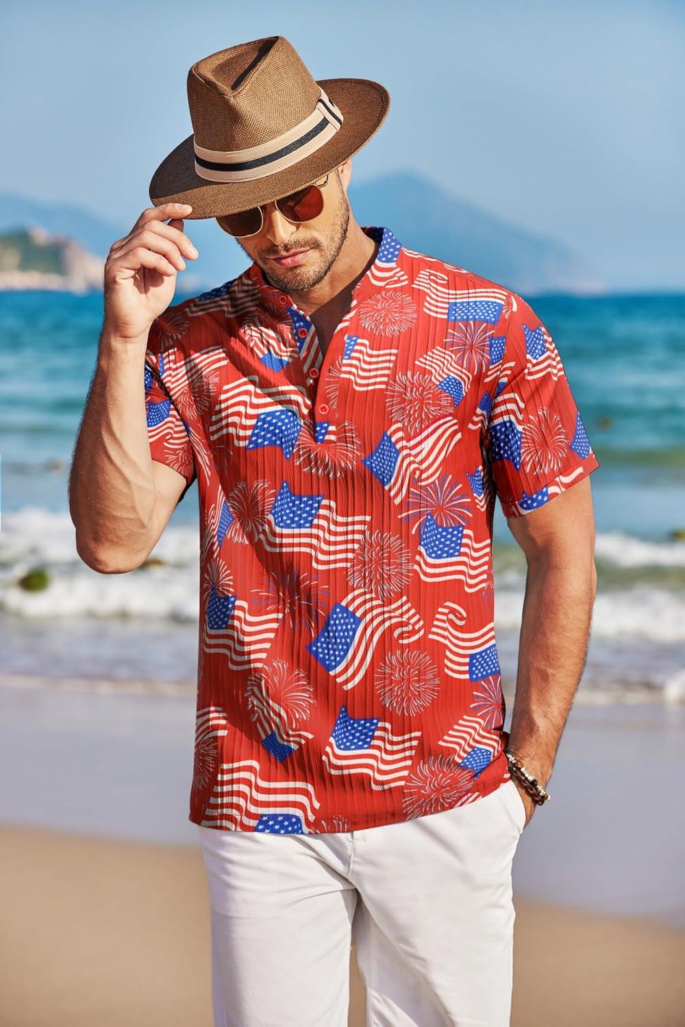 COOFANDY Men Casual Henley Tee Shirt Short Sleeve Band Collar Summer Beach Textured T-Shirt(Red Flag)