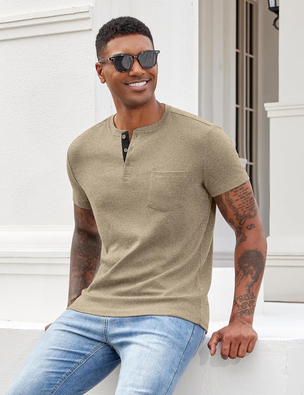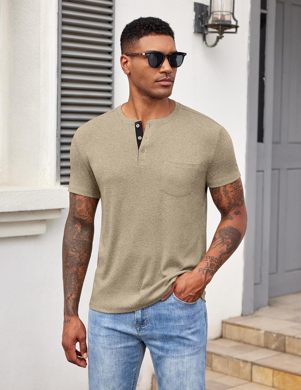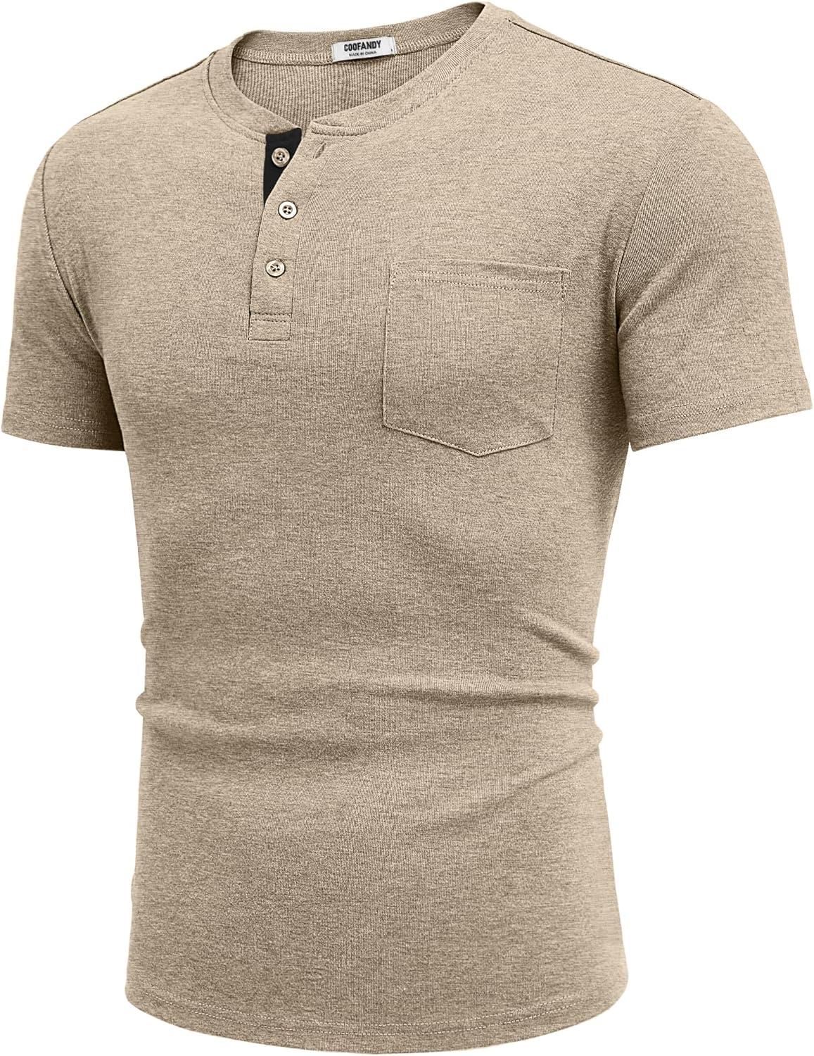 COOFANDY Men Casual Shirt Short Sleeve Summer Basic T Shirt Pocket Soild Tee Top(Khaki)