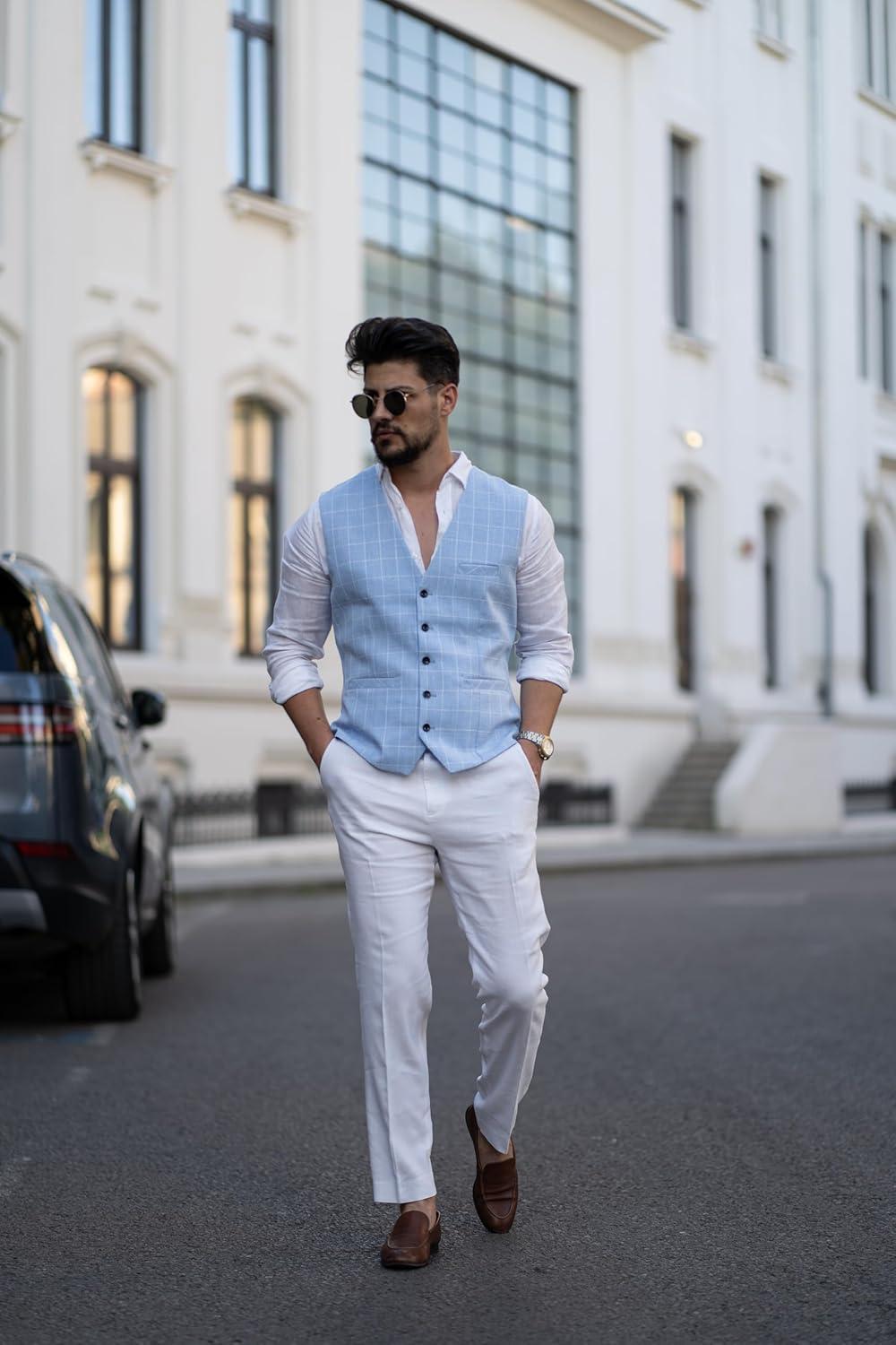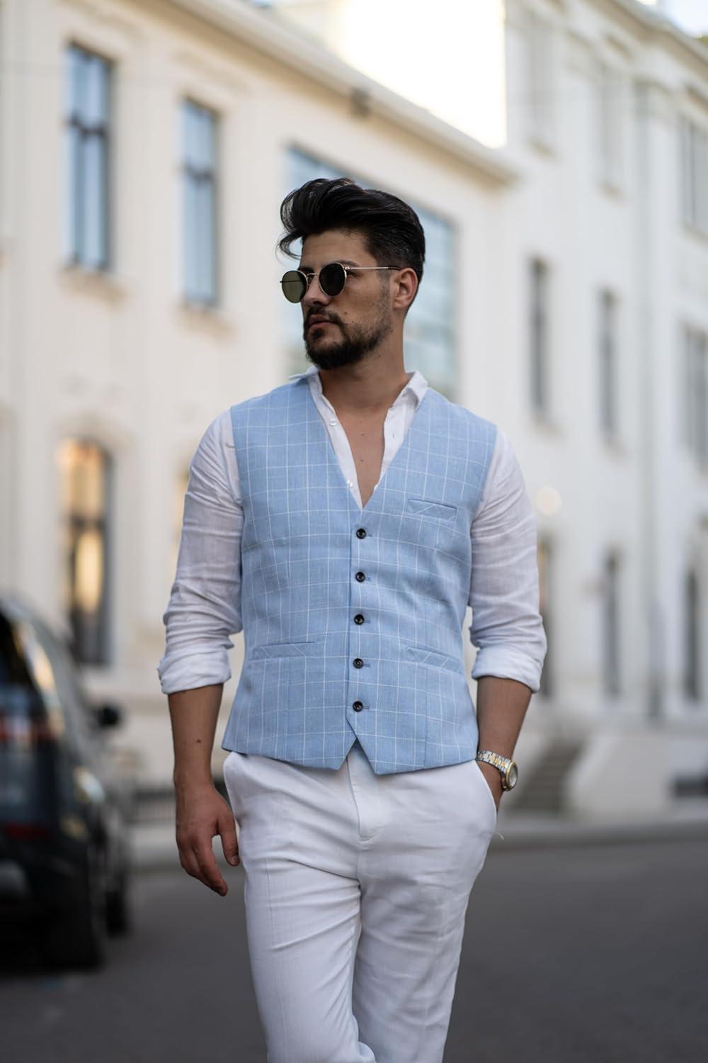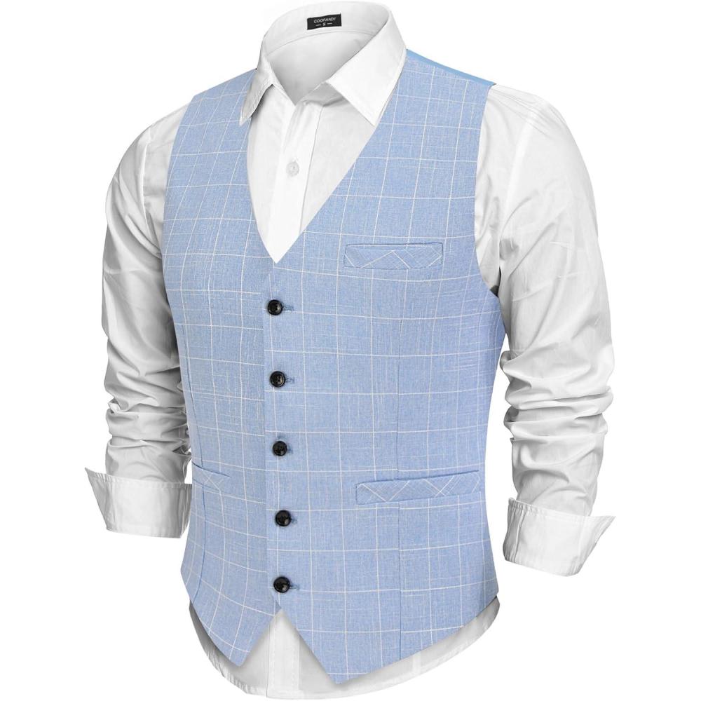 imageCOOFANDY Men Casual Suit Vest Formal Dress Vest Slim Fit Waistcoat Business WeddingPlaid Blazer Sky Blue