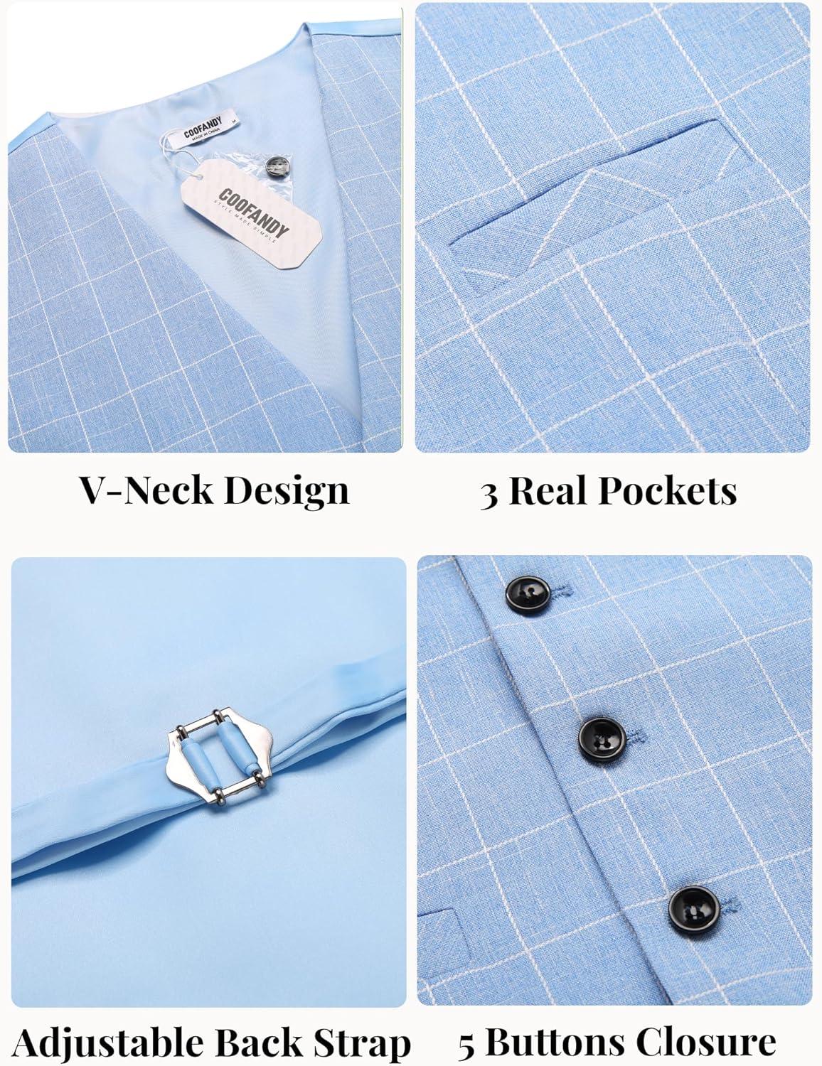 COOFANDY Men Casual Suit Vest Formal Dress Vest Slim Fit Waistcoat Business Wedding(Plaid Blazer- Sky Blue)