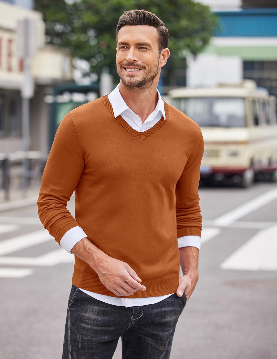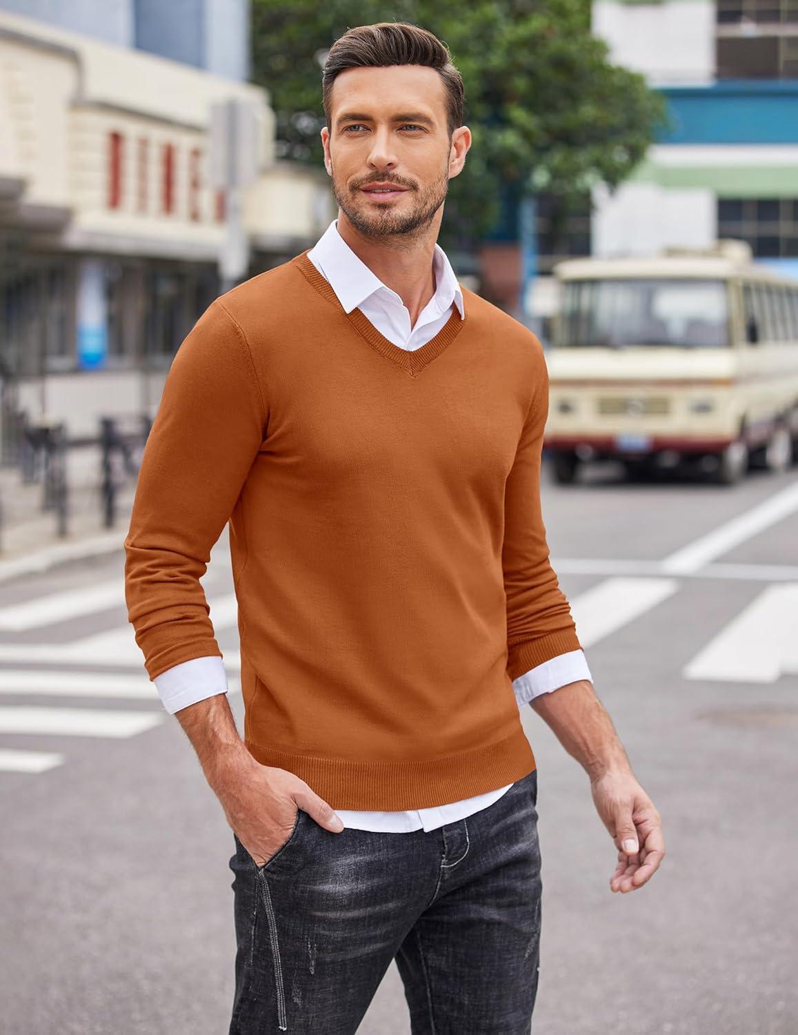Get the COOFANDY Men Casual V Neck Sweater Ribbed Knit Slim Fit Long Sleeve Pullover Top(Brown) you want at a price you can afford with our markdown sale.