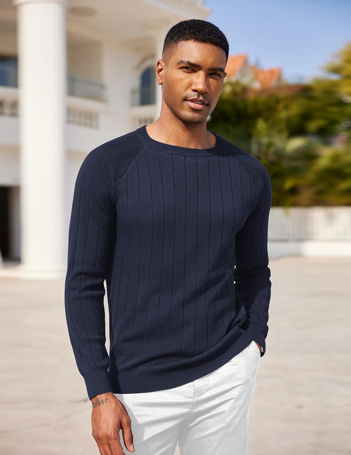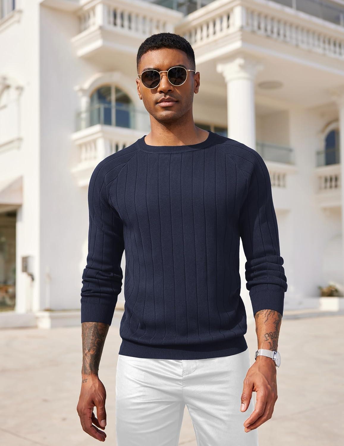 imageCOOFANDY Men Dress Sweater Long Sleeve Crew Neck Sweater Slim Fit Business Casual Pullover SweaterDark Bluenarrow Ribs