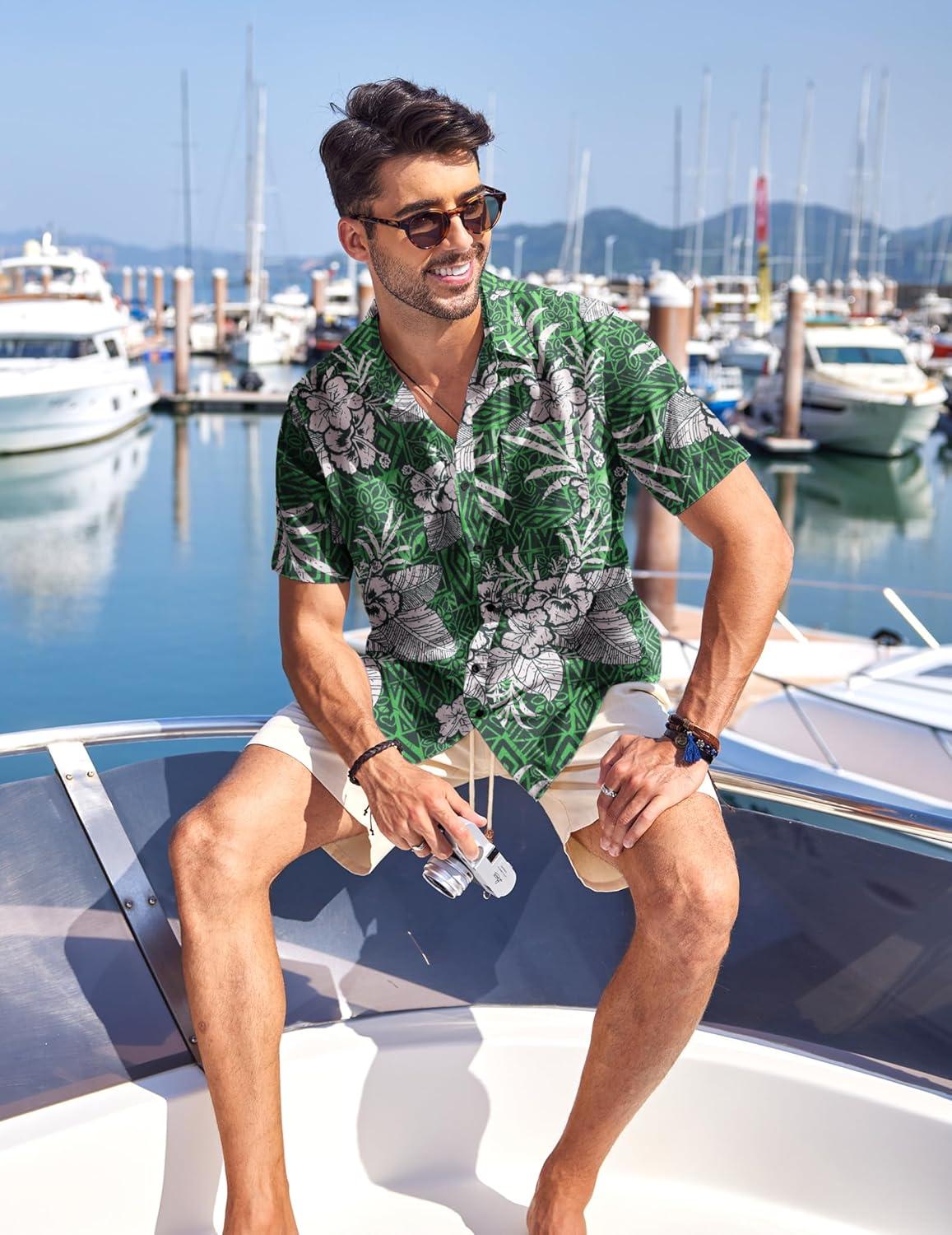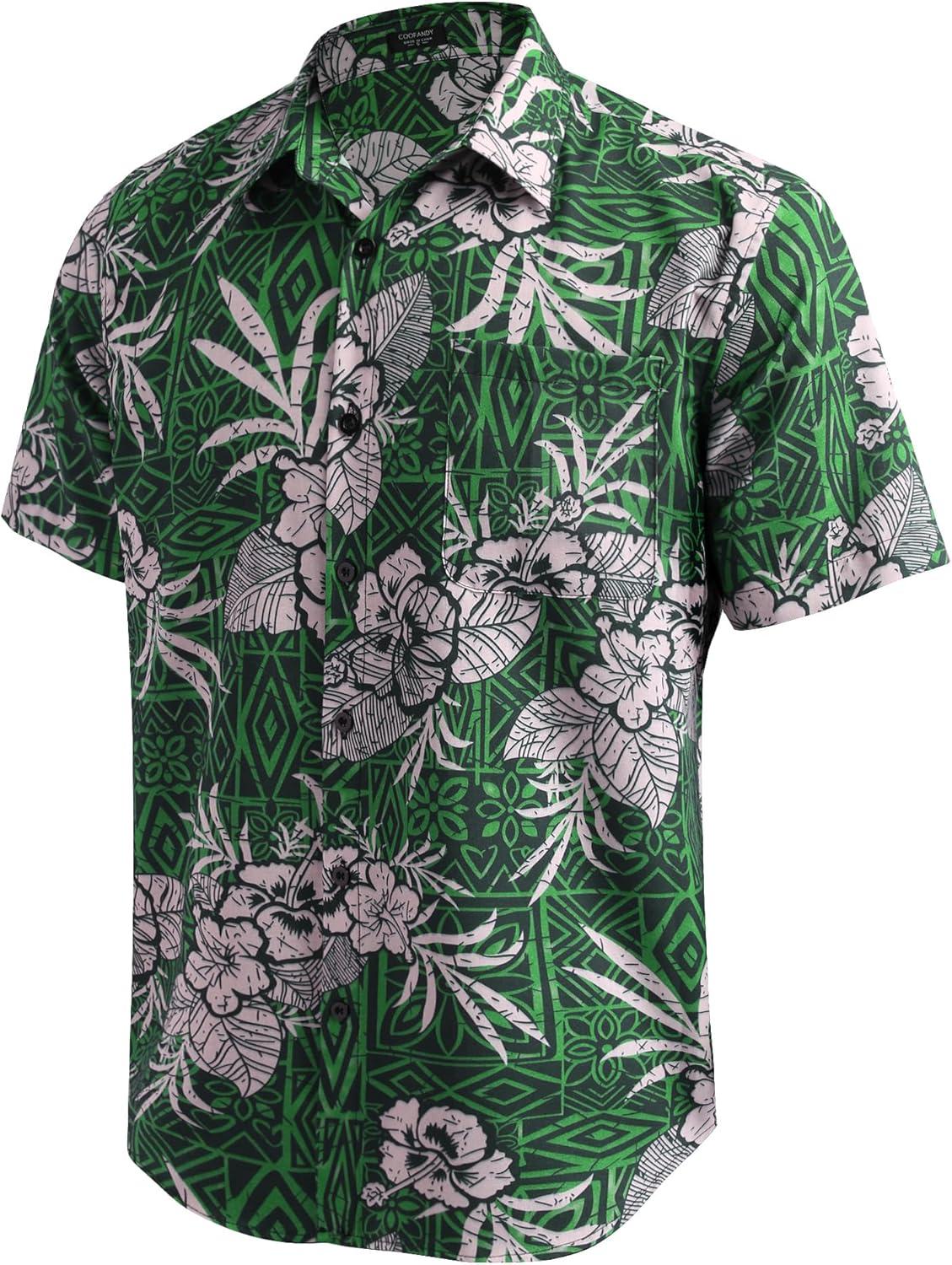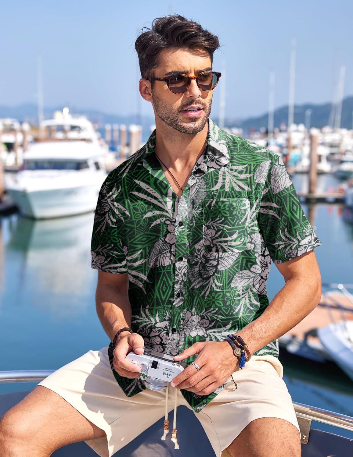 COOFANDY Men Hawaiian Tropical Shirt Button Down Short Sleeve Vintage Floral Shirt Green/White