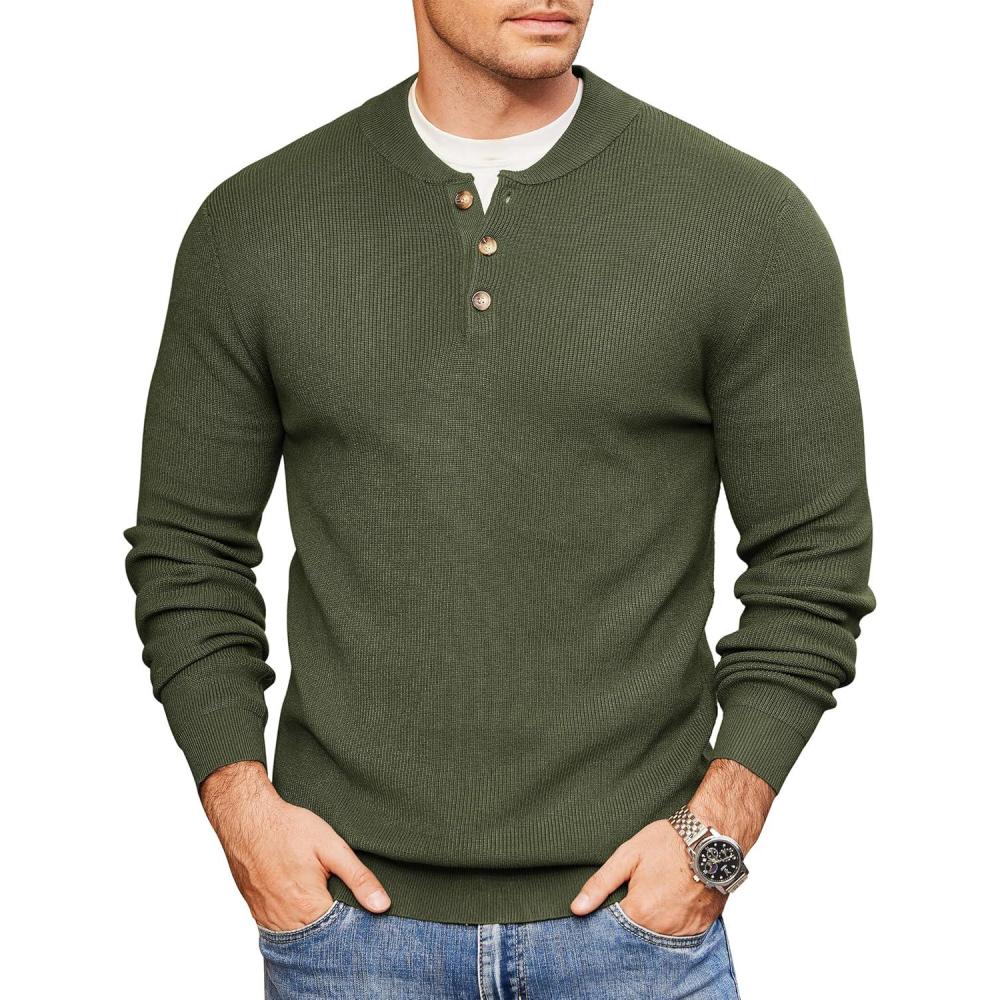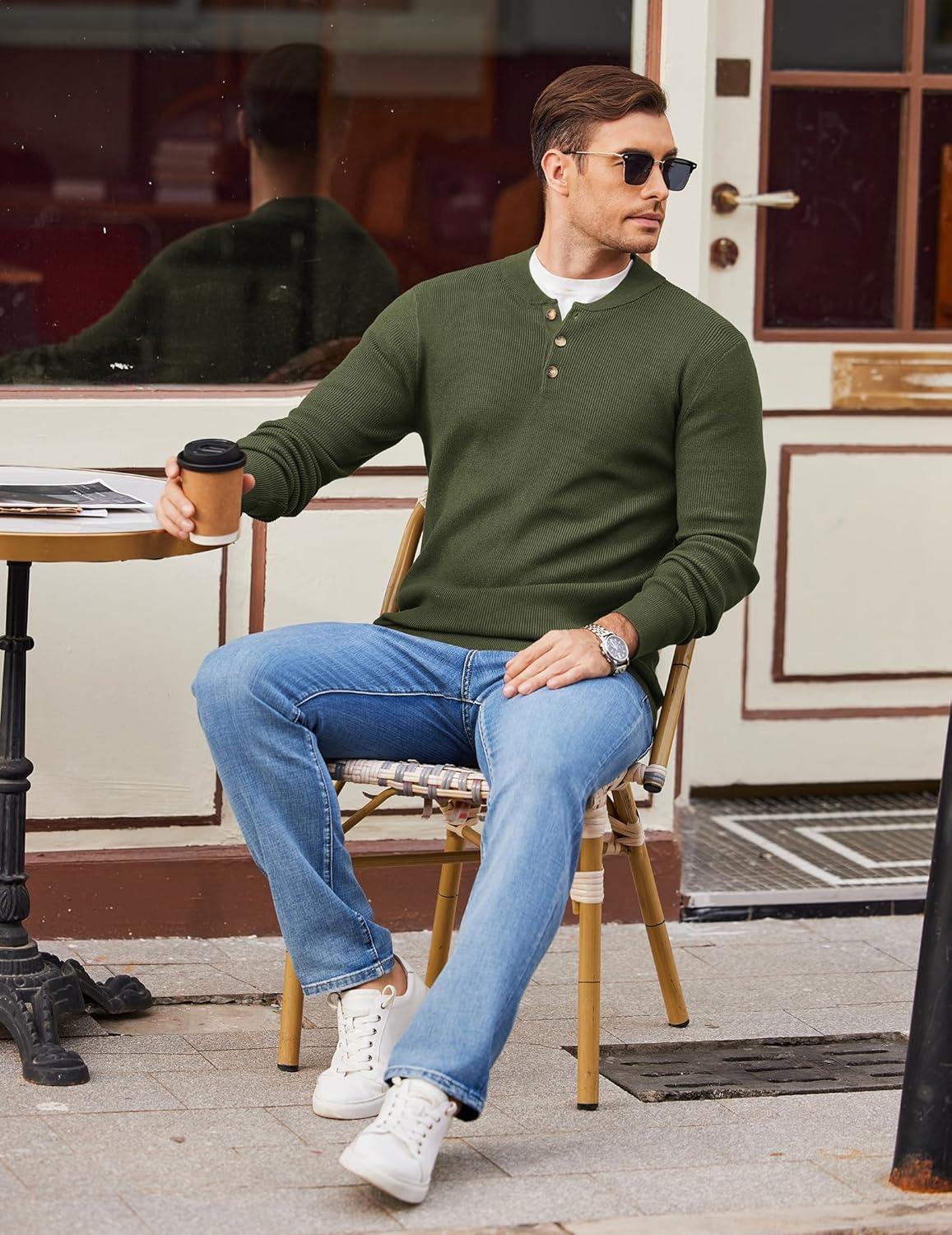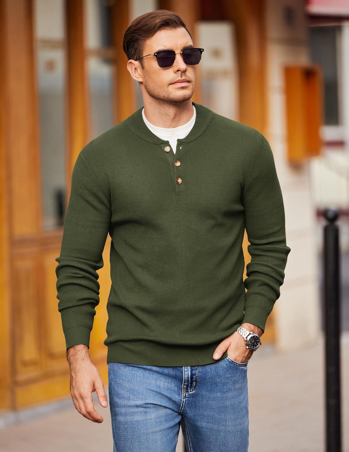 COOFANDY Men Henley Knit Sweater Dress Long Sleeve Button Pullover Sweater Casual Sweater Lightweight Slim Fit Tops(Army Green)
