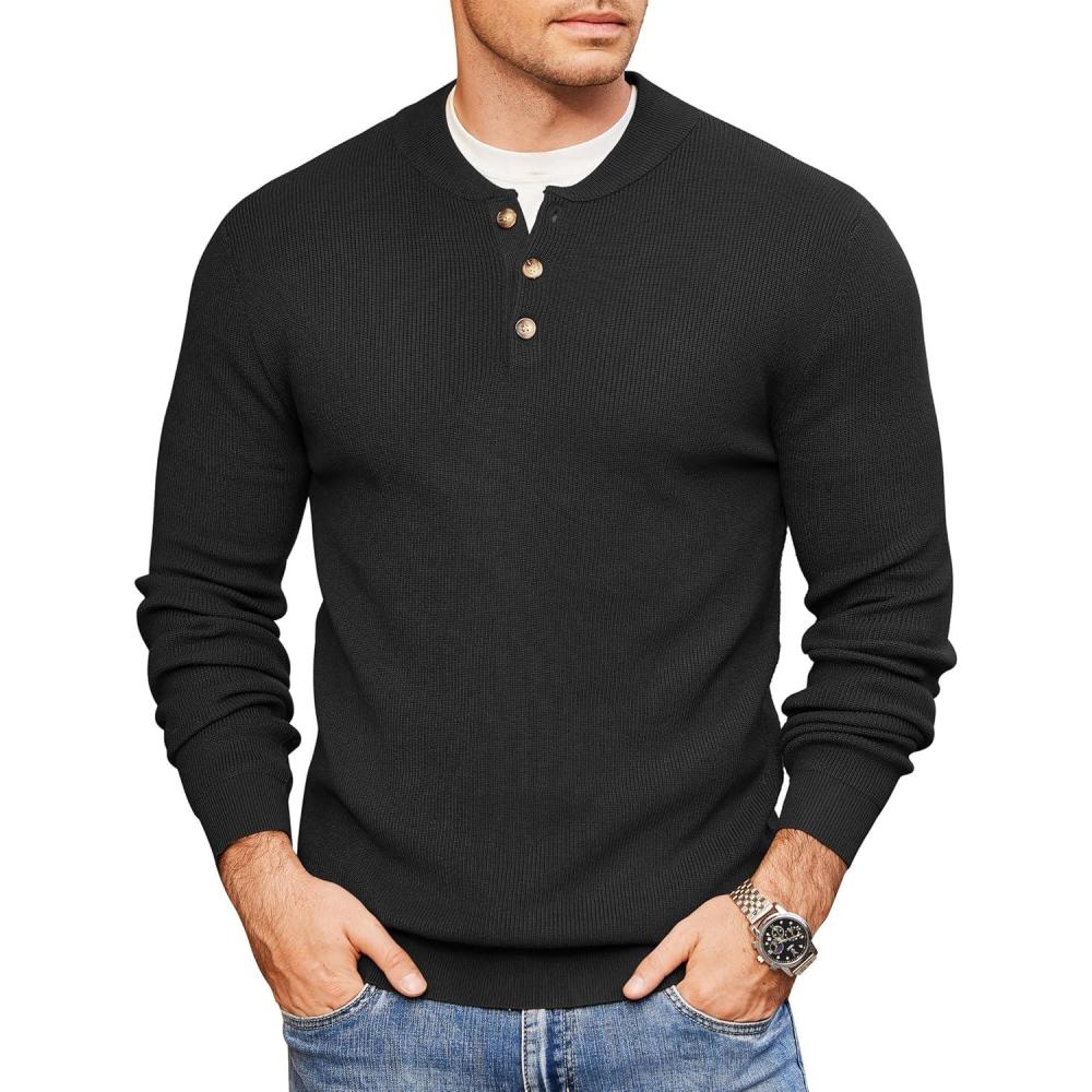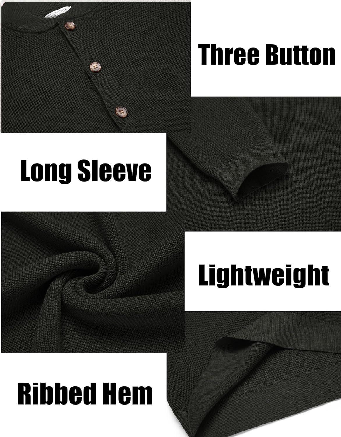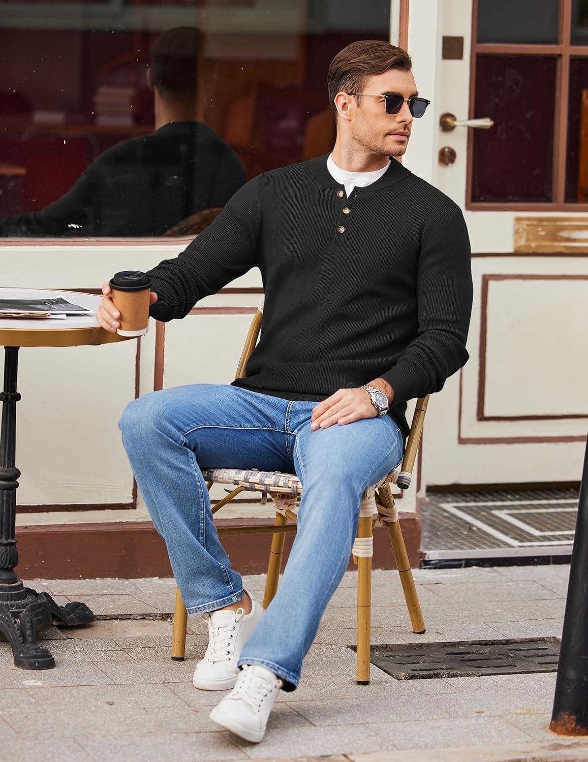 COOFANDY Men Henley Knit Sweater Dress Long Sleeve Button Pullover Sweater Casual Sweater Lightweight Slim Fit Tops(Black)