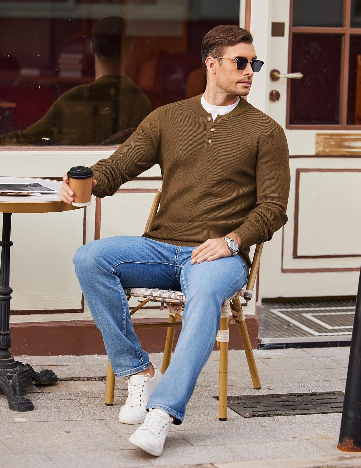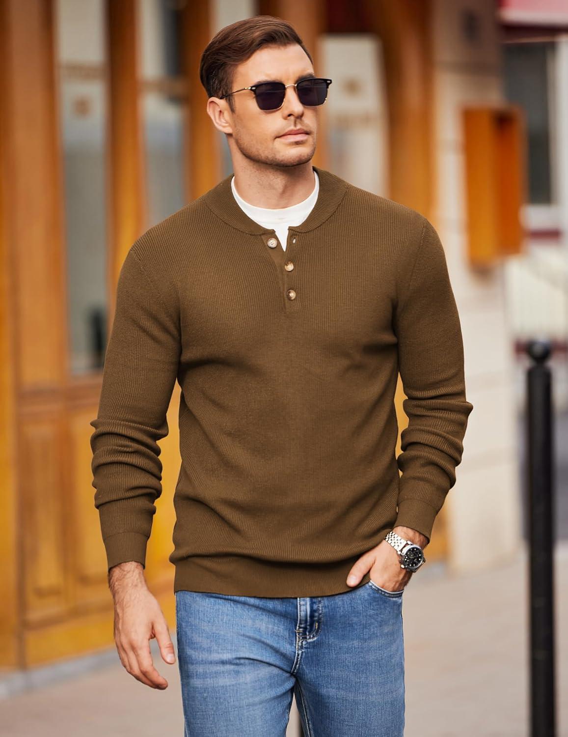 COOFANDY Men Henley Knit Sweater Dress Long Sleeve Button Pullover Sweater Casual Sweater Lightweight Slim Fit Tops(Brown)