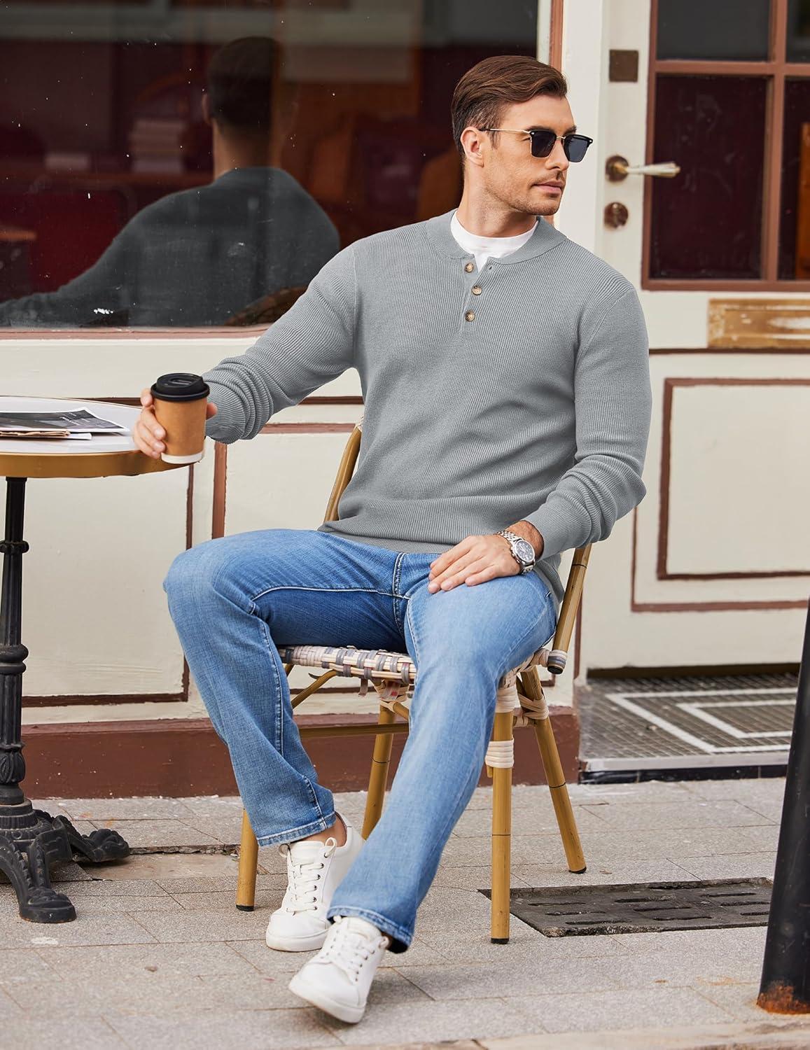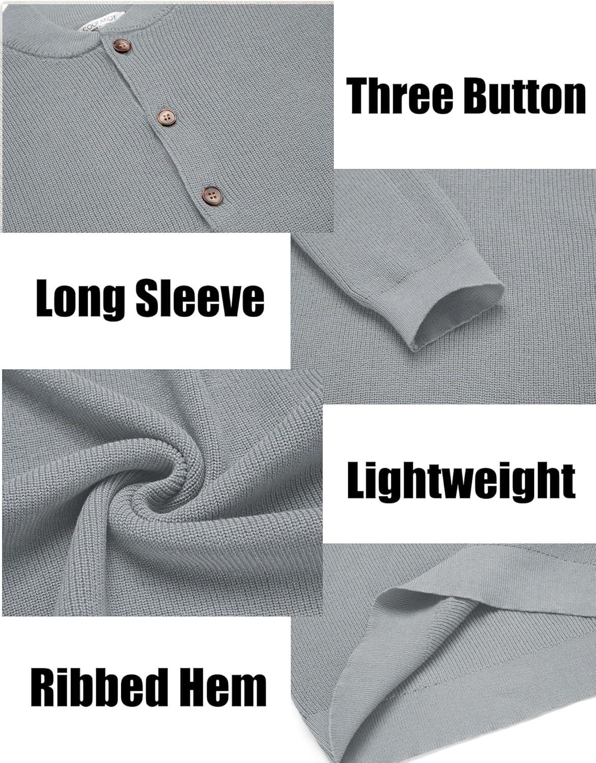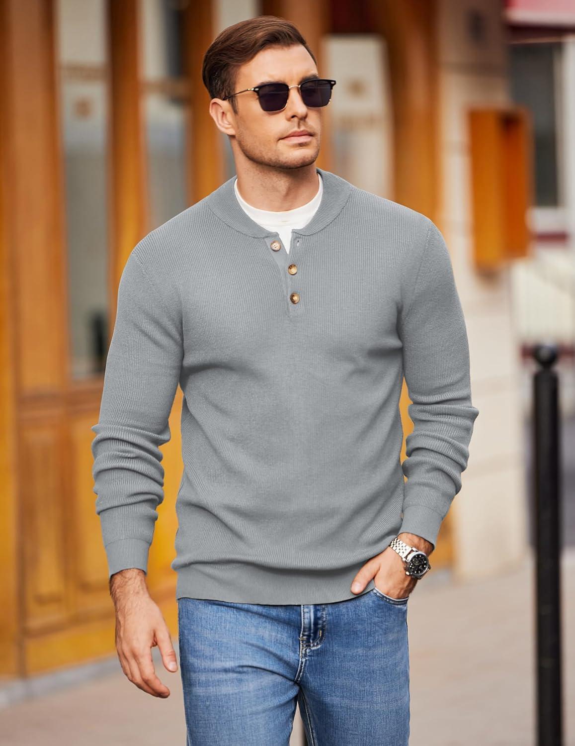 COOFANDY Men Henley Knit Sweater Dress Long Sleeve Button Pullover Sweater Casual Sweater Lightweight Slim Fit Tops(Light Grey)