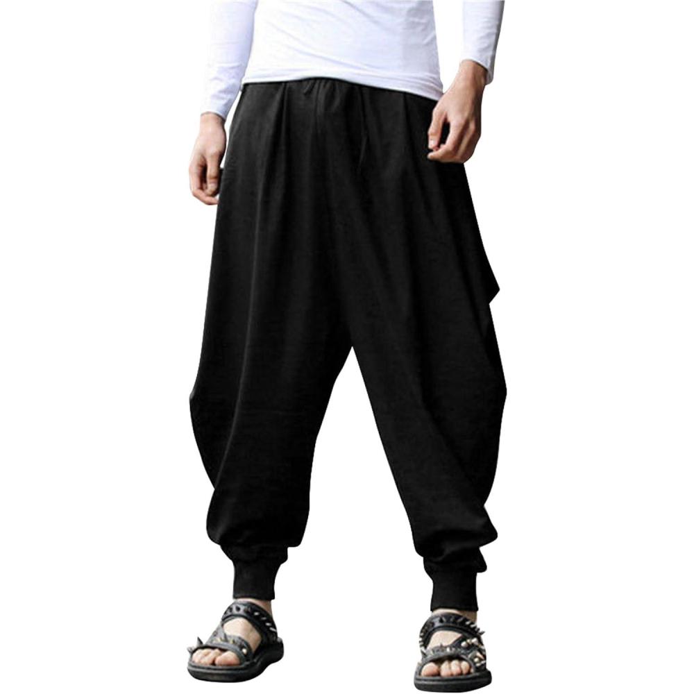 COOFANDY Men Hippie Harem Pants Baggy Linen Cotton Boho Yoga Pants Summer Beach Pants Casual Drop Crotch Trouser(Black)