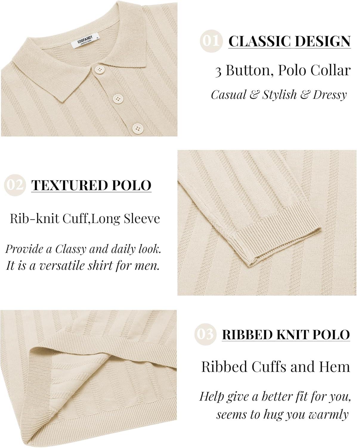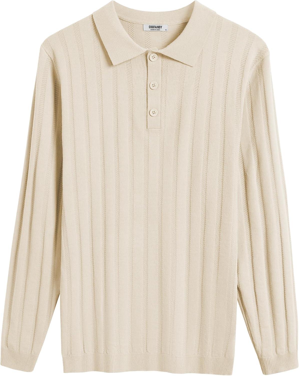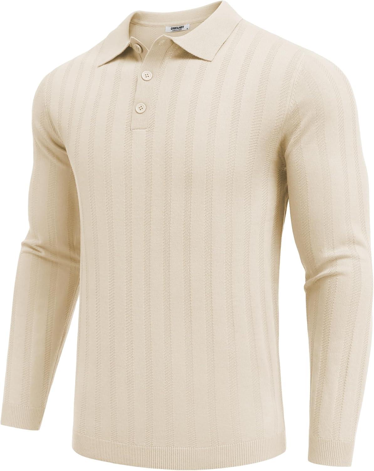 COOFANDY Men Knit Long Sleeve Polo Shirts Casual Dress Collared Sweater Pullover Button Down Golf Polo Shirts(Beige)