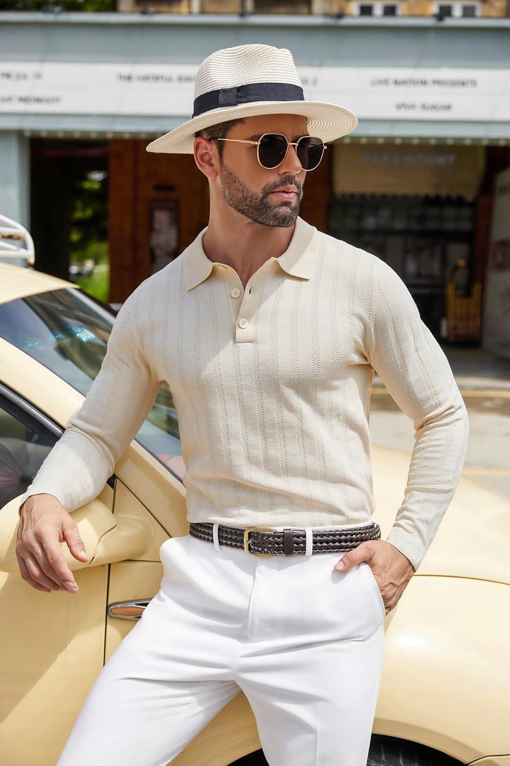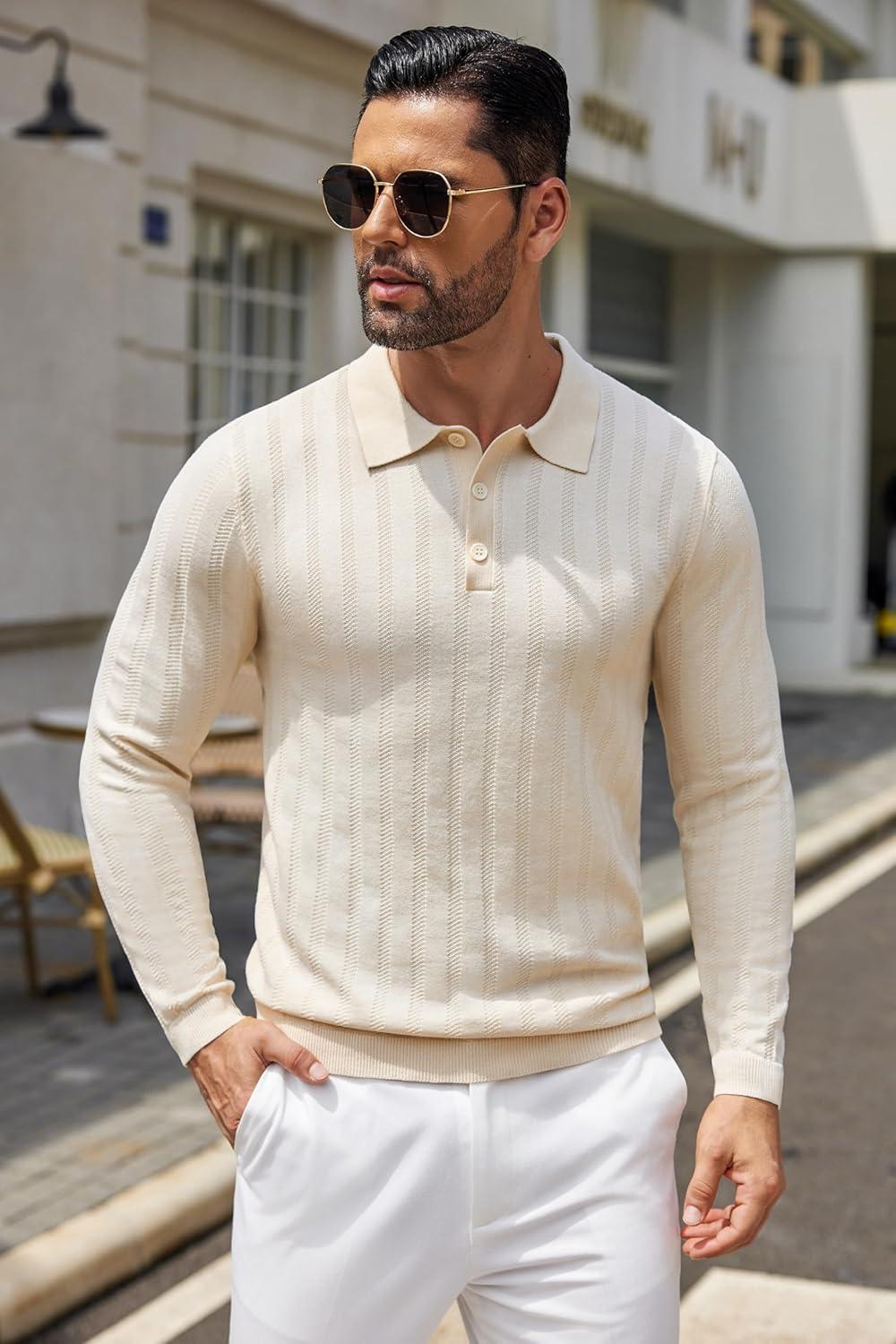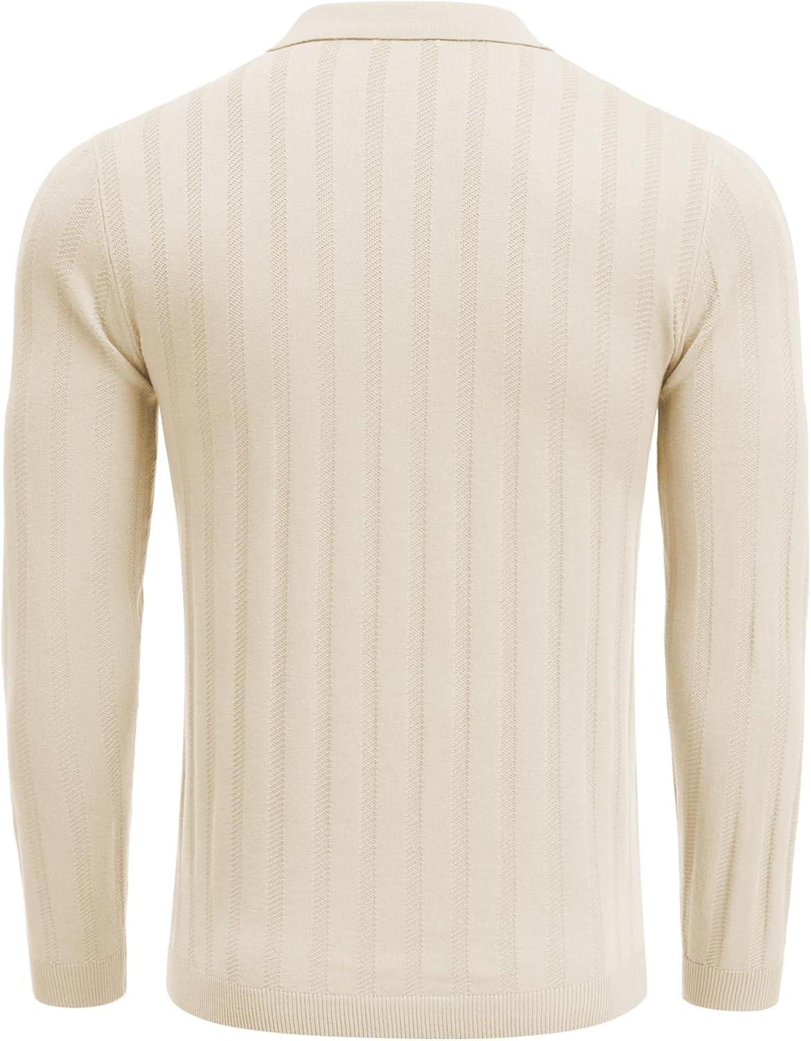 COOFANDY Men Knit Long Sleeve Polo Shirts Casual Dress Collared Sweater Pullover Button Down Golf Polo Shirts(Beige)