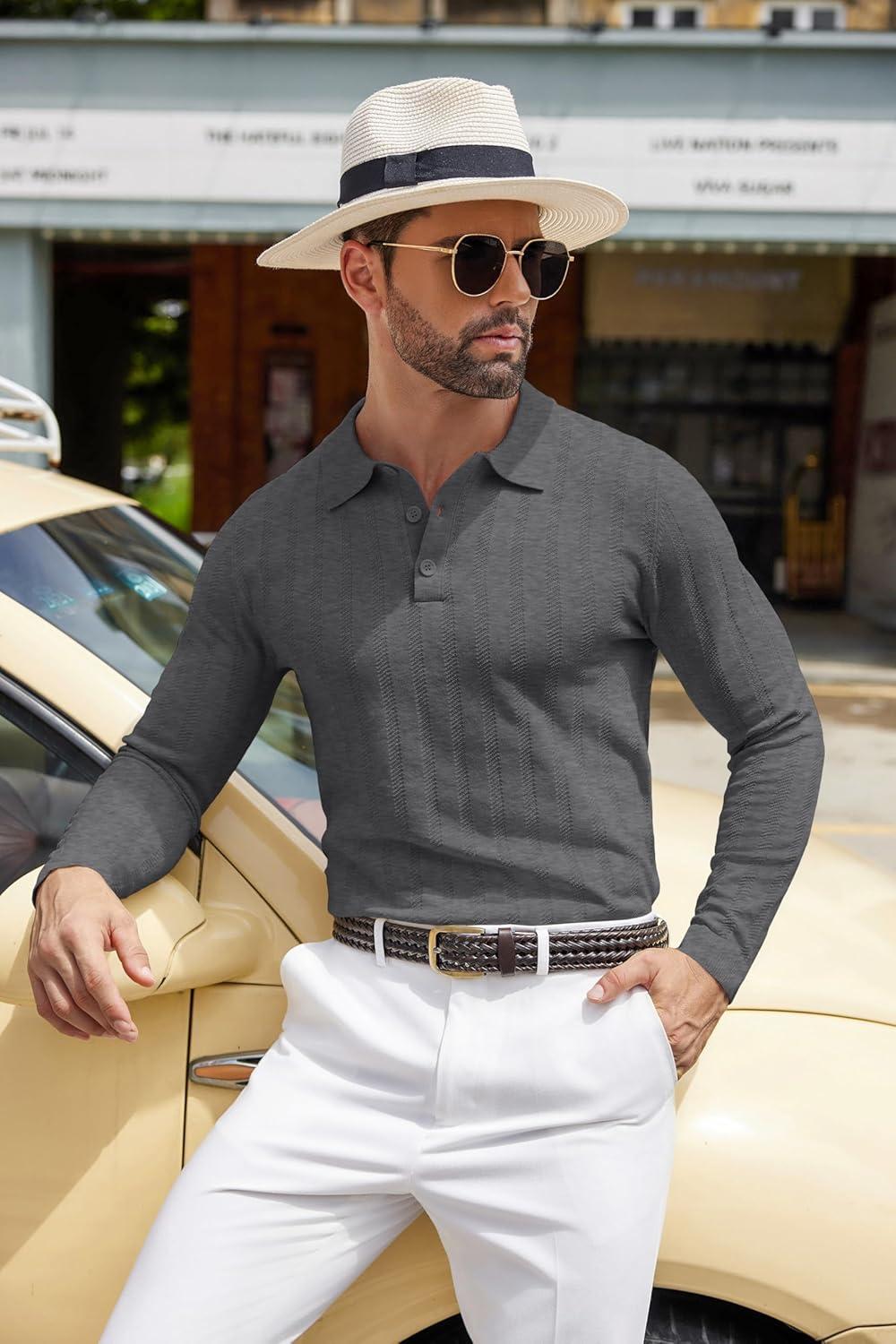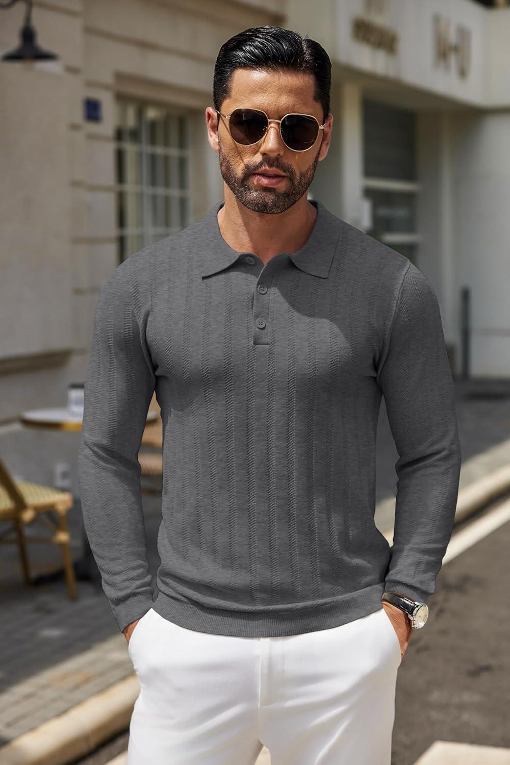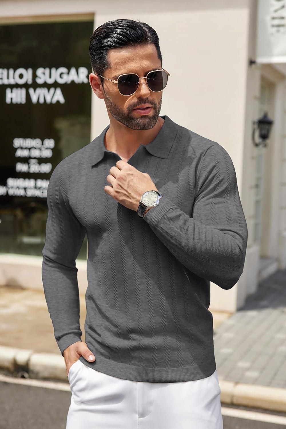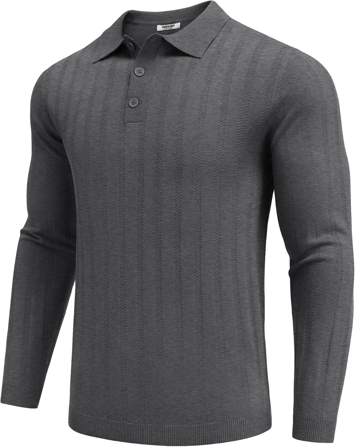COOFANDY Men Knit Long Sleeve Polo Shirts Casual Dress Collared Sweater Pullover Button Down Golf Polo Shirts(Dark Grey)