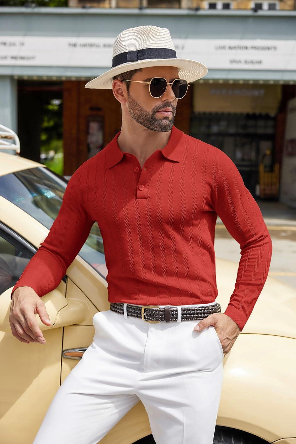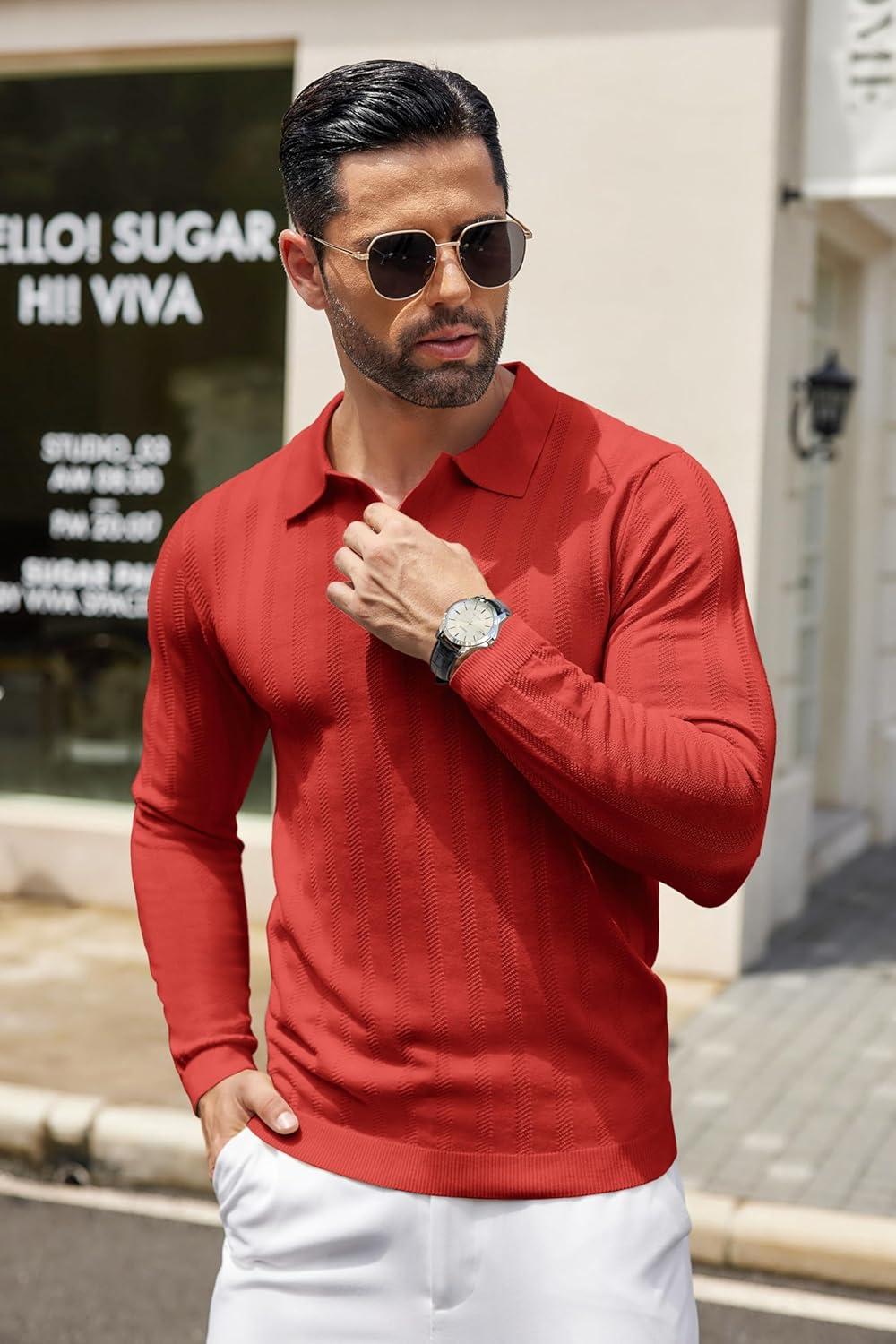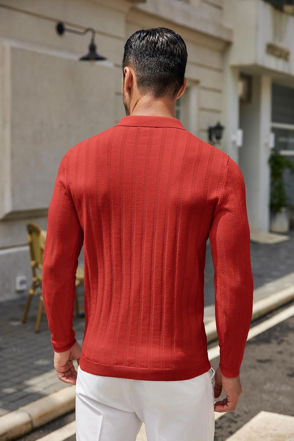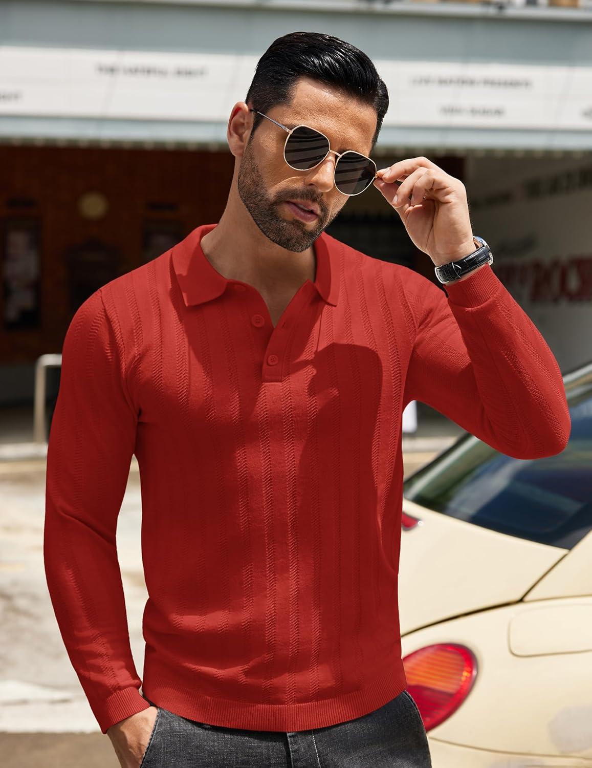COOFANDY Men Knit Long Sleeve Polo Shirts Casual Dress Collared Sweater Pullover Button Down Golf Polo Shirts(Dark Red)