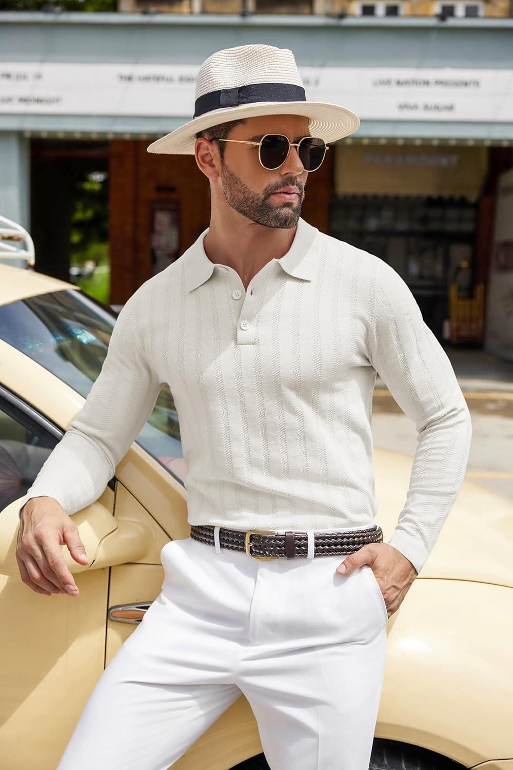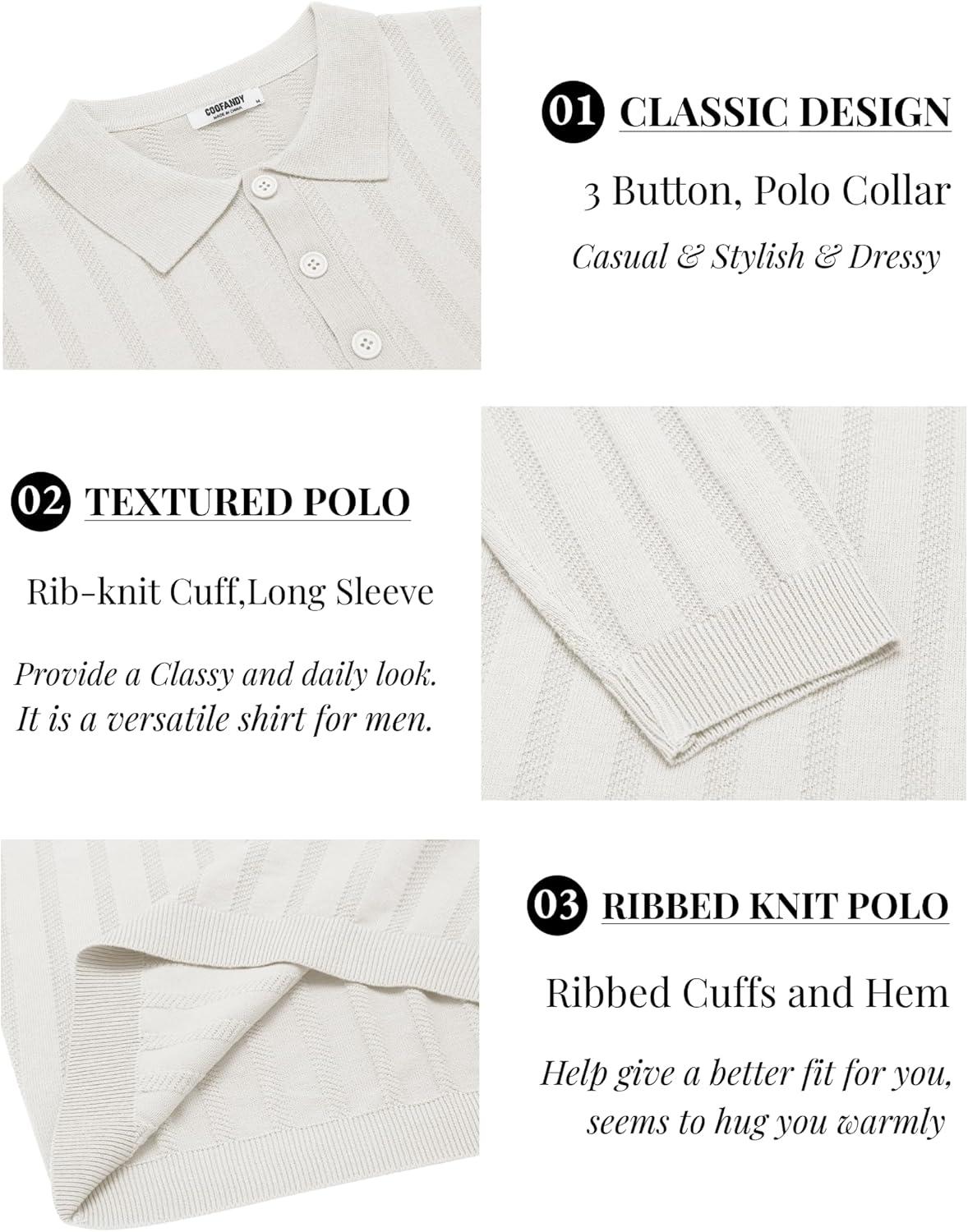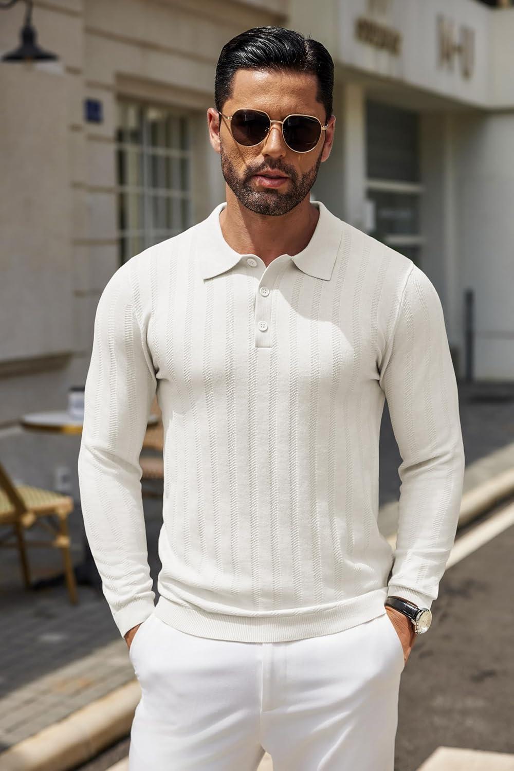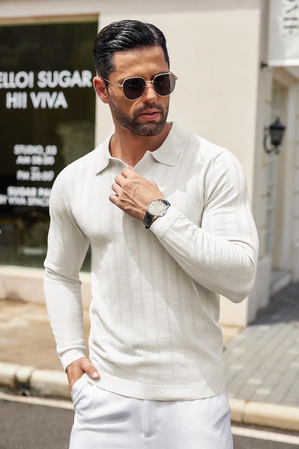 COOFANDY Men Knit Long Sleeve Polo Shirts Casual Dress Collared Sweater Pullover Button Down Golf Polo Shirts(White)