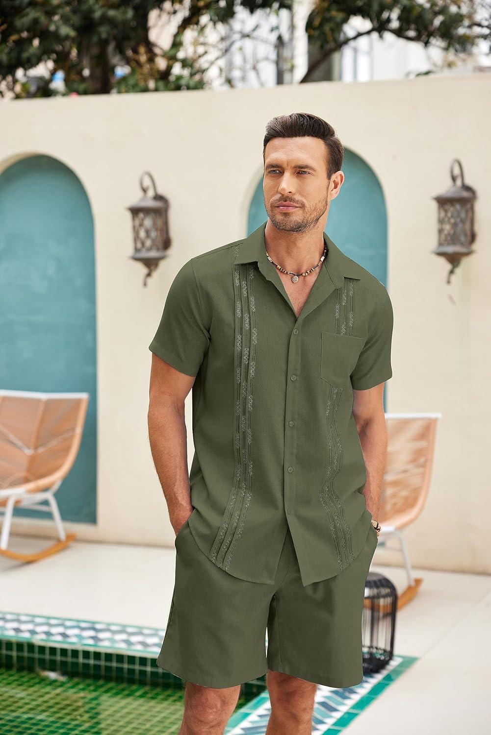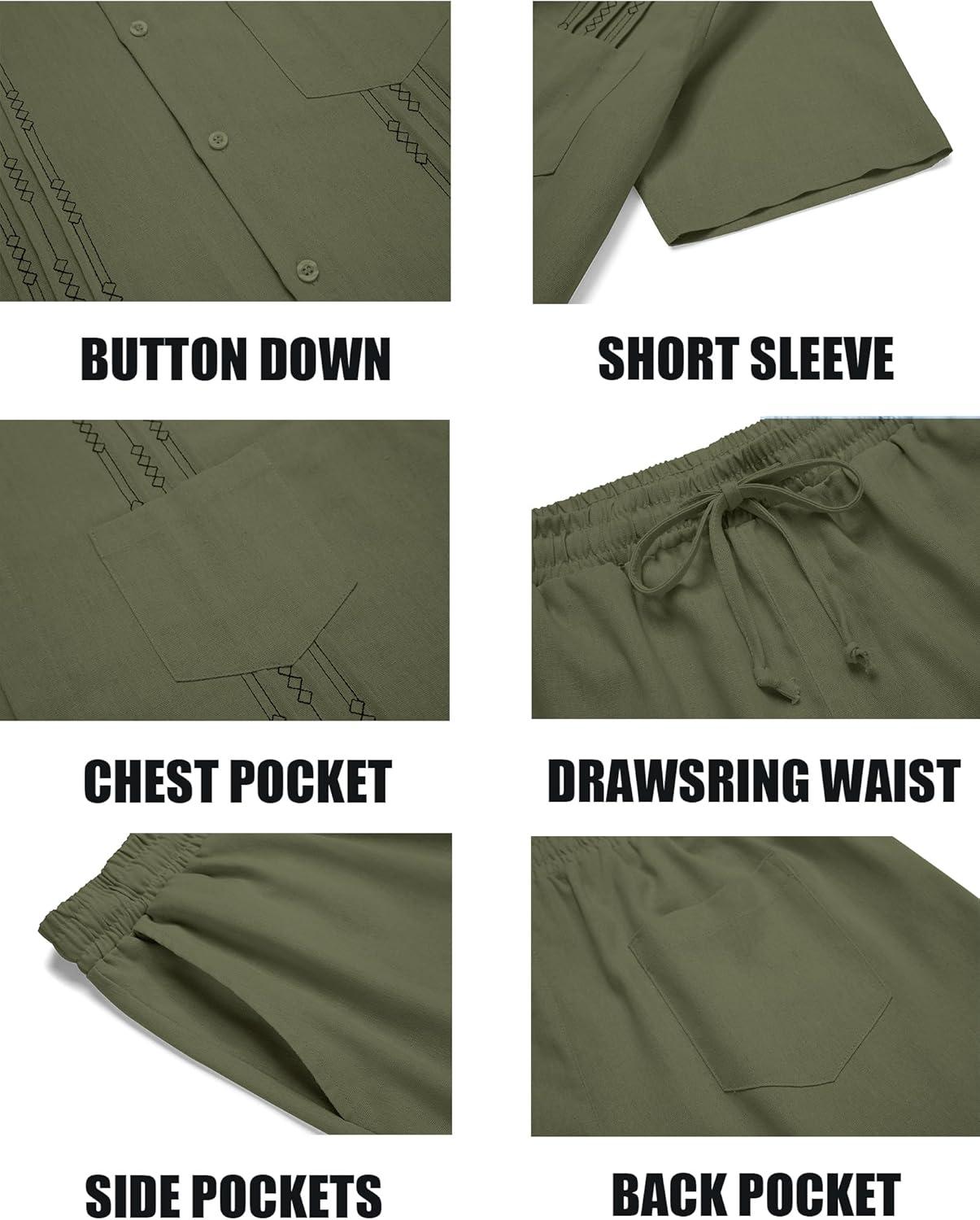 COOFANDY Men Linen Sets Outfits 2 Piece Short Sleeve Cuban Shirts Guayabera Linen Suit(Army Green)