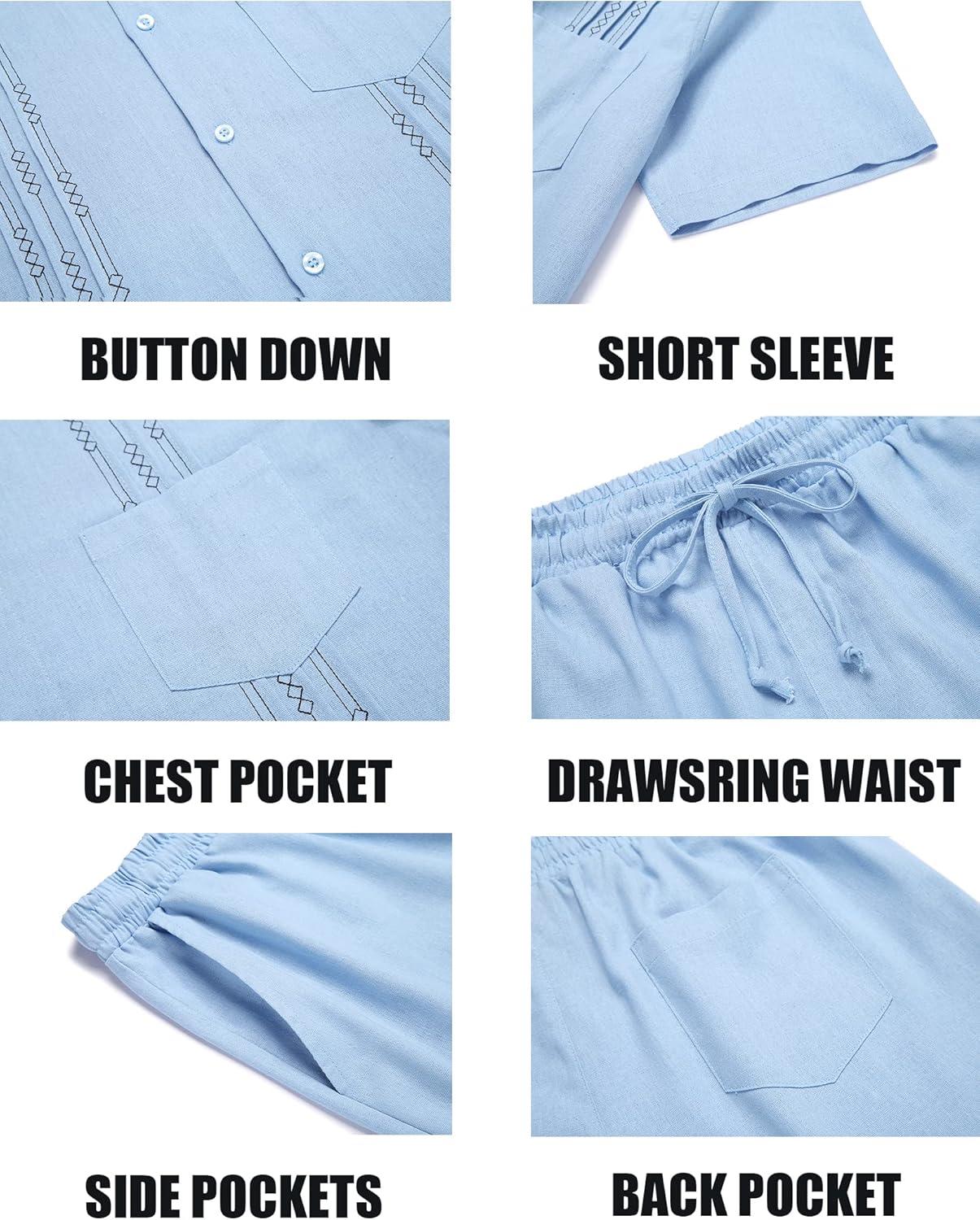 COOFANDY Men Linen Sets Outfits 2 Piece Short Sleeve Cuban Shirts Guayabera Linen Suit(Light Blue)